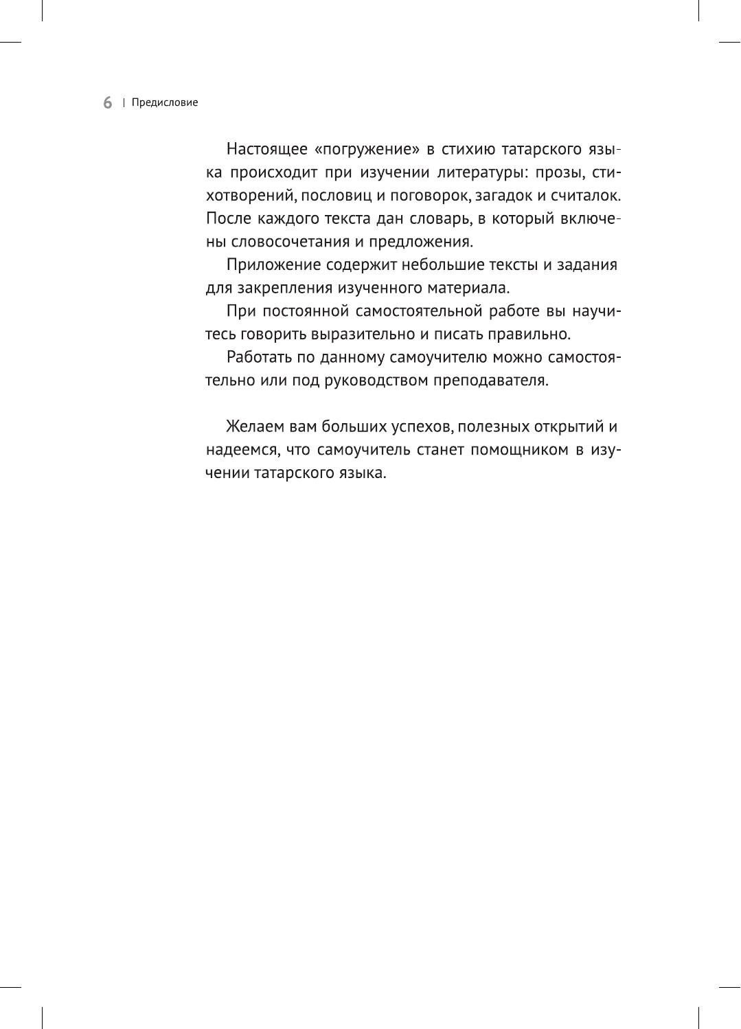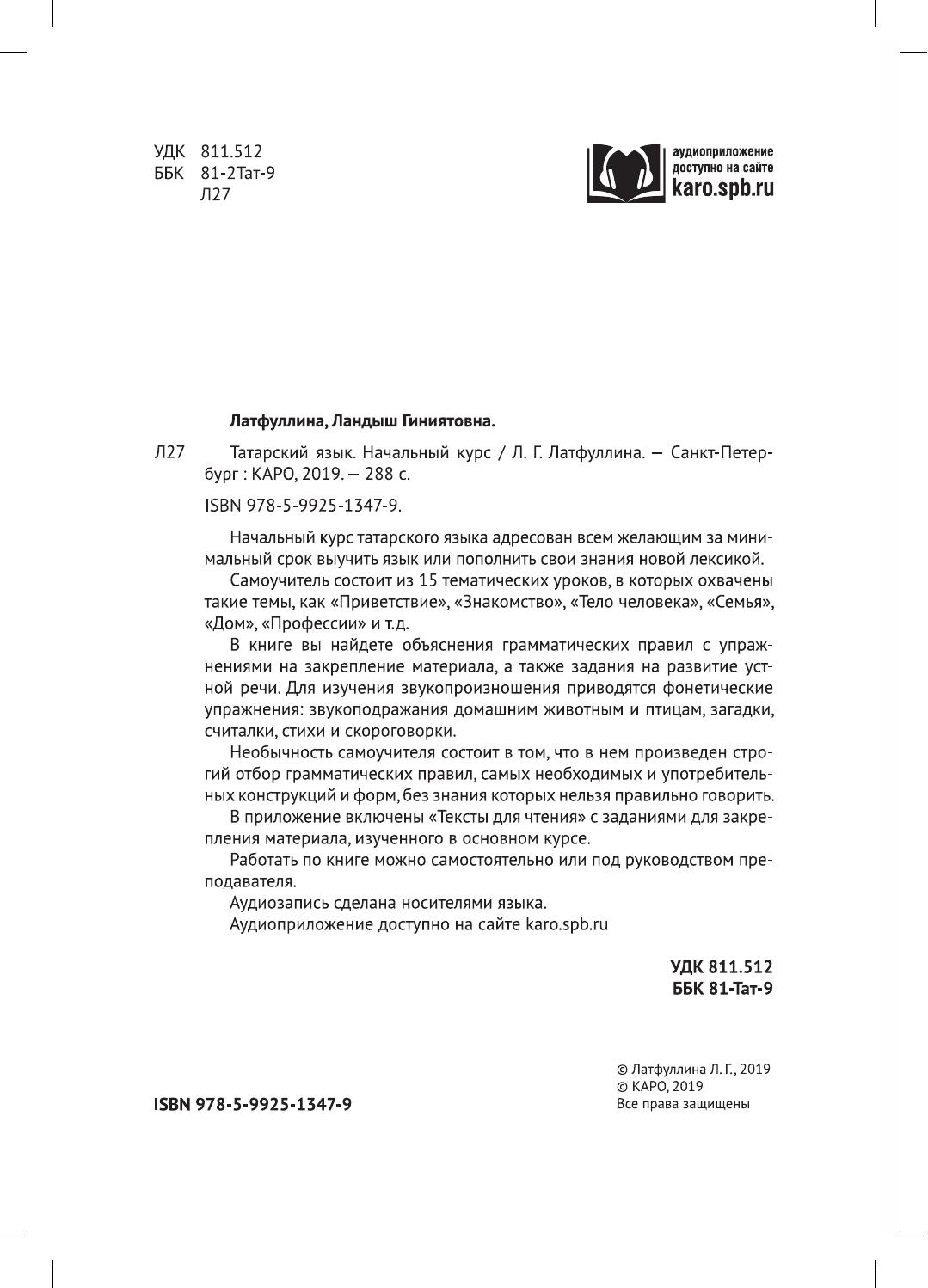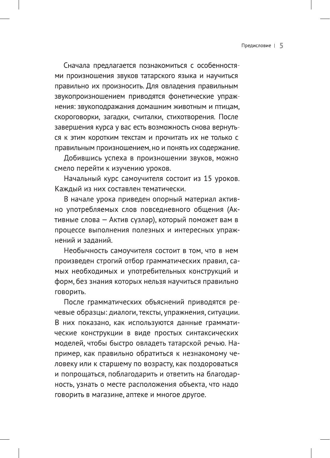 Начальный курс татарского языка адресован всем желающим за минимальный срок выучить язык или пополнить свои знания новой лексикой . Самоучитель состоит из 15 тематических уроков, в которых охвачены такие темы, как "Приветствие", "Знакомство", "Тело человека", "Семья", "Дом", "Профессии" и т.д. В книше вы найдете объяснения грамматических правил с упражнениями на закрепление материала, а так же задания на развитие устной речи. Для изучения звукопроизношения приводятся фонетические упражнения: звукоподражания домашним животным и птицам, загадки, считалки, стихи и скороговорки. Необычность самоучителя состоит в том, что в нем произведен строгий отбор грамматических правил, самых необходимых и употребительных конструкций и форм, без знания которых нельзя правильно говорить. В приложение включены "Тексты для чтения" заданиями для закрепления материала, изученного в основном курсе. Работать по книге можно самостоятельно или под руководством преподавателя.