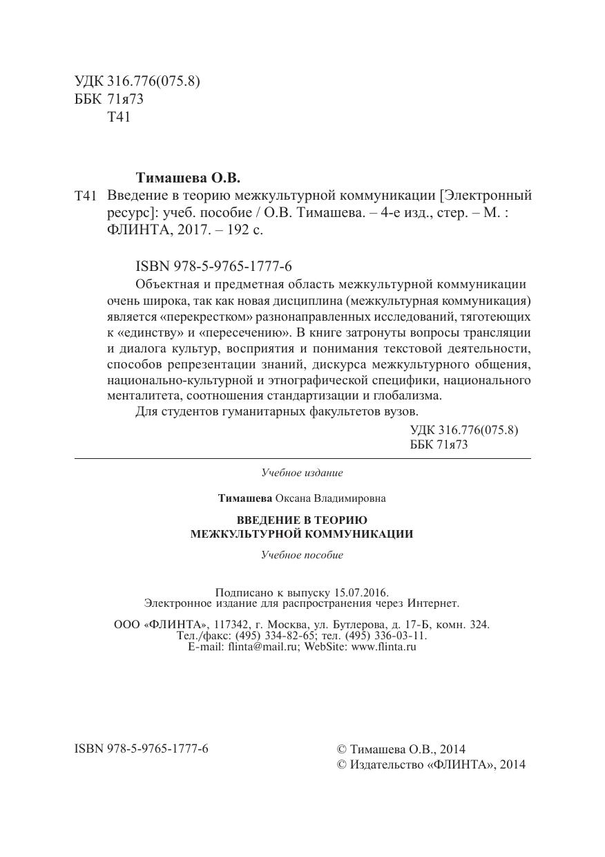 Объектная и предметная область межкультурной коммуникации очень широка, так как новая дисциплина (межкультурная коммуникация) является «перекрестком» разнонаправленных исследований, тяготеющих к «единству» и «пересечению». В книге затронуты вопросы трансляции и диалога культур, восприятия и понимания текстовой деятельности, способов репрезентации знаний, дискурса межкультурного общения, национально-культурной и этнографической специфики, национального менталитета, соотношения стандартизации и глобализма.