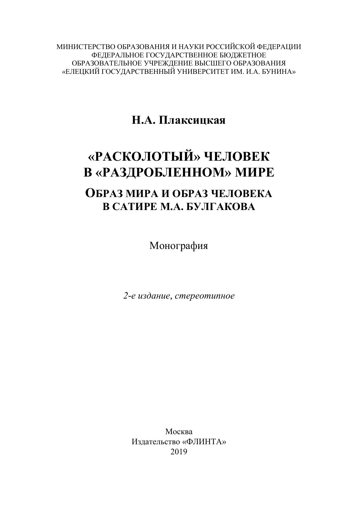 «Расколотый» человек в «раздробленном» мире: образ мира и образ человека в сатире М.А. Булгакова: монография