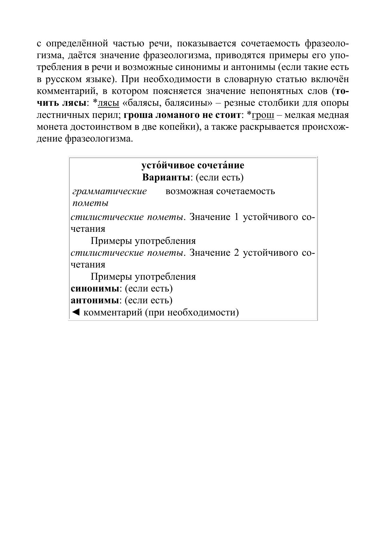 Словарь содержит описание 250 наиболее употребительных фразеологизмов русского языка. Словарные статьи даны в алфавитном порядке. Помимо заголовочной фразы и её толкования, даются грамматические пометы, показана сочетаемость устойчивых сочетаний в русском языке, приводятся примеры употребления в живой разговорной речи, а также возможные синонимические и антонимические ряды. При необходимости фразеологизмы сопровождаются комментарием, в котором раскрывается значение трудных для понимания слов, поясняется происхождение фразеологизма.