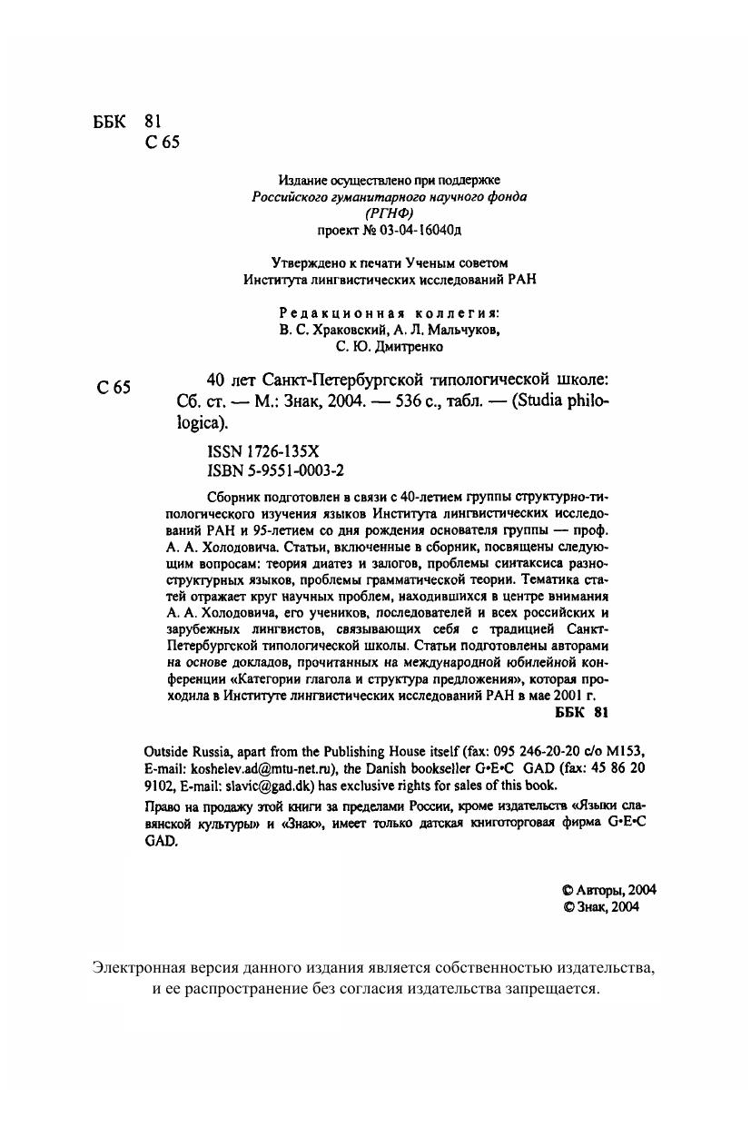 Сборник подготовлен в связи с 40-летием группы структурно-типологического изучения языков Института лингвистических исследований РАН и 95-летием со дня рождения основателя группы - проф. А. А. Холодовича. Статьи, включенные в сборник, посвящены следующим вопросам: теория диатез и залогов, проблемы синтаксиса разноструктурных языков, проблемы грамматической теории. Тематика статей отражает круг научных проблем, находившихся в центре внимания А. А. Холодовича, его учеников, последователей и всех российских и зарубежных лингвистов, связывающих себя с традицией СанктПетербургской типологической школы. Статьи подготовлены авторами на основе докладов, прочитанных на международной юбилейной конференции «Категории глагола и структура предложения», которая проходила в Институте лингвистических исследований РАН в мае 2001 г.