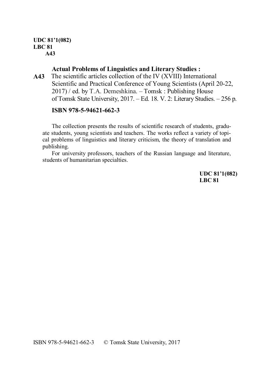 В сборнике представлены результаты научных исследований студентов, аспирантов, молодых ученых и преподавателей. Работы отражают многообразие актуальных проблем лингвистики и литературоведения, теории перевода и издательского дела. Для преподавателей вузов, учителей русского языка и литературы, студентов гуманитарных специальностей.