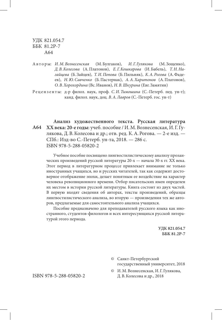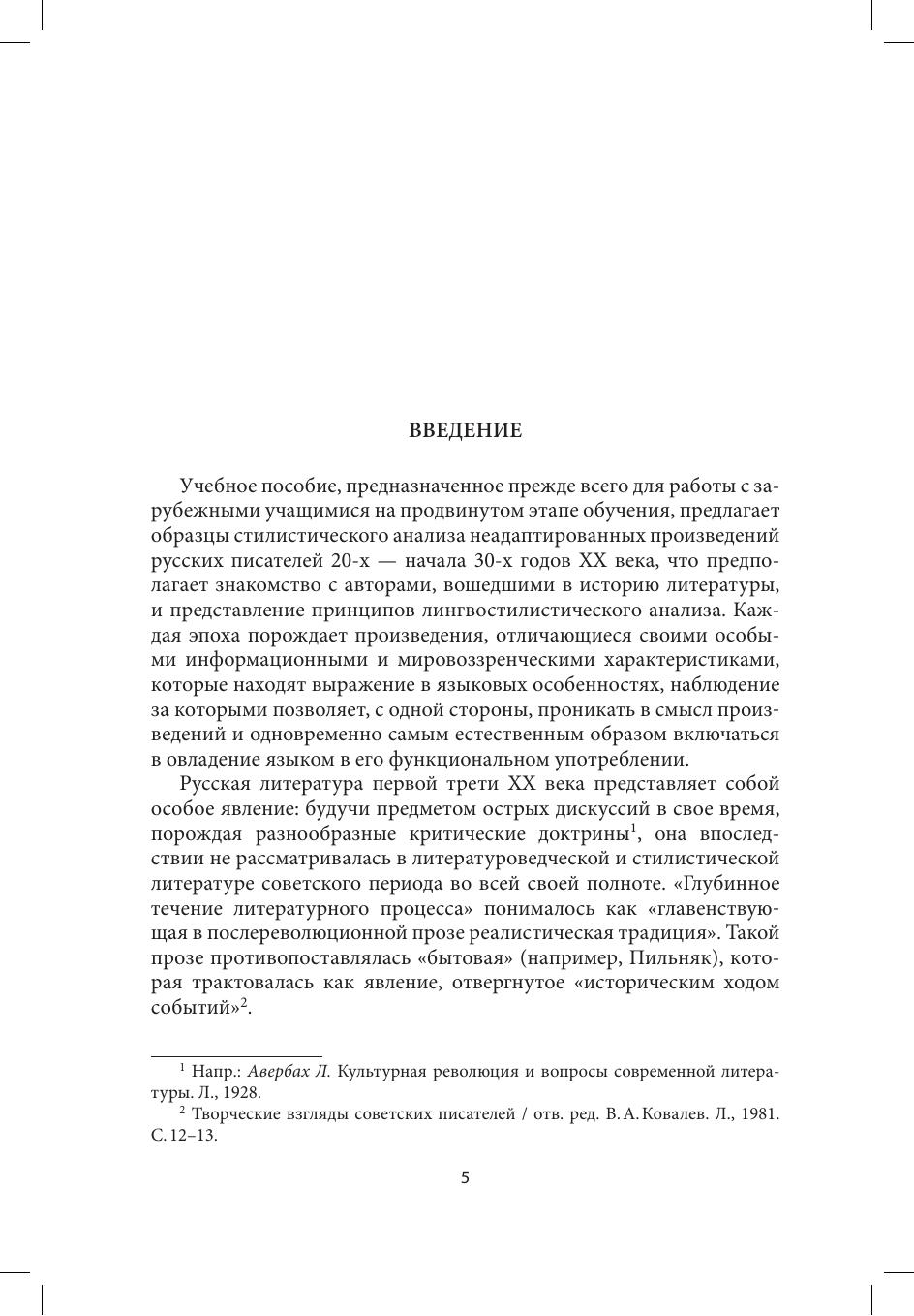 Учебное пособие посвящено лингвостилистическому анализу прозаических произведений русской литературы 20-х — начала 30-х гг. ХХ века. Этот период в литературном процессе привлекает внимание не только иностранных учащихся, но и русских читателей, так как содержит достоверное отображение эпохи, делает понятным ее воздействие на характер человека революционного времени. Отбор писательских имен определен их местом в истории русской литературы. Книга состоит из двух частей. В первую входят сведения об авторах, тексты произведений, образцы лингвостилистического анализа, во вторую — произведения тех же авторов, предлагаемые для самостоятельного анализа учащихся.