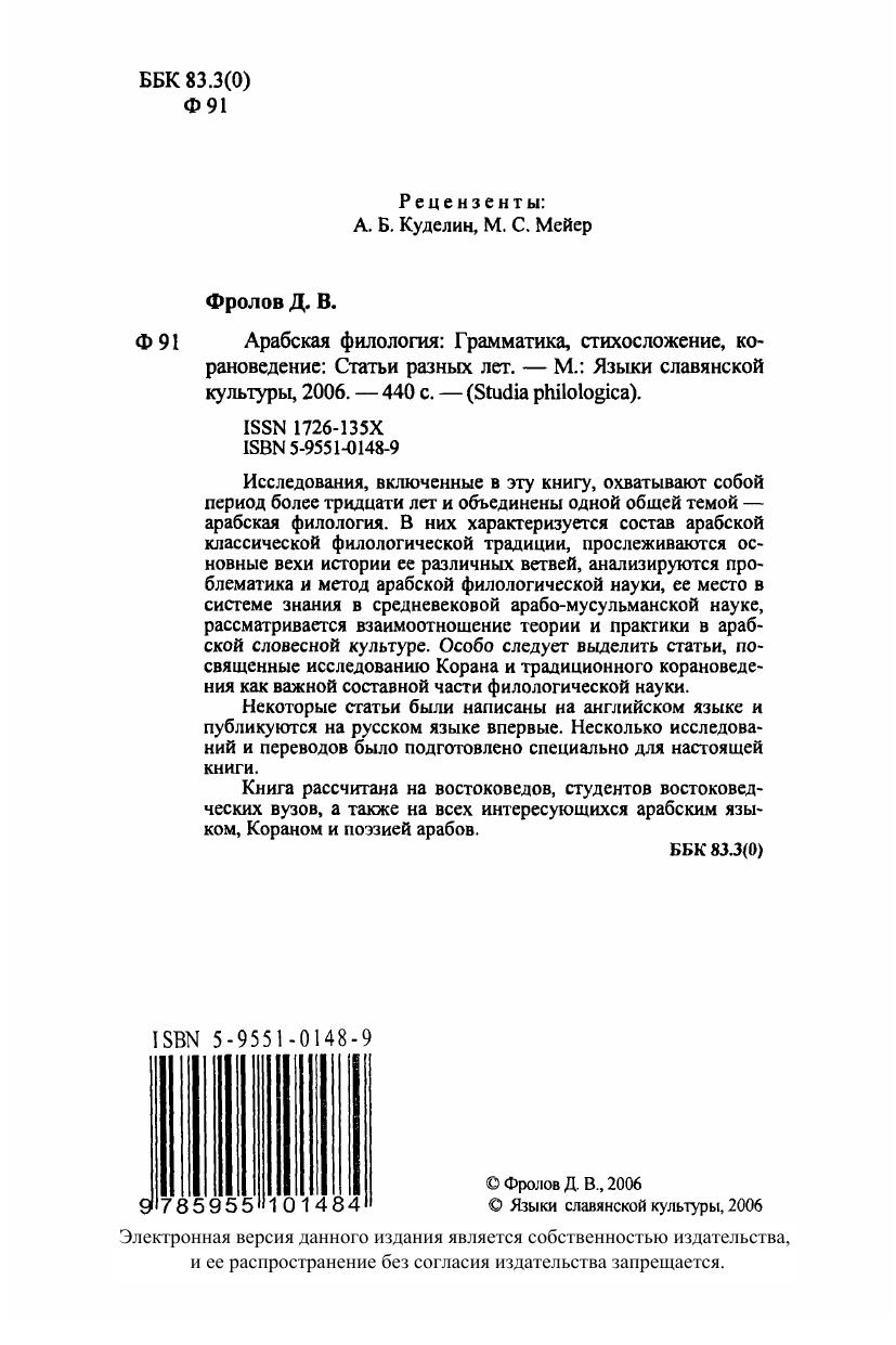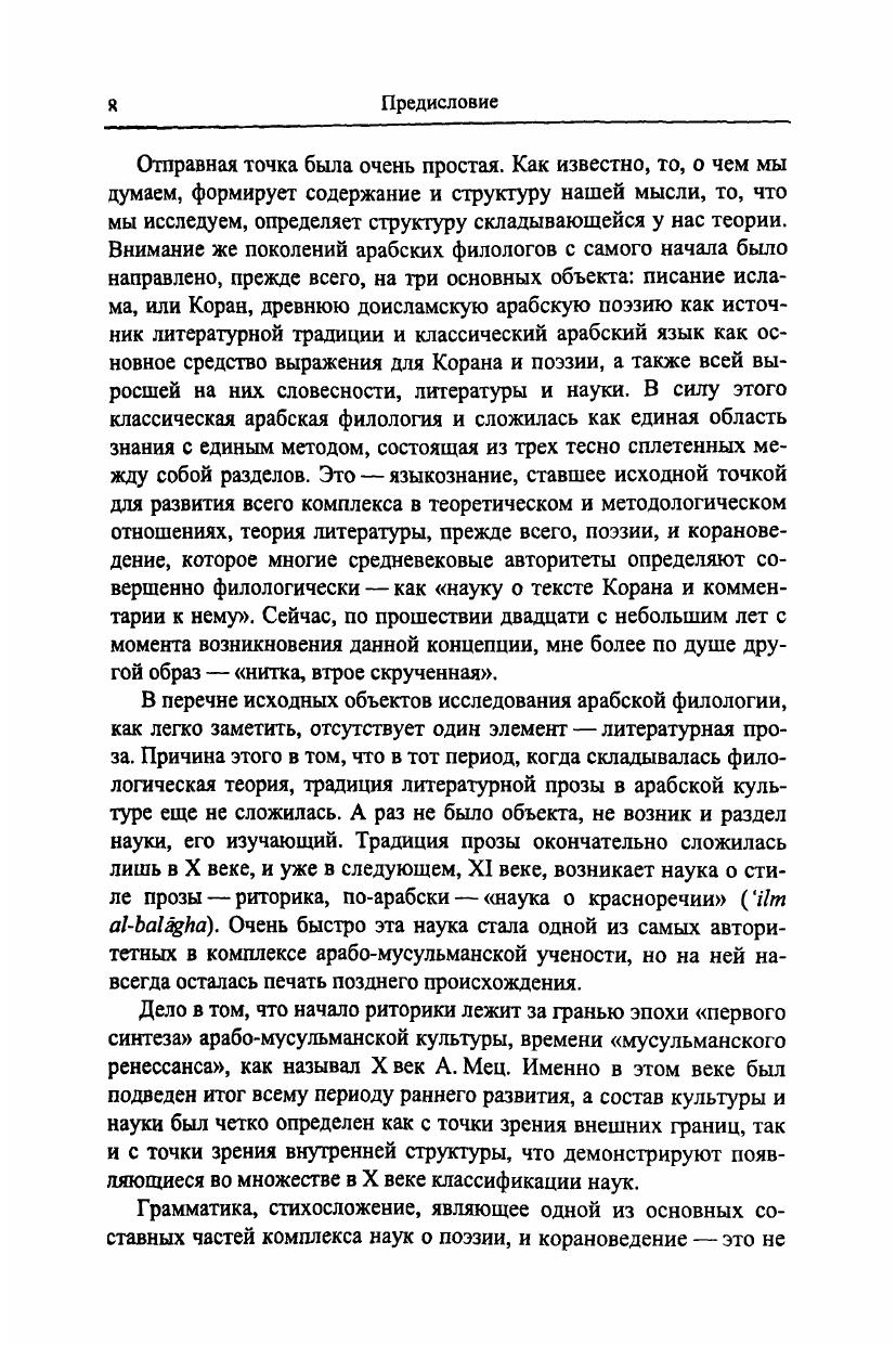 Исследования, включенные в эту книгу, охватывают собой период более тридцати лет и объединены одной общей темой - арабская филология. В них характеризуется состав арабской классической филологической традиции, прослеживаются основные вехи истории ее различных ветвей, анализируются проблематика и метод арабской филологической науки, ее место в системе знания в средневековой арабо-мусульманской науке, рассматривается взаимоотношение теории и практики в арабской словесной культуре. Особо следует выделить статьи, посвященные исследованию Корана и традиционного корановедения как важной составной части филологической науки. Несколько исследований и переводов было подготовлено специально для настоящей книги. Книга рассчитана на востоковедов, студентов востоковедческих вузов, а также на всех интересующихся арабским языком, Кораном и поэзией арабов.