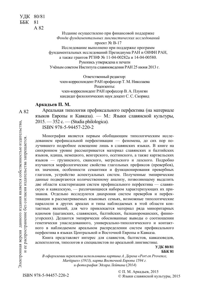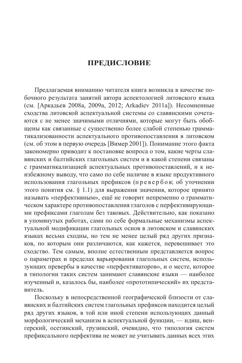 Монография является первым обобщающим типологическим исследованием префиксальной перфективации - феномена, до сих пор получившего подробное освещение лишь в славянских языках. В книге на синхронном уровне рассматривается материал славянских и балтийских языков, идиша, немецкого, венгерского, осетинского, а также картвельских языков - грузинского, сванского, мегрельского и лазского. Подробно изучаются морфологические свойства глагольных префиксов (превербов). их значения, особенности семантики и функционирования превербных глаголов, устройство аспектуальных систем. Полученные эмпирические данные подвергаются количественному анализу, позволяющему выделить две области кластеризации систем префиксального перфектива - славянскую и кавказскую, - различающиеся набором характеризующих их признаков. Отдельно исследуются диахрония систем превербов и перфективации в рассматриваемых языковых семьях, возможные типологические параллели в других ареалах и типы наблюдаемых в этой области контактных явлений, для чего привлекается материал ряда миноритарных идиомов (цыганских, славянских, балтийских, балканороманских, финно-угорских). Делаются эмпирически обоснованные выводы о соотношении генетически унаследованного, универсально-типологического и контактного в наблюдаемом ареальном распределении систем префиксального перфектива в языках Центральной и Восточной Европы и Кавказа. Книга представляет интерес для славистов, балтистов, кавказоведов, аспектологов, типологов и специалистов по ареальной лингвистике.