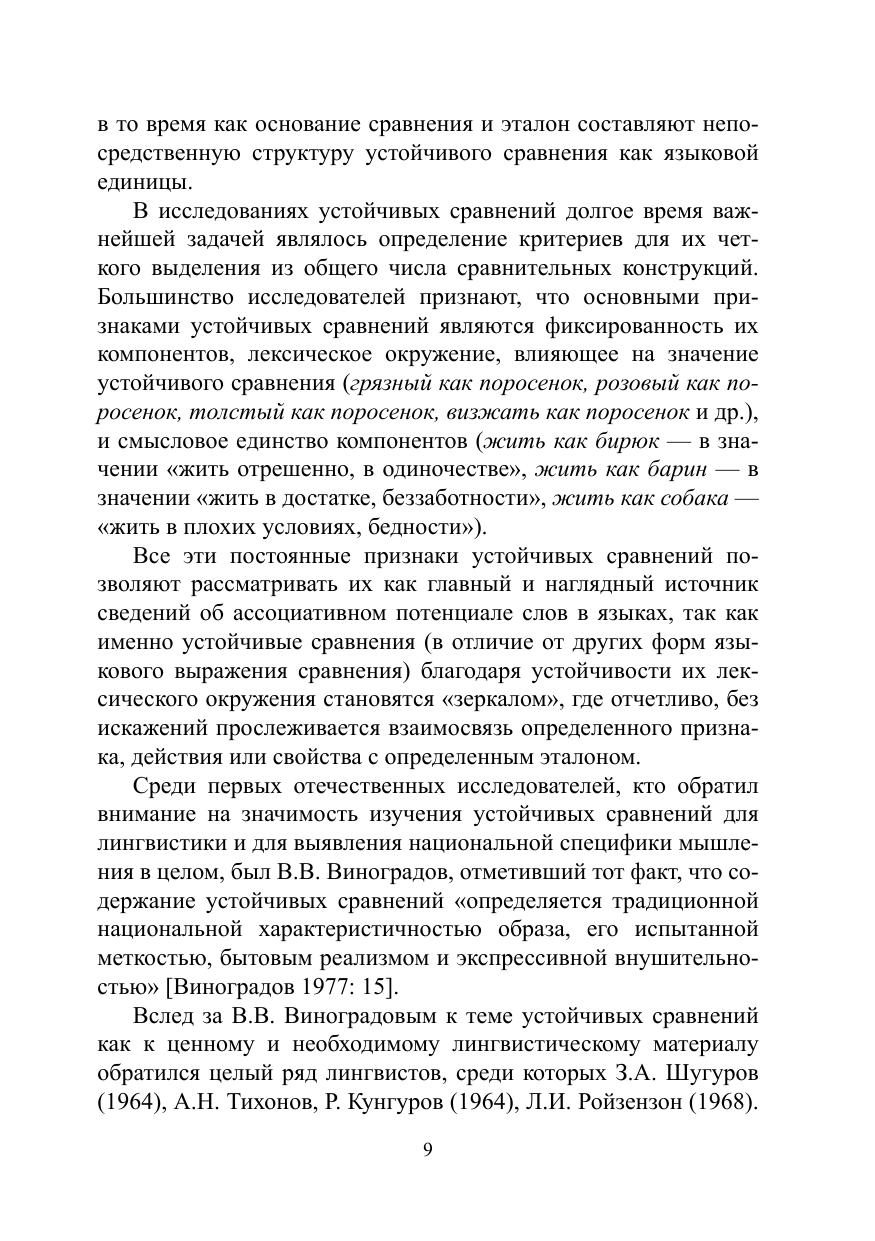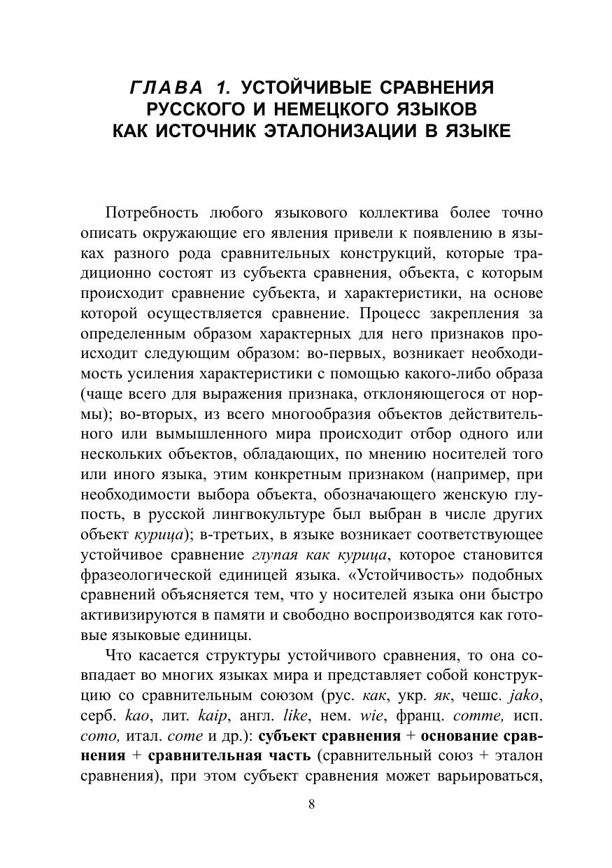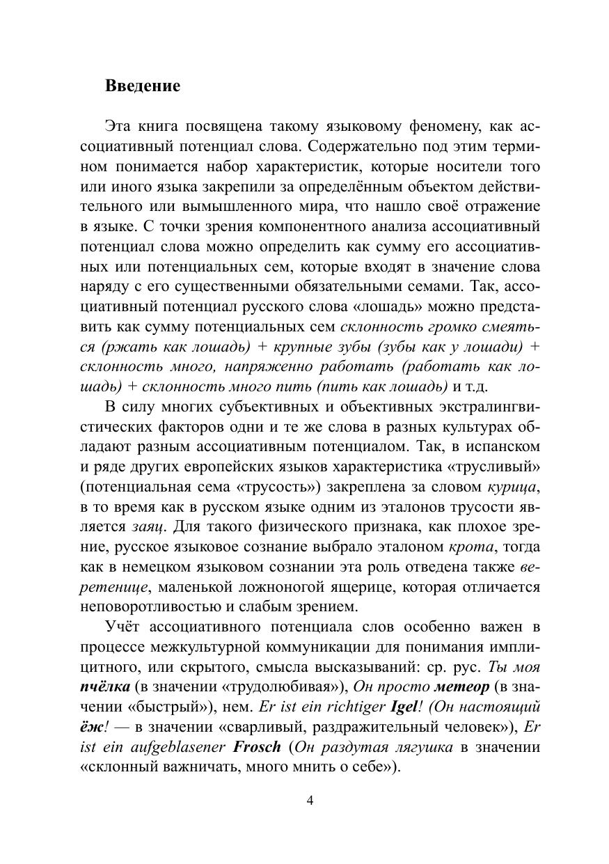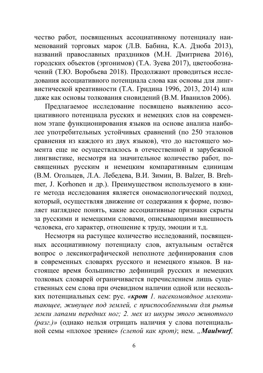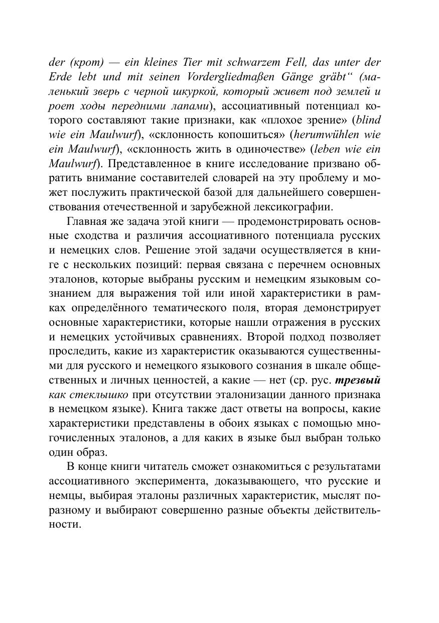 Цель монографии — продемонстрировать основные сходства и различия ассоциативного потенциала русских и немецких слов. Решение этой задачи осуществляется в книге с нескольких позиций: первая связана с перечнем основных эталонов, которые выбраны русским и немецким языковым сознанием для выражения той или иной характеристики в рамках определённого тематического поля, вторая демонстрирует основные характеристики, которые нашли отражения в русских и немецких устойчивых сравнениях. Второй подход позволяет проследить, какие из характеристик оказываются существенными для русского и немецкого языкового сознания в шкале общественных и личных ценностей, а какие — нет. Книга также даст ответы на вопросы, какие характеристики представлены в обоих языках с помощью многочисленных эталонов, а для каких в языке был выбран только один образ.