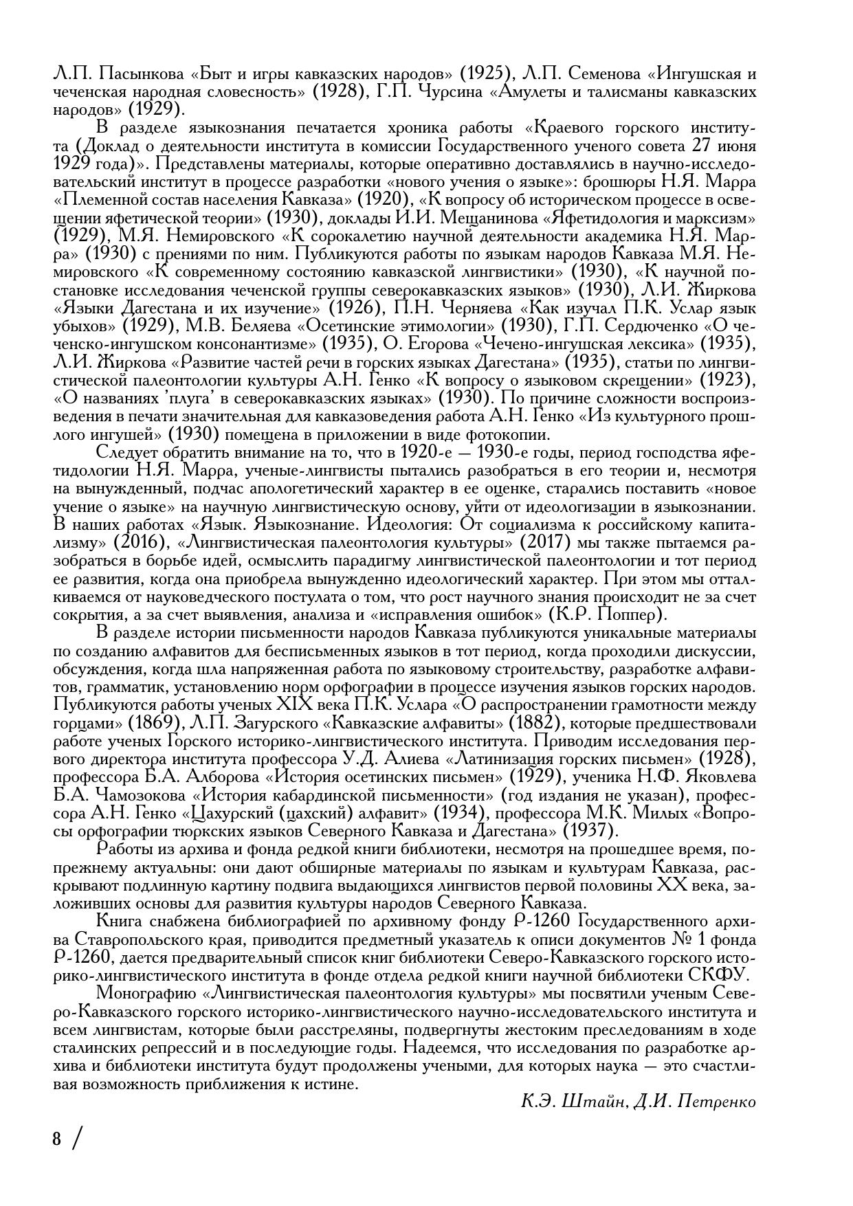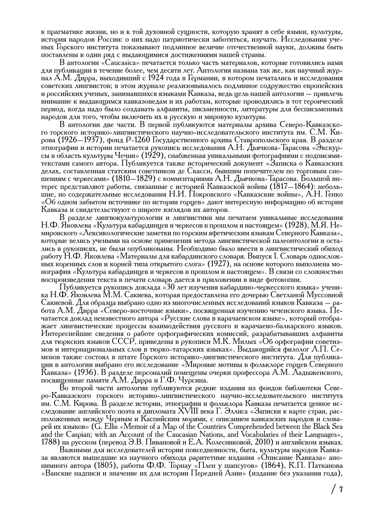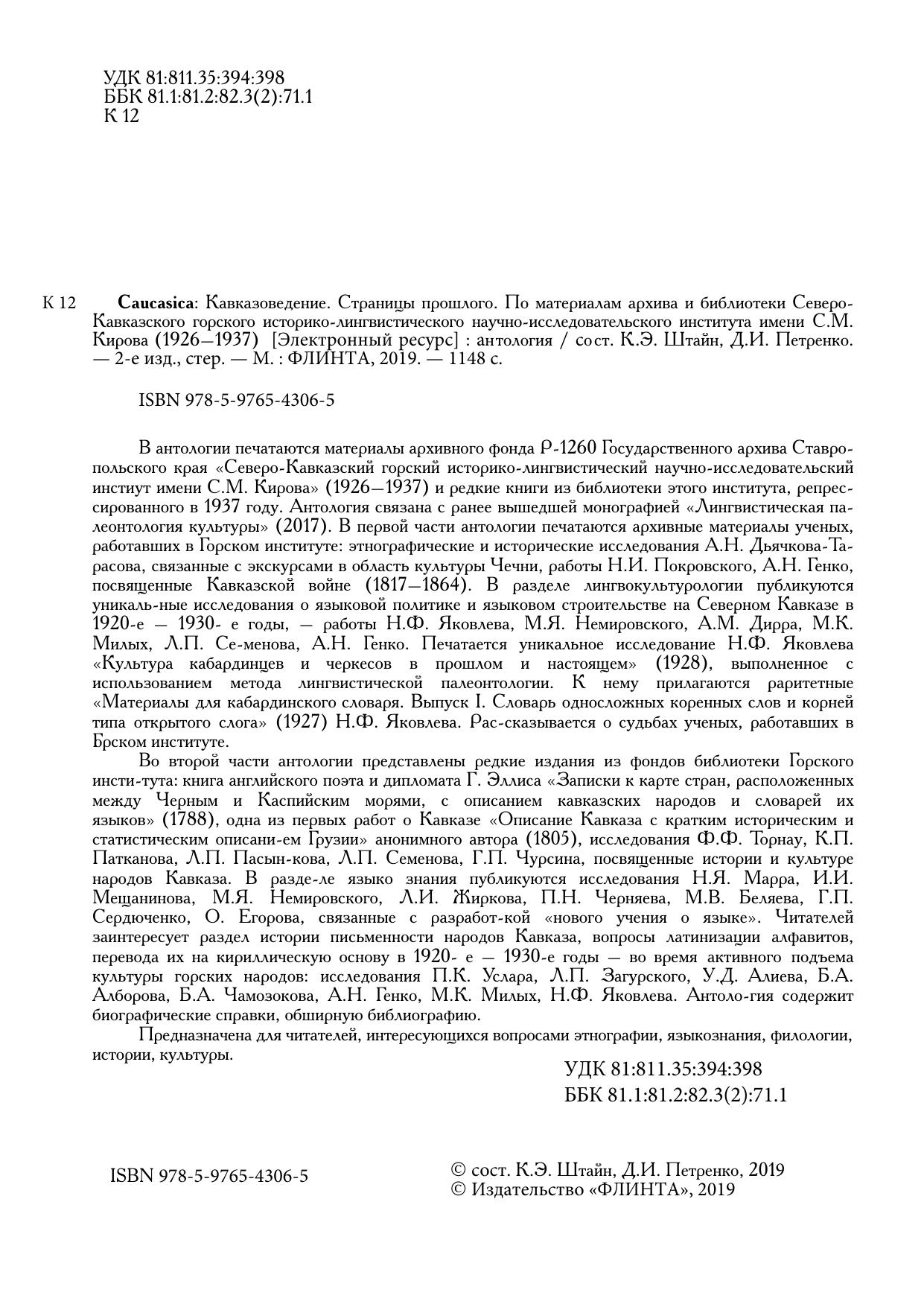 В антологии печатаются материалы архивного фонда Р-1260 Государственного архива Ставропольского края «Северо-Кавказский горский историко-лингвистический научно-исследовательский инстиут имени С.М. Кирова» (1926–1937) и редкие книги из библиотеки этого института, репрессированного в 1937 году. Антология связана с ранее вышедшей монографией «Лингвистическая палеонтология культуры» (2017). В первой части антологии печатаются архивные материалы ученых, работавших в Горском институте: этнографические и исторические исследования А.Н. Дьячкова-Тарасова, связанные с экскурсами в область культуры Чечни, работы Н.И. Покровского, А.Н. Генко, посвященные Кавказской войне (1817–1864). В разделе лингвокультурологии публикуются уникальные исследования о языковой политике и языковом строительстве на Северном Кавказе в 1920-е – 1930- е годы, – работы Н.Ф. Яковлева, М.Я. Немировского, А.М. Дирра, М.К. Милых, Л.П. Се-менова, А.Н. Генко. Печатается уникальное исследование Н.Ф. Яковлева «Культура кабардинцев и черкесов в прошлом и настоящем» (1928), выполненное с использованием метода лингвистической палеонтологии. К нему прилагаются раритетные «Материалы для кабардинского словаря. Выпуск I. Словарь односложных коренных слов и корней типа открытого слога» (1927) Н.Ф. Яковлева. Рассказывается о судьбах ученых, работавших в Горском институте.