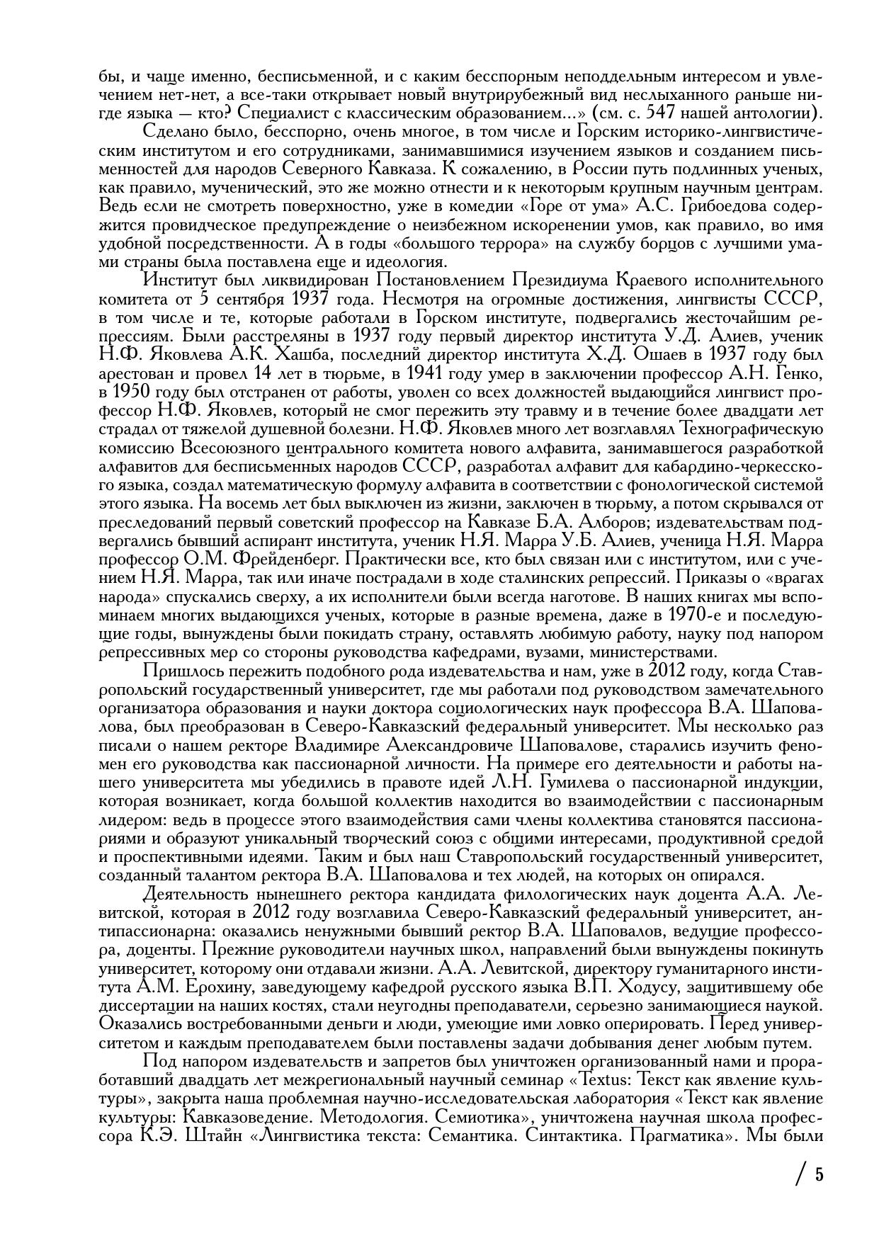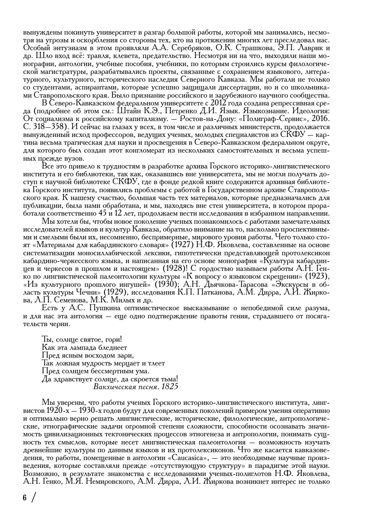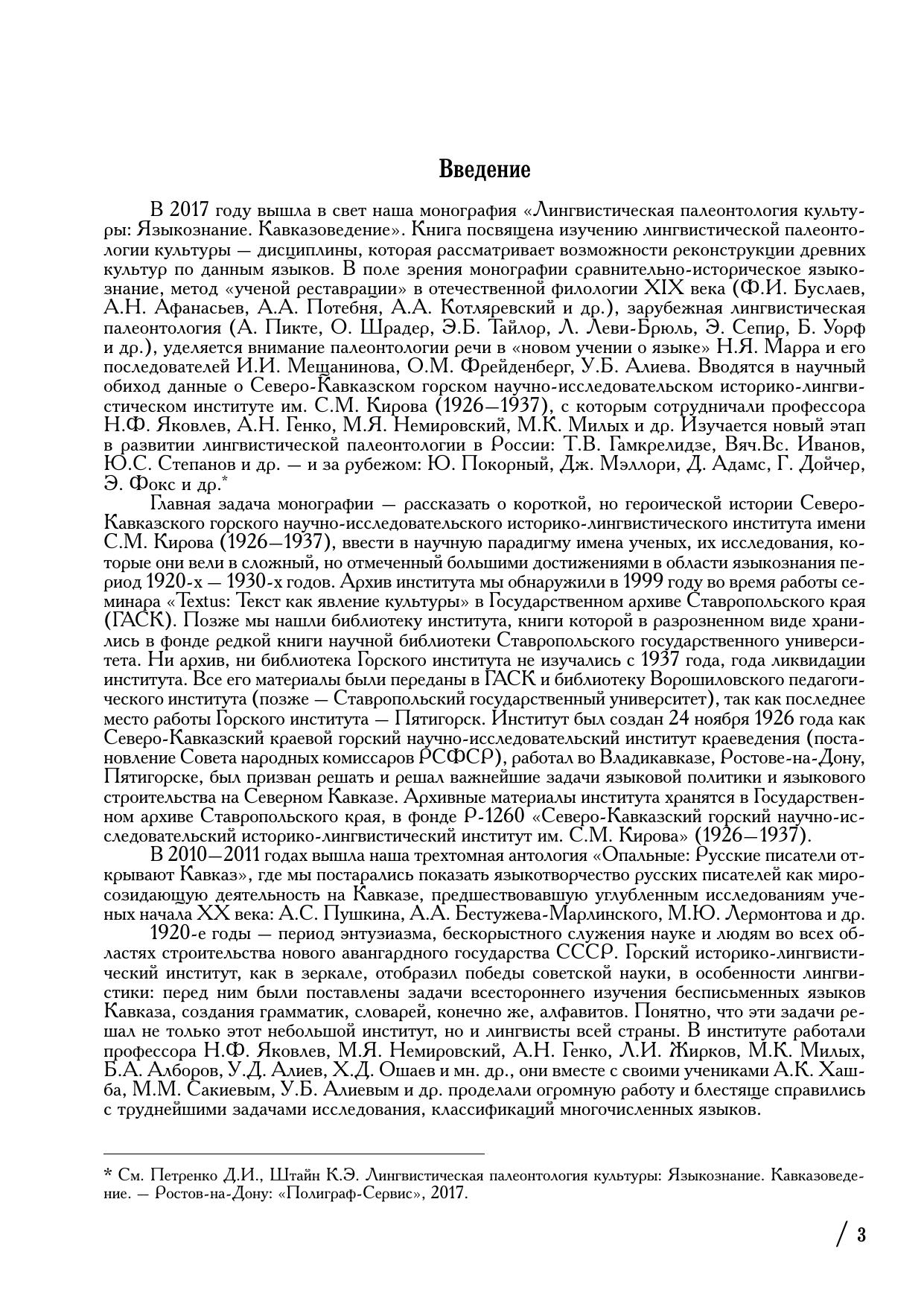 В антологии печатаются материалы архивного фонда Р-1260 Государственного архива Ставропольского края «Северо-Кавказский горский историко-лингвистический научно-исследовательский инстиут имени С.М. Кирова» (1926–1937) и редкие книги из библиотеки этого института, репрессированного в 1937 году. Антология связана с ранее вышедшей монографией «Лингвистическая палеонтология культуры» (2017). В первой части антологии печатаются архивные материалы ученых, работавших в Горском институте: этнографические и исторические исследования А.Н. Дьячкова-Тарасова, связанные с экскурсами в область культуры Чечни, работы Н.И. Покровского, А.Н. Генко, посвященные Кавказской войне (1817–1864). В разделе лингвокультурологии публикуются уникальные исследования о языковой политике и языковом строительстве на Северном Кавказе в 1920-е – 1930- е годы, – работы Н.Ф. Яковлева, М.Я. Немировского, А.М. Дирра, М.К. Милых, Л.П. Се-менова, А.Н. Генко. Печатается уникальное исследование Н.Ф. Яковлева «Культура кабардинцев и черкесов в прошлом и настоящем» (1928), выполненное с использованием метода лингвистической палеонтологии. К нему прилагаются раритетные «Материалы для кабардинского словаря. Выпуск I. Словарь односложных коренных слов и корней типа открытого слога» (1927) Н.Ф. Яковлева. Рассказывается о судьбах ученых, работавших в Горском институте.