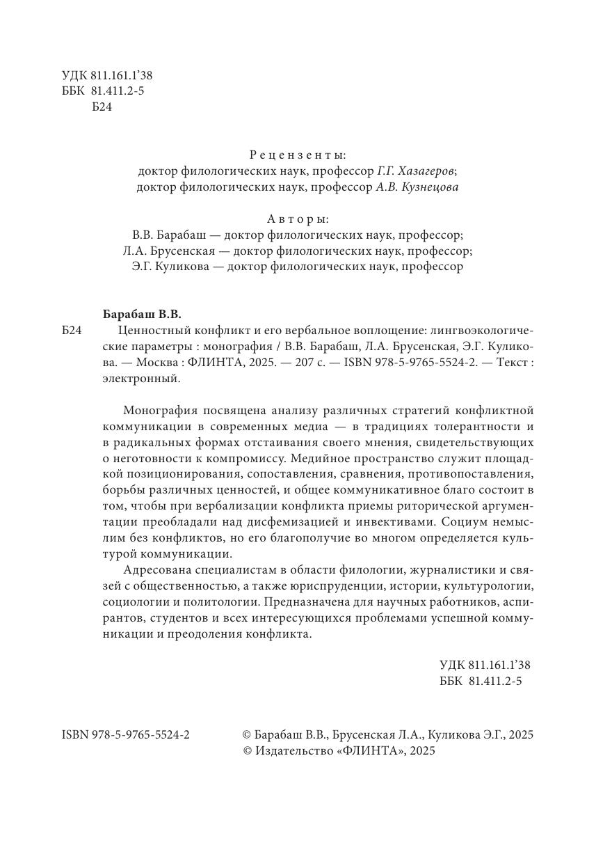 Монография посвящена анализу различных стратегий конфликтной коммуникации в современных медиа — в традициях толерантности и в радикальных формах отстаивания своего мнения, свидетельствующих о неготовности к компромиссу. Медийное пространство служит площадкой позиционирования, сопоставления, сравнения, противопоставления, борьбы различных ценностей, и общее коммуникативное благо состоит в том, чтобы при вербализации конфликта приемы риторической аргументации преобладали над дисфемизацией и инвективами. Социум немыслим без конфликтов, но его благополучие во многом определяется культурой коммуникации.
