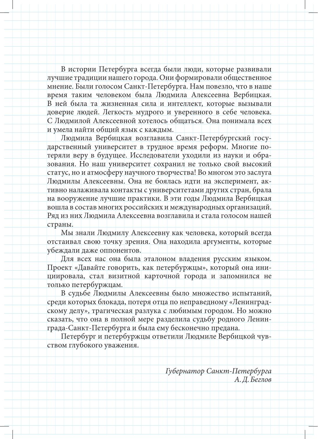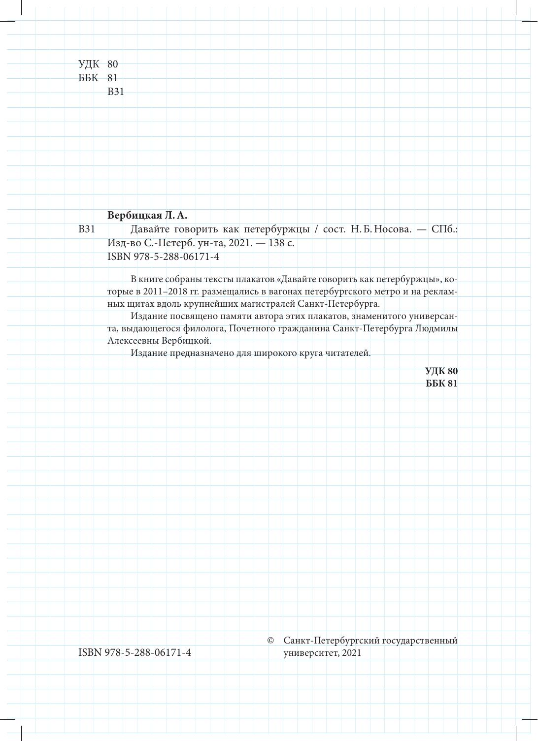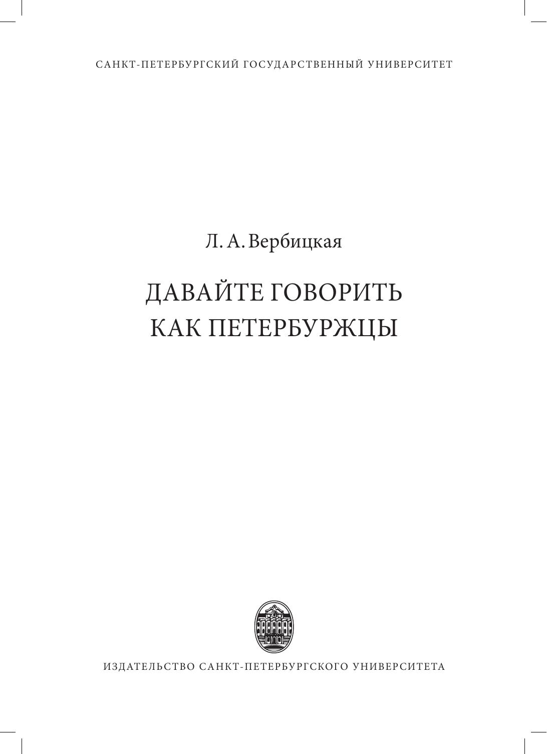 В книге собраны тексты плакатов "Давайте говорить как петербуржцы", которые в 2011-2018 гг. размещались в вагонах петербургкого метро и на рекламных щитах вдоль крупнейших магистралей Санкт-Петербурга. Издание посвящено памяти автора этих плакатов, знаменитого универсанта, выдающегося филолога, Почетного гражданина Санкт-Петербурга Людмилы Алексеевны Вербицкой
