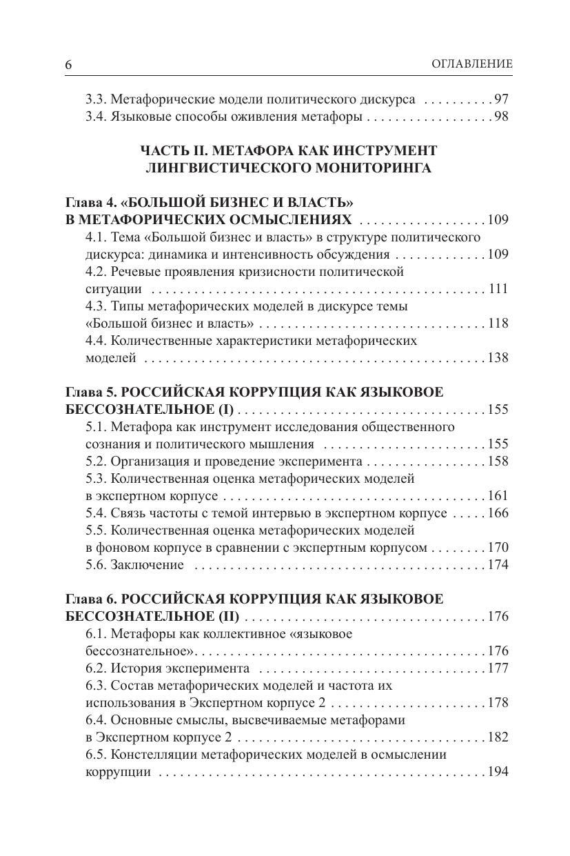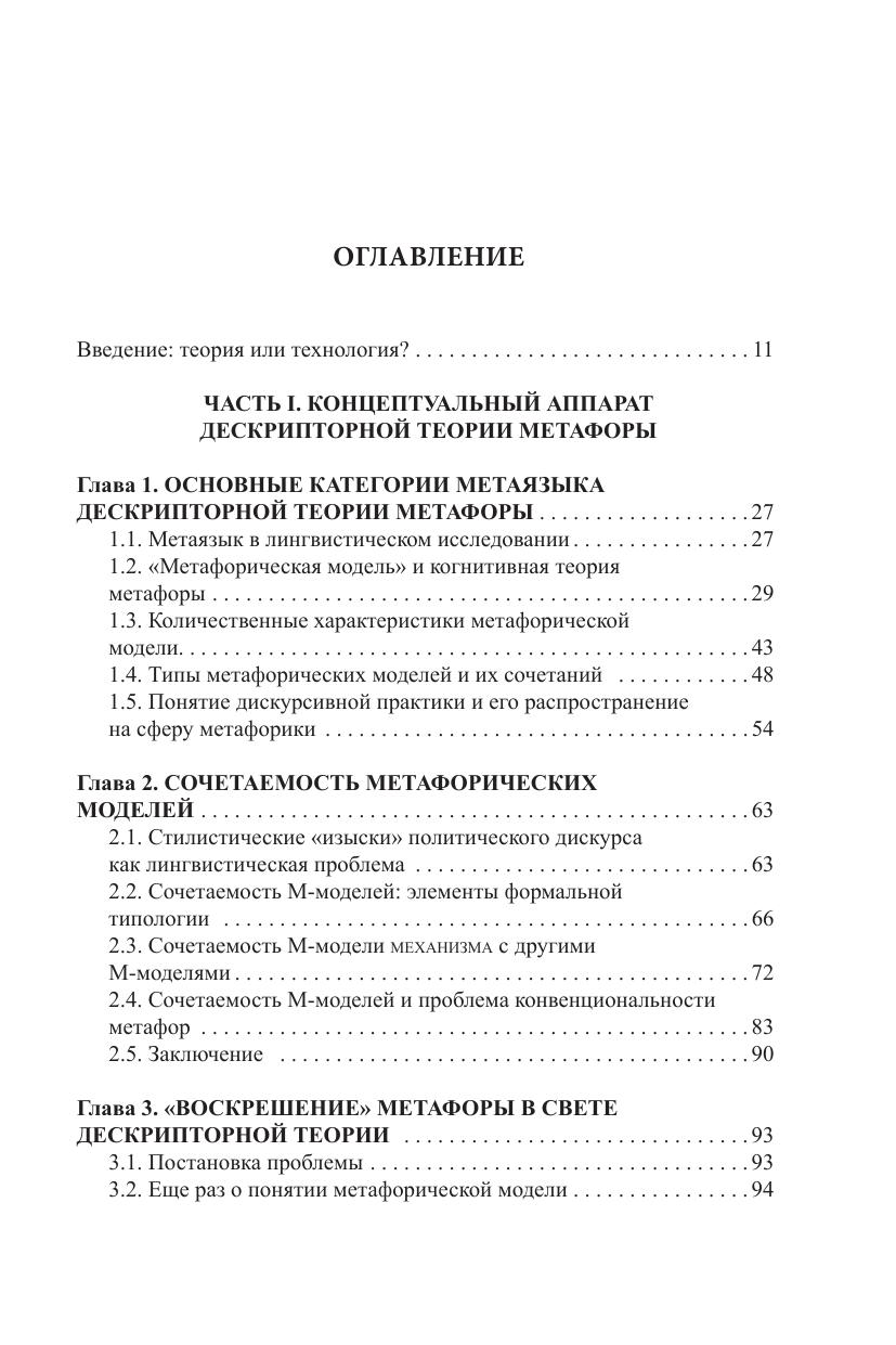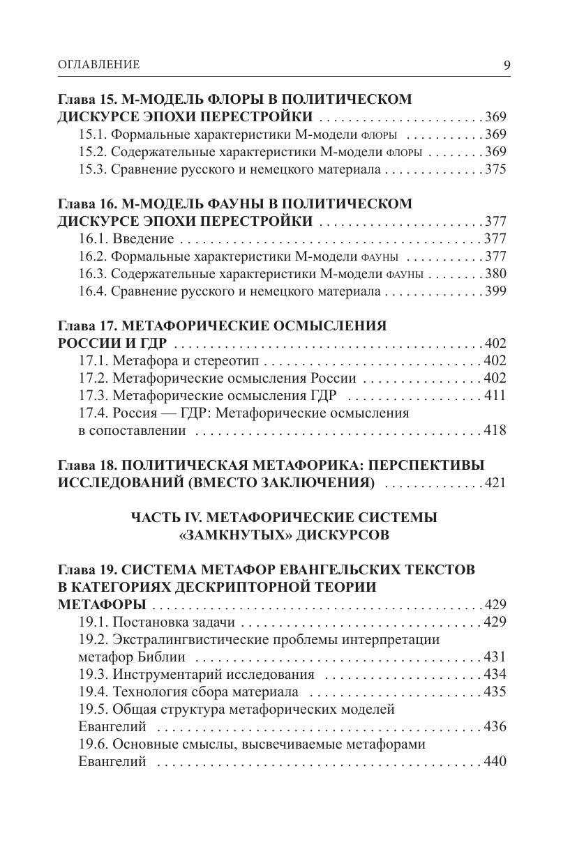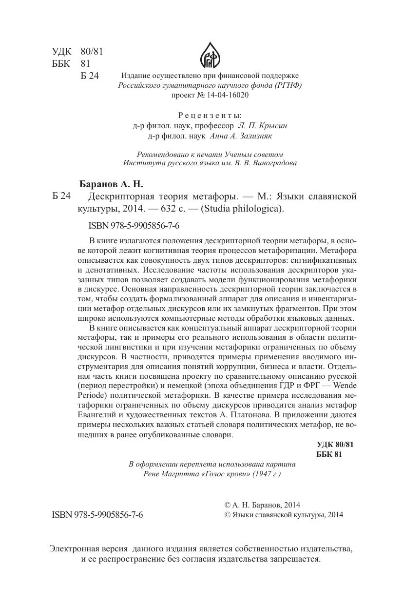 В книге излагаются положения дескрипторной теории метафоры, в основе которой лежит когнитивная теория процессов метафоризации. Метафора описывается как совокупность двух типов дескрипторов: сигнификативных и денотативных. Исследование частоты использования дескрипторов указанных типов позволяет создавать модели функционирования метафорики в дискурсе. Основная направленность дескрипторной теории заключается в том, чтобы создать формализованный аппарат для описания и инвентаризации метафор отдельных дискурсов или их замкнутых фрагментов. При этом широко используются компьютерные методы обработки языковых данных. В книге описывается как концептуальный аппарат дескрипторной теории метафоры, так и примеры его реального использования в области политической лингвистики и при изучении метафорики ограниченных по объему дискурсов. В частности, приводятся примеры применения вводимого инструментария для описания понятий коррупции, бизнеса и власти. Отдельная часть книги посвящена проекту по сравнительному описанию русской (период перестройки) и немецкой (эпоха объединения ГДР и ФРГ - Wende Periode) политической метафорики. В качестве примера исследования метафорики ограниченных по объему дискурсов приводится анализ метафор Евангелий и художественных текстов А. Платонова. В приложении даются примеры нескольких важных статьей словаря политических метафор, не вошедших в ранее опубликованные словари.