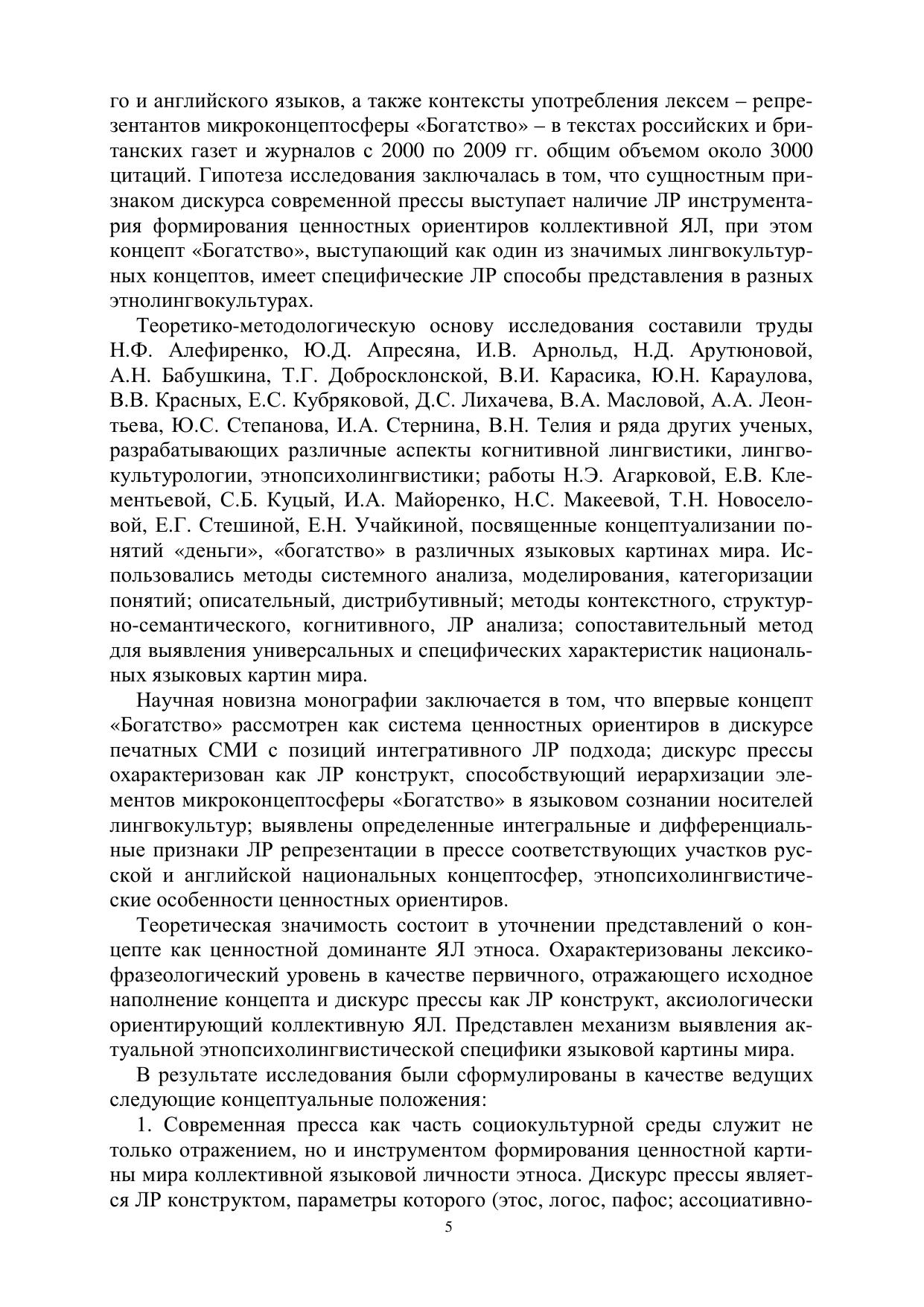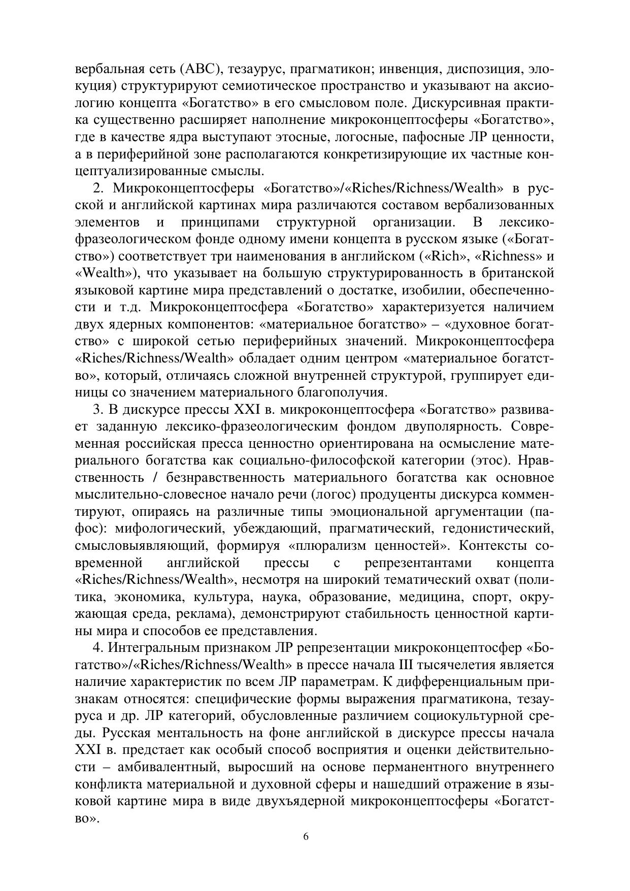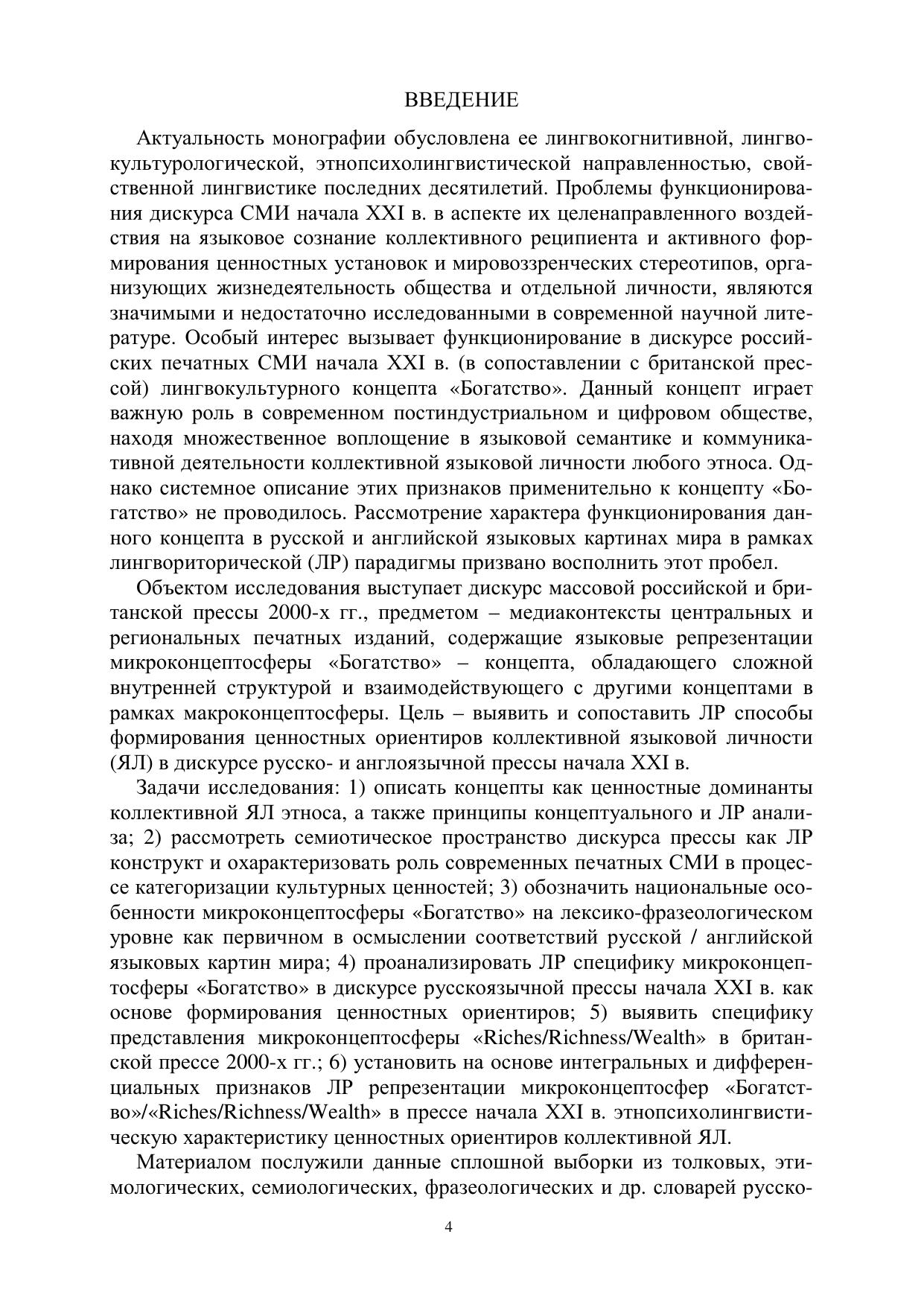 Дискурс прессы представлен с позиций лингвориторической парадигмы, как семиотическое пространство и смысловое поле формирования ценностных ориентиров коллективной языковой личности этноса в начале ХХI в. Микроконцептосфера «Богатство» охарактеризована в качестве системы ценностных ориентиров в лексико-фразеологическом фонде и дискурсе прессы на материале русского и англий-ского языков.