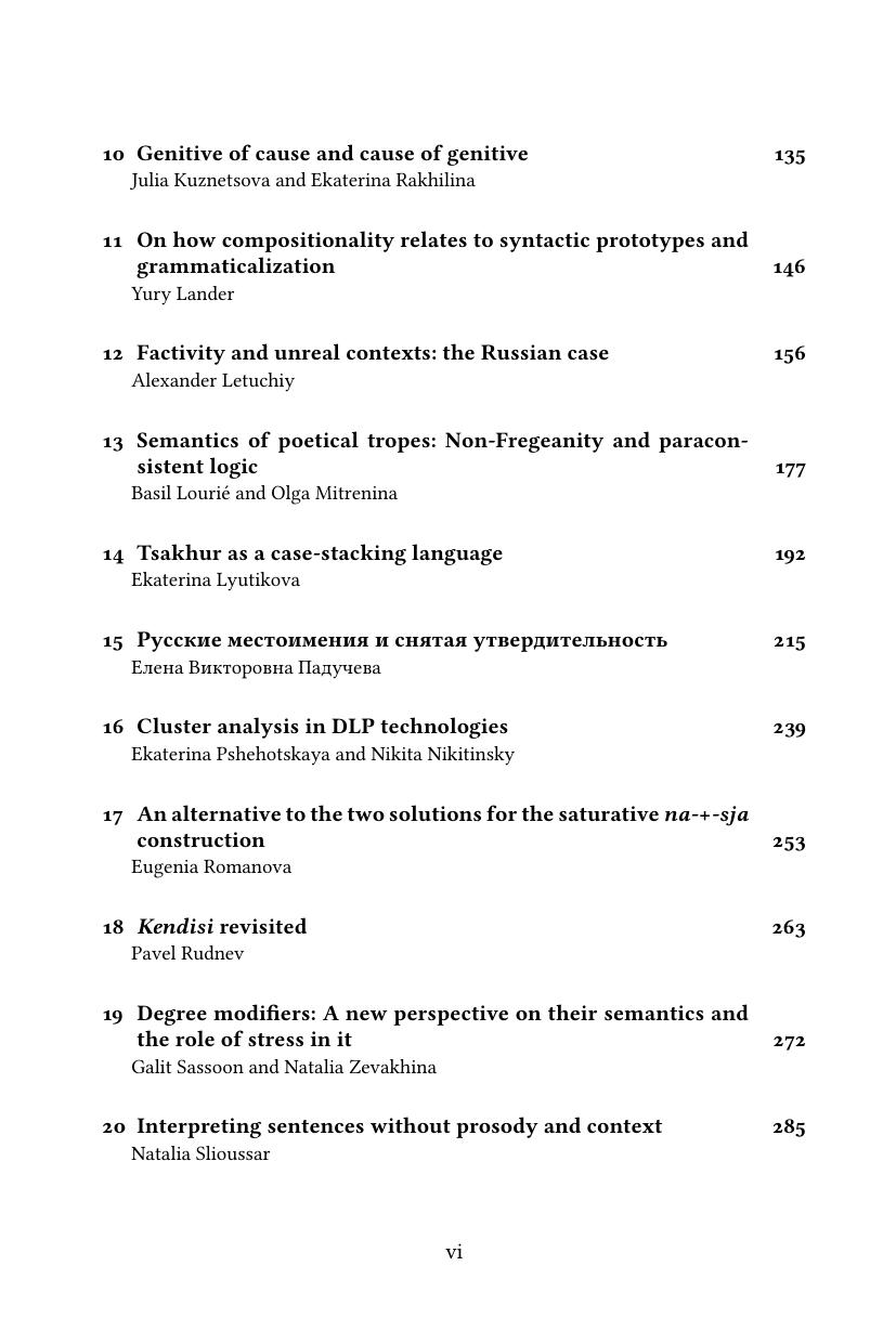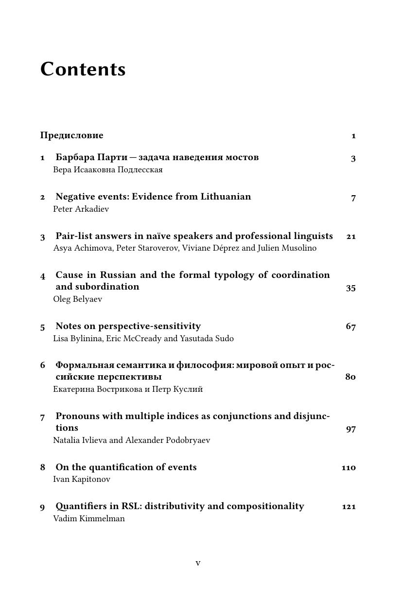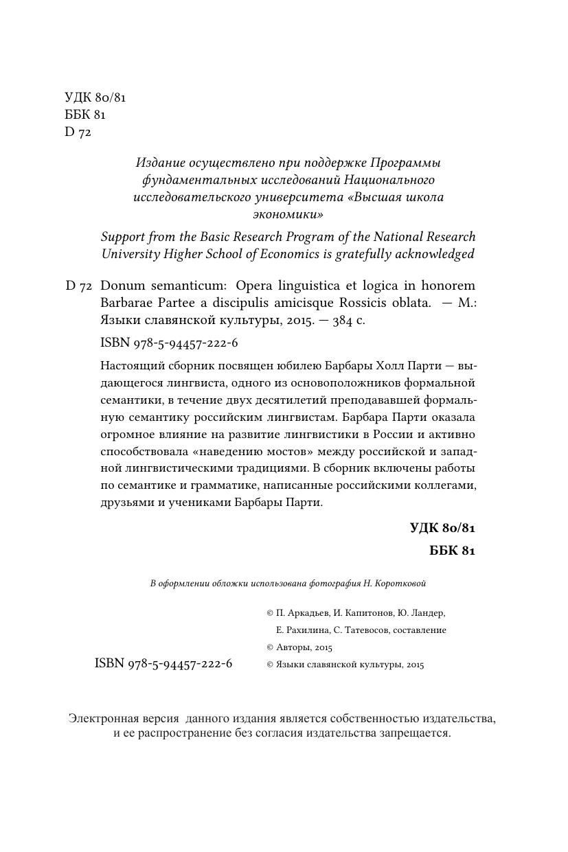 Настоящий сборник посвящен юбилею Барбары Холл Парти — выдающегося лингвиста, одного из основоположников формальной семантики, в течение двух десятилетий преподававшей формальную семантику российским лингвистам. Барбара Парти оказала огромное влияние на развитие лингвистики в России и активно способствовала «наведению мостов» между российской и западной лингвистическими традициями. В сборник включены работы по семантике и грамматике, написанные российскими коллегами, друзьями и учениками Барбары Парти.
