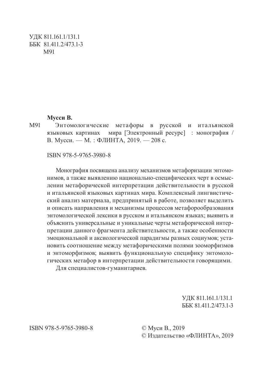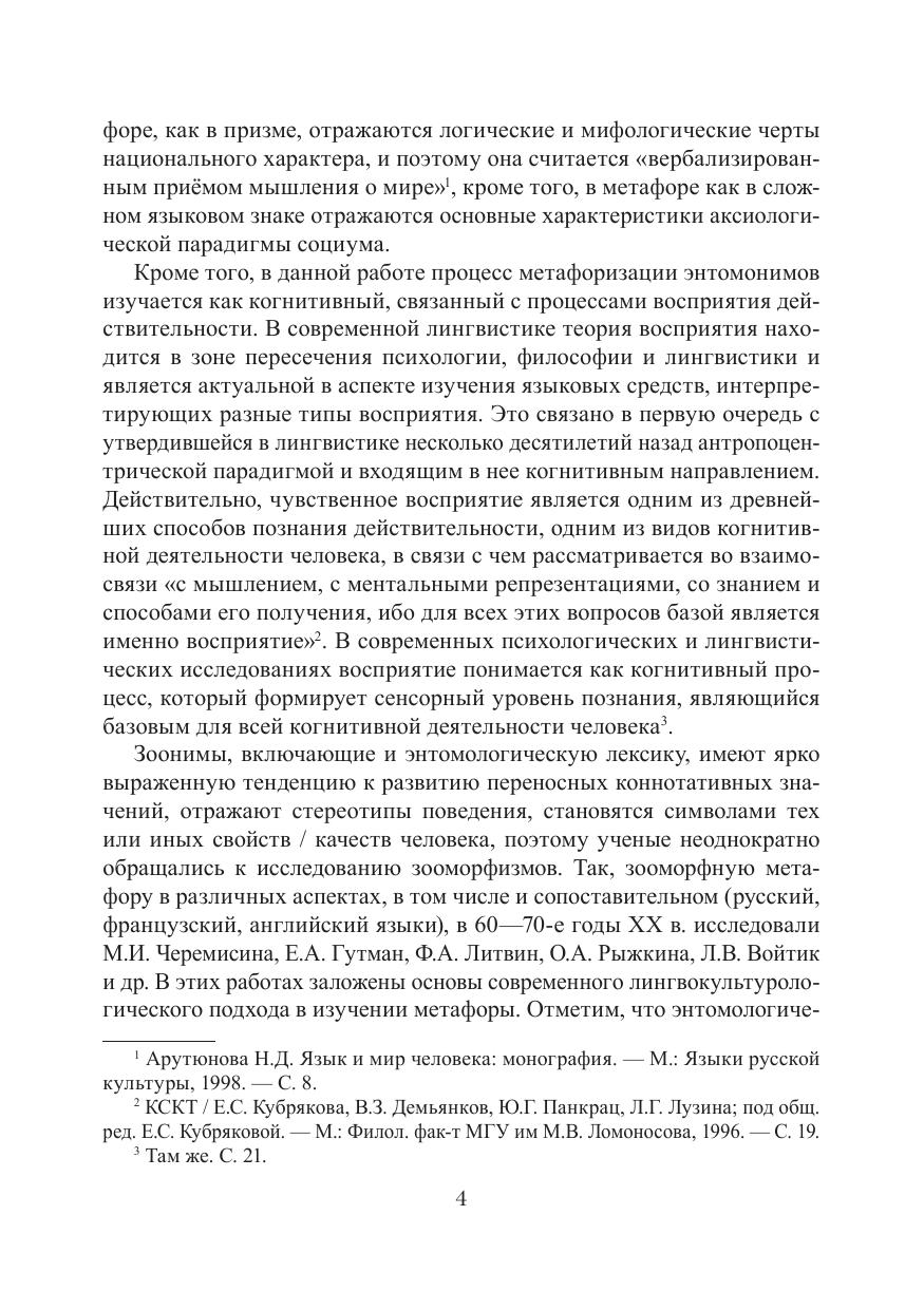 Монография посвящена анализу механизмов метафоризации энтомонимов, а также выявлению национально-специфических черт в осмыслении метафорической интерпретации действительности в русской и итальянской языковых картинах мира. Комплексный лингвистический анализ материала, предпринятый в работе, позволяет выделить и описать направления и механизмы процессов метафорообразования энтомологической лексики в русском и итальянском языках; выявить и объяснить универсальные и уникальные черты метафорической интерпретации данного фрагмента действительности, а также особенности эмоциональной и аксиологической парадигмы разных социумов; установить соотношение между метафорическими полями зооморфизмов и энтоморфизмов; выявить функциональную специфику энтомологических метафор в интерпретации действительности говорящими. Для специалистов-гуманитариев.