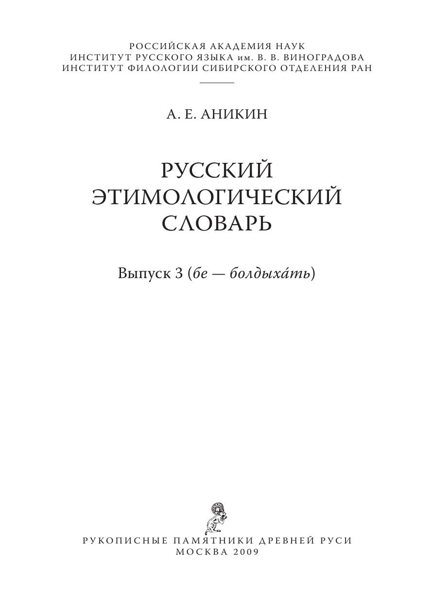 Словарь представляет собой расположенный в алфавитном порядке свод этимологии русской лексики, охватывающей основной словарный фонд русского языка. На основе достижений современной филологической науки в нем рассматривается происхождение и история словарного состава русского языка, в том числе значительный пласт личных имен и географических названий, в большом объеме привлекается диалектная, древне- и старорусская лексика. Материал расположен в алфавитном порядке рассматриваемых слов. Для каждой рассматриваемой лексемы указываются - при наличии необходимости и возможности - ее параллели в других славянских и неславянских языках, а также праславянский или иной этимон с изложением сведений, касающихся его истории и языковых изменений, результатом которых стала данная лексема. 3-й выпуск словаря содержит лексику от бе до болдыхать (около 950 статей). Словарь предназначен для читателей, интересующихся историей русского языка и его отношений с другими языками Евразии.