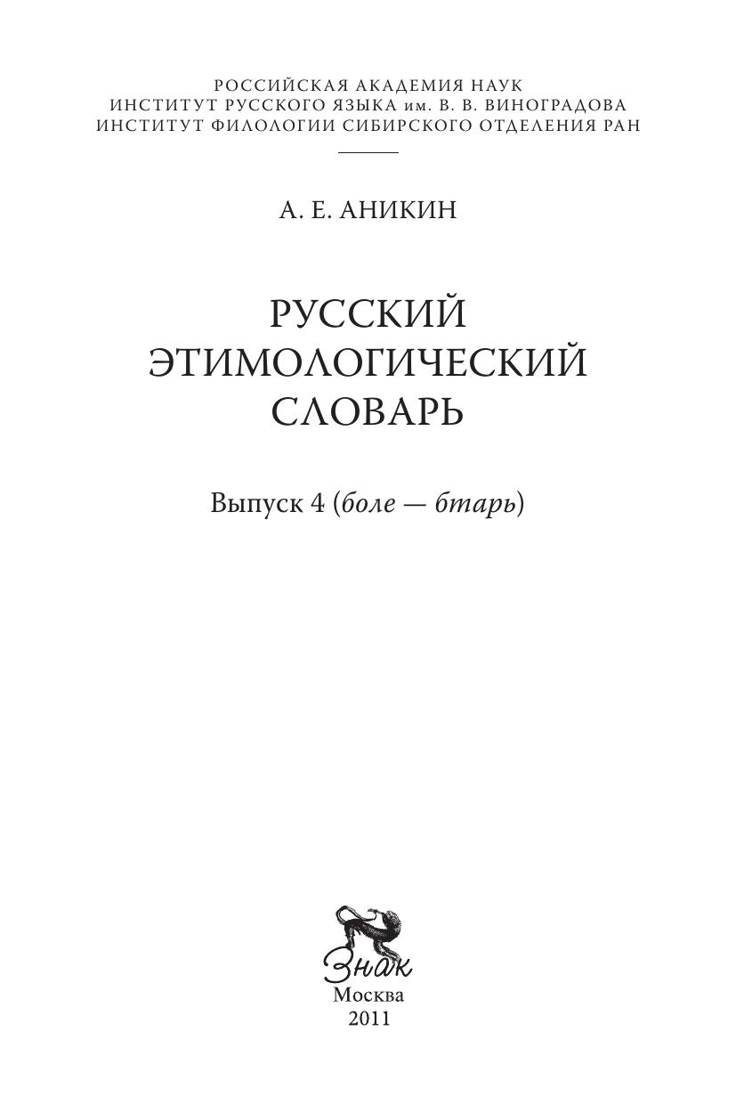 Словарь представляет собой свод этимологии, охватывающий основной словарный фонд русскою языка. На основе достижений современной филологической науки в нем рассматривается происхождение и история русских слов, в том числе значительный пласт личных имен и географических названий, в большом объеме представлена диалектная, древне- и старорусская лексика. Материал расположен в алфавитном порядке. Для каждой рассматриваемой лексемы указываются - при наличии необходимости и возможности - ее параллели в других славянских и неславянских языках, а также праславянский или иной этимон с изложением сведений, касающихся его истории и языковых изменений, результатом которых стала данная лексема. 4-й выпуск словаря содержит лексику от боле до бтарь (около 950 статей). Словарь предназначен для читателей, интересующихся историей русского языка и его отношений с другими языками Евразии.