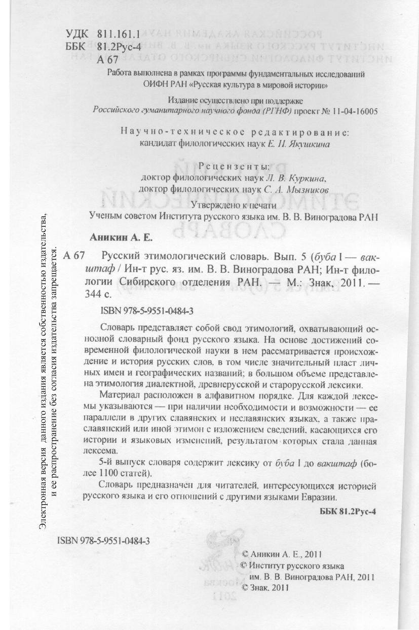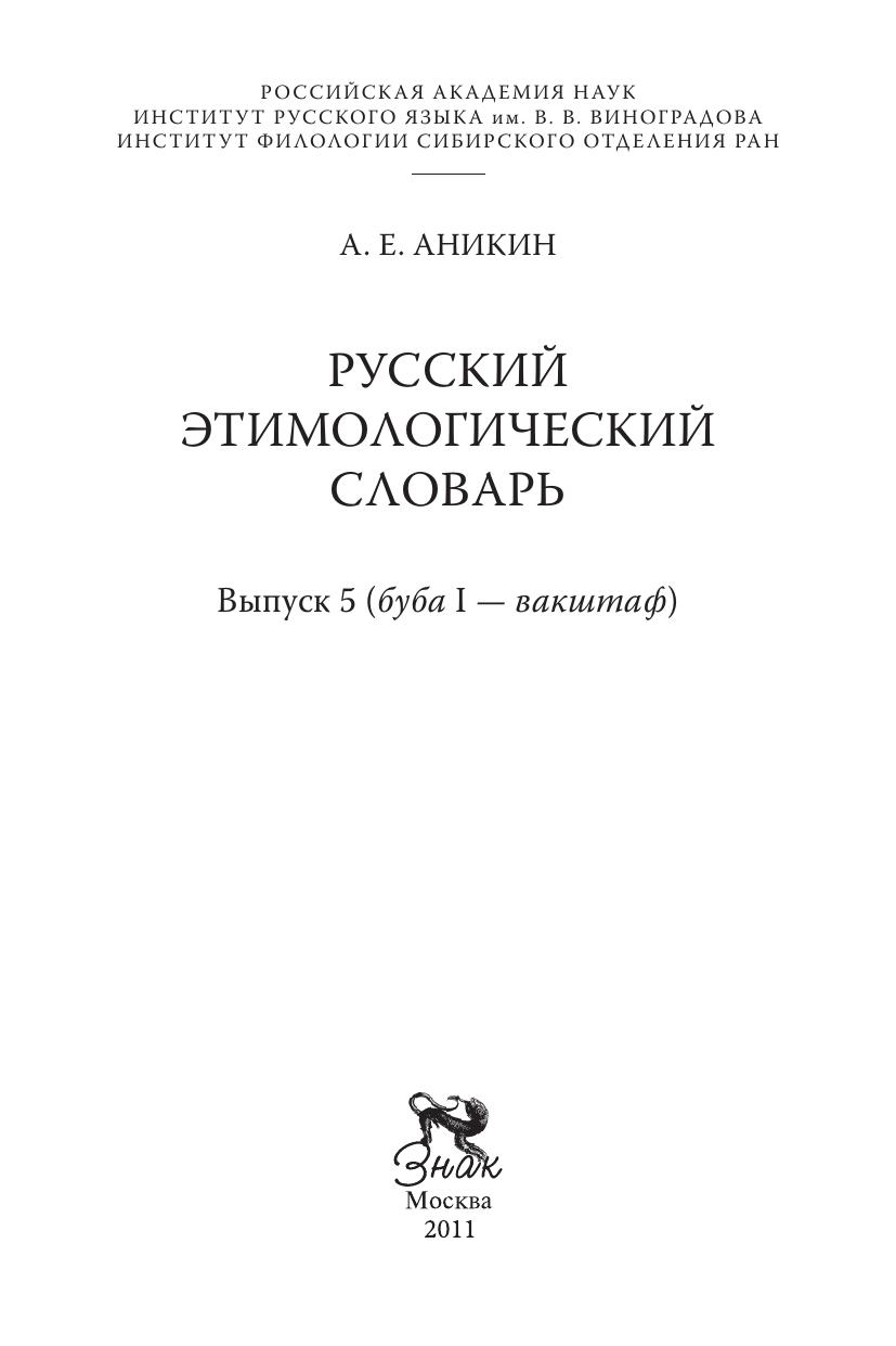 Словарь представляет собой свод этимологам, охватывающий основной словарный фонд русского языка. На основе достижений современной филологической науки в нем рассматривается происхождение и история русских слов, в том числе значительный пласт личных имен и географических названий, в большом объеме представлена этимология диалектной, древнерусской и старорусской лексики. Материал расположен в алфавитном порядке. Для каждой лексемы указываются - при наличии необходимости и возможности - ее параллели в других славянских и неславянских языках, а также праславянский или иной этимон с изложением сведений, касающихся его истории и языковых изменений, результатом которых стала данная лексема. 5-й выпуск словаря содержит лексику от буба I до вакштаф (более 1100 статей). Словарь предназначен для читателей, интересующихся историей русского языка и его отношений с другими языками Евразии.