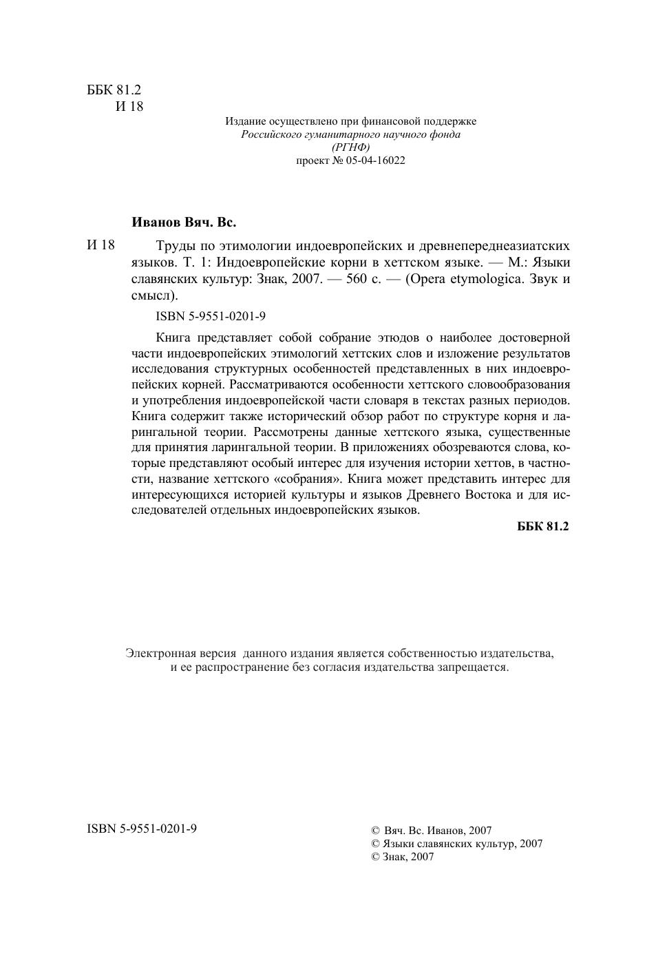 Книга представляет собой собрание этюдов о наиболее достоверной части индоевропейских этимологии хеттских слов и изложение результатов исследования структурных особенностей представленных в них индоевропейских корней. Рассматриваются особенности хеттского словообразования и употребления индоевропейской части словаря в текстах разных периодов. Книга содержит также исторический обзор работ по структуре корня и ларингальной теории. Рассмотрены данные хеттского языка, существенные для принятия ларингальной теории. В приложениях обозреваются слова, которые представляют особый интерес для изучения истории хеттов, в частности, название хеттского "собрания". Книга может представить интерес для интересующихся историей культуры и языков Древнего Востока и для исследователей отдельных индоевропейских языков.