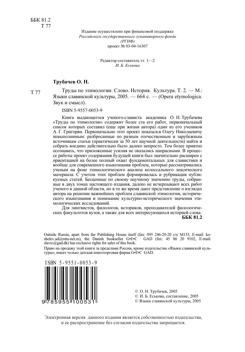 Книга выдающегося ученого-слависта академика О. Н. Трубачева "Труды по этимологии" содержит более ста его работ, первоначально список которых составил (еще при жизни автора) один из его учеников А. Г. Григорян. Первоначально этот проект показался Олегу Николаевичу невыполнимым: разбросанные по разным отечественным и зарубежным источникам статьи (практически за 50 лет научной деятельности) найти и собрать воедино действительно было далеко непросто. Тем более приятно осознавать, что приложенные усилия не оказались напрасными. В процессе работы проект содержания будущей книги был значительно расширен с ориентацией на более полный охват фундаментальных для славистики и вообще для современного языкознания проблем, которые рассматривались ученым на фоне этимологического анализа колоссального лексического материала. С учетом этих проблем формировалась и рубрикация публикуемых статей. Бесценные по своему научному значению труды, собранные в двух томах настоящего издания, далеко не исчерпывают всех работ ученого в данной области, но в тоже время дают представление о взглядах автора на решение важнейших проблем славянской этимологии, исторического языкознания и понимание культурно-исторического значения этимологических исследований. Для лингвистов, филологов, историков, преподавателей филологических факультетов вузов, а также для всех интересующихся историей слова.
