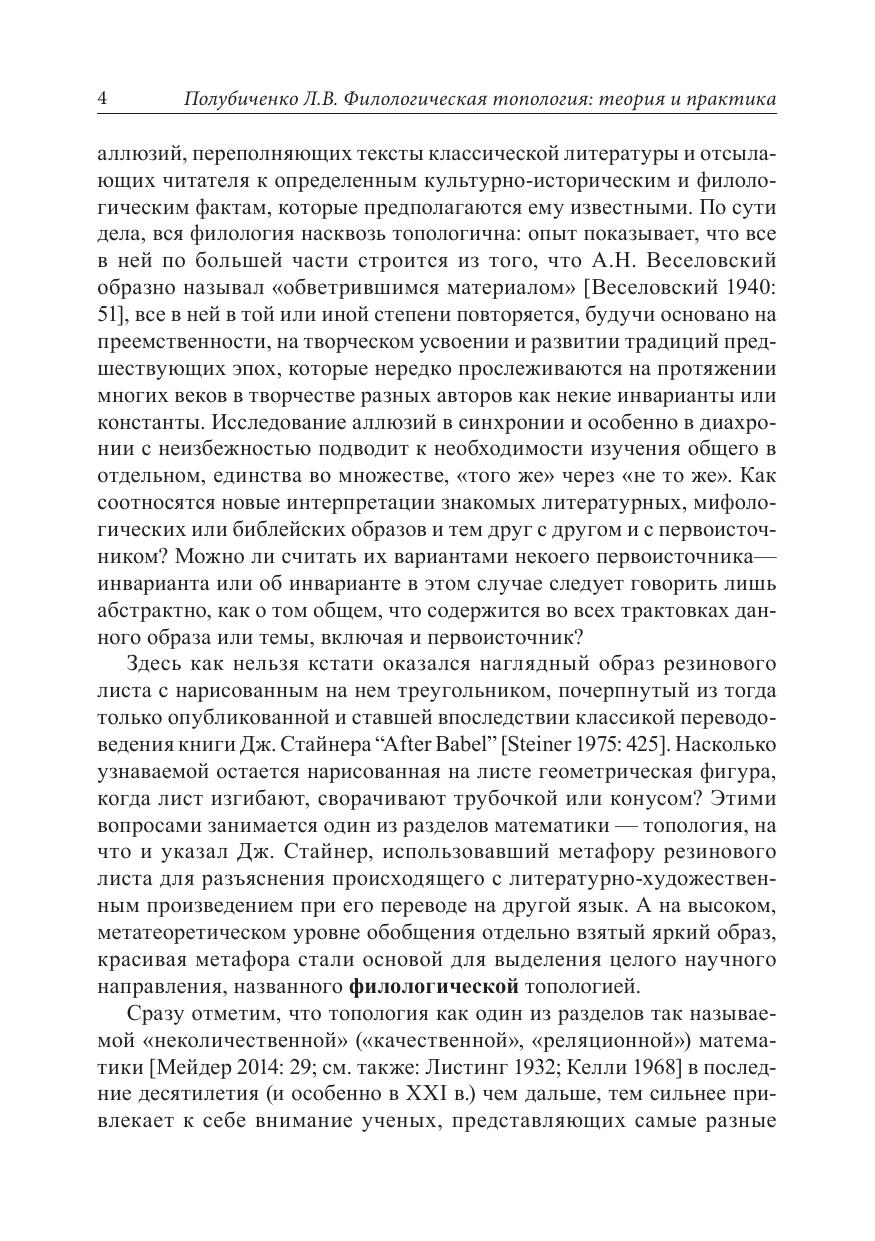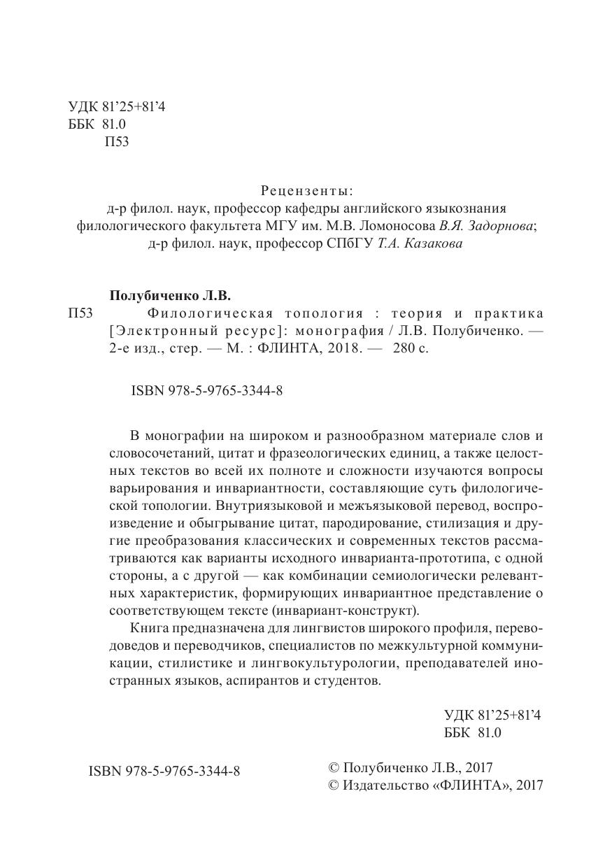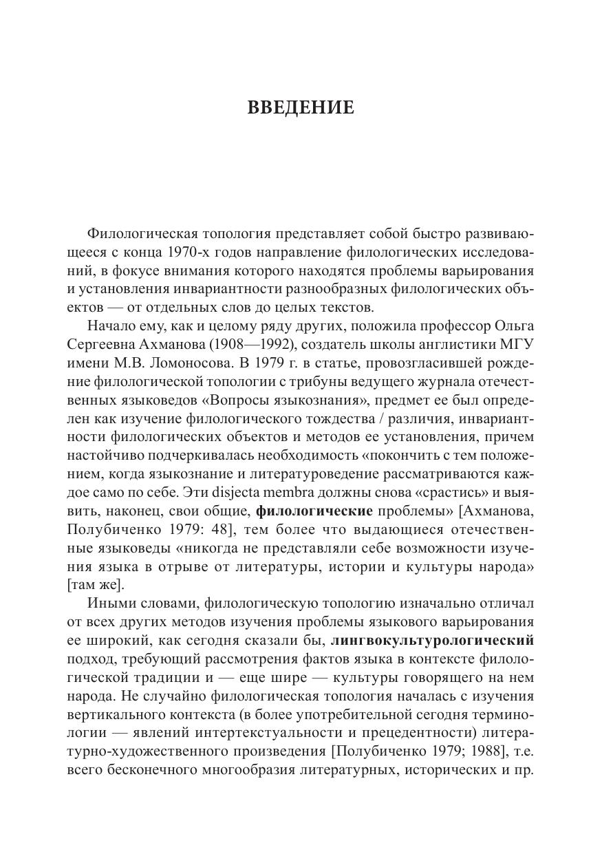 В монографии на широком и разнообразном материале слов и словосочетаний, цитат и фразеологических единиц, а также целостных текстов во всей их полноте и сложности изучаются вопросы варьирования и инвариантности, составляющие суть филологической топологии. Внутриязыковой и межъязыковой перевод, воспроизведение и обыгрывание цитат, пародирование, стилизация и другие преобразования классических и современных текстов рассматриваются как варианты исходного инварианта-прототипа, с одной стороны, а с другой — как комбинации семиологически релевантных характеристик, формирующих инвариантное представление о соответствующем тексте (инвариант-конструкт).