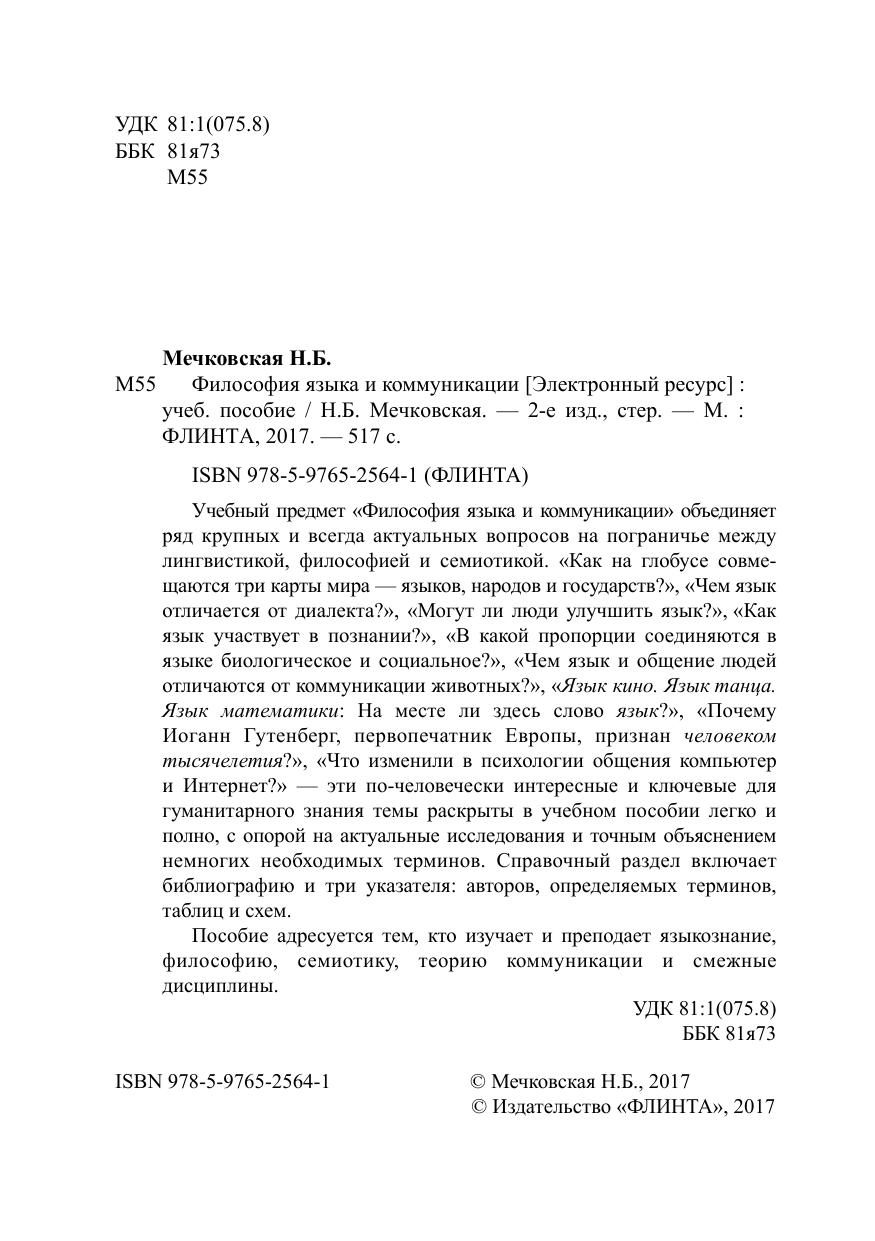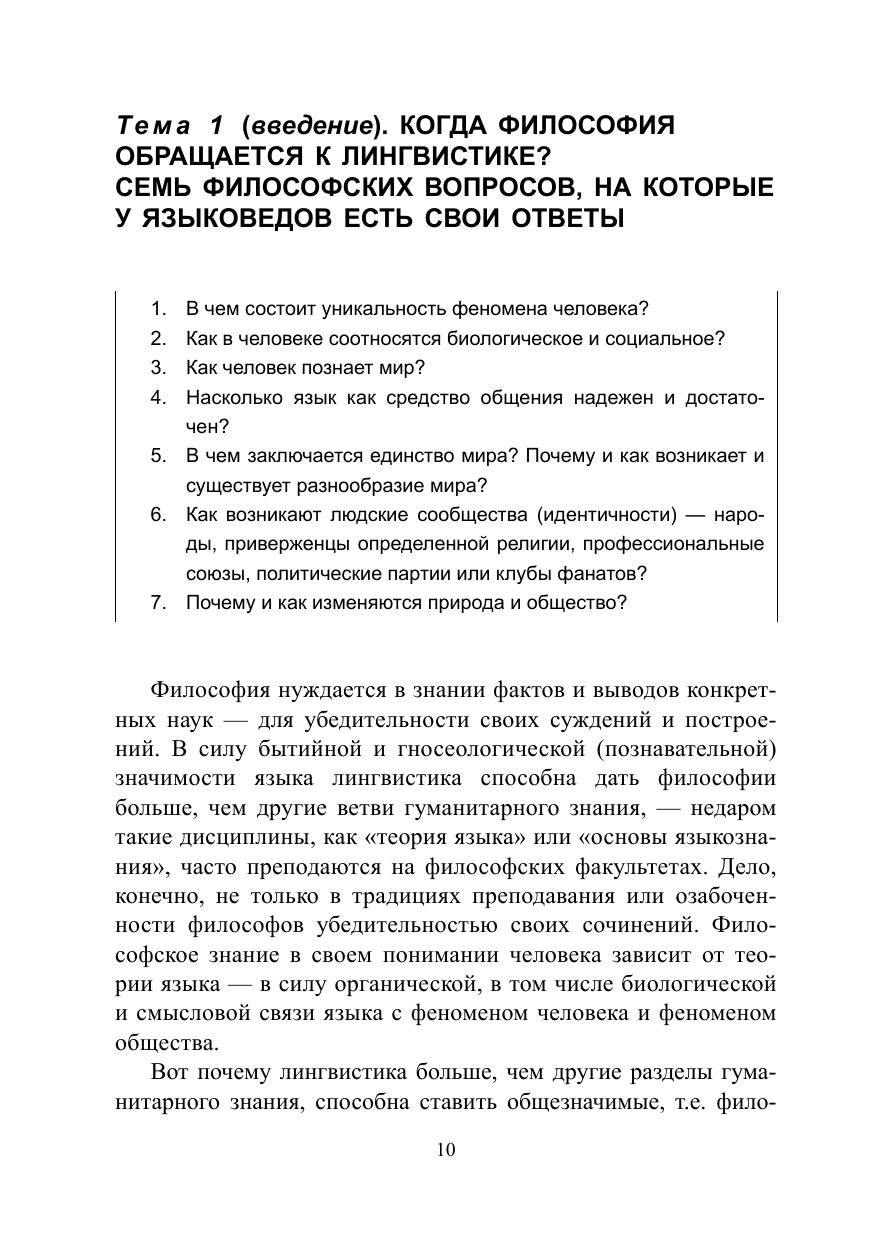 Учебный предмет «Философия языка и коммуникации» объединяет ряд крупных и всегда актуальных вопросов на пограничье между лингвистикой, философией и семиотикой. «Как на глобусе совмещаются три карты мира — языков, народов и государств?», «Чем язык отличается от диалекта?», «Могут ли люди улучшить язык?», «Как язык участвует в познании?», «В какой пропорции соединяются в языке биологическое и социальное?», «Чем язык и общение людей отличаются от коммуникации животных?», «Язык кино. Язык танца. Язык математики: На месте ли здесь слово язык?», «Почему Иоганн Гутенберг, первопечатник Европы, признан человеком тысячелетия?», «Что изменили в психологии общения компьютер и Интернет?» — эти по-человечески интересные и ключевые для гуманитарного знания темы раскрыты в учебном пособии легко и полно, с опорой на актуальные исследования и точным объяснением немногих необходимых терминов. Справочный раздел включает библиографию и три указателя: авторов, определяемых терминов, таблиц и схем.