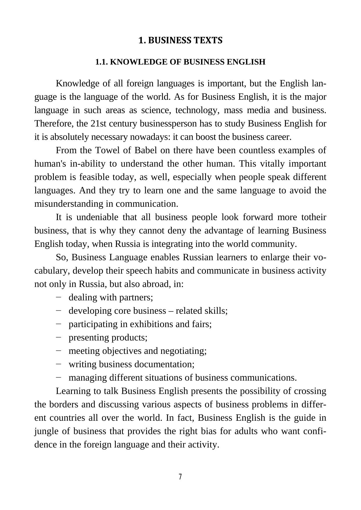 Данное учебное пособие написано в соответствии с программой по иностранным языкам для неязыковых факультетов. Цель – обучение различным видам чтения специальной литературы, владение самой необходимой современной лексикой для формирования навыков устной речи и письма. Эффективное практическое овладение языком обеспечивается предложенной системой лингвокоммуникативных заданий, упражнений, стимулирующих интерес студентов и их теоретическую активность. Успешное усвоение дополнительного грамматического материала повысит гносеологический компонент лингвокоммуникативной компетентности студентов и показатели культуры студентов как будущих профессиональных специалистов. Учебное пособие поможет расширить знания студентов по бизнес- этике и культуре, окажет практическую помощь лицам, собирающимся работать в области внешней торговли.