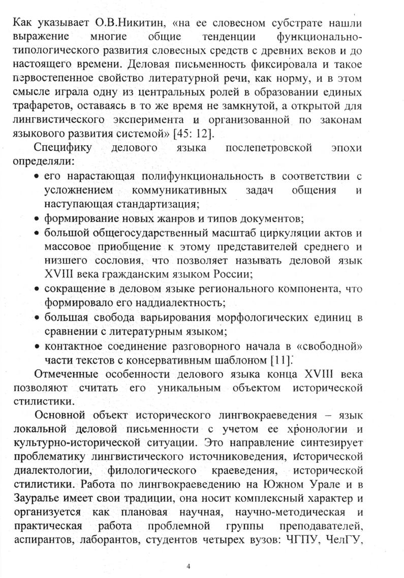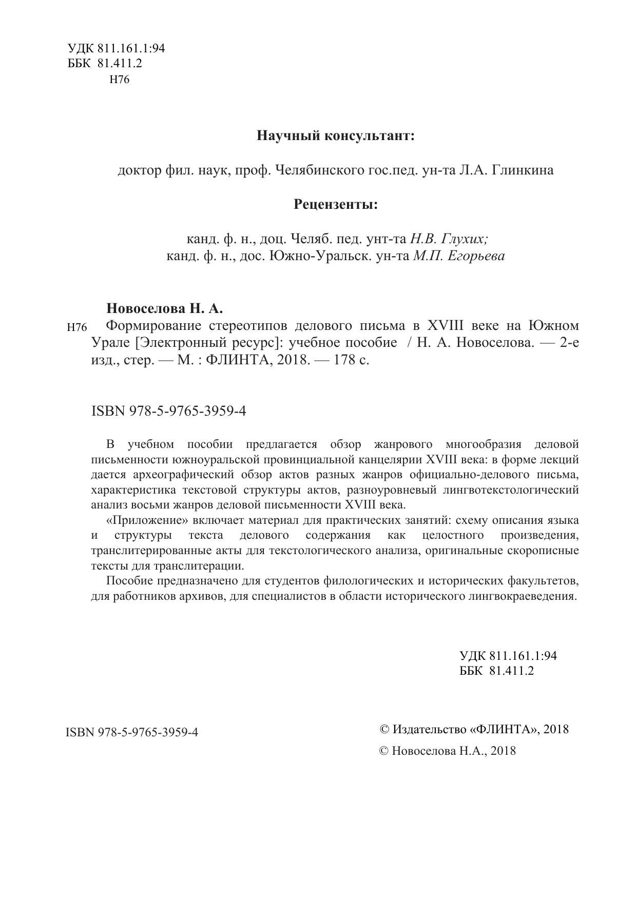 В учебном пособии предлагается обзор жанрового многообразия деловой письменности южноуральской провинциальной канцелярии XVIII века: в форме лекций дается археографический обзор актов разных жанров официально-делового письма, характеристика текстовой структуры актов, разноуровневый лингвотекстологический анализ восьми жанров деловой письменности XVIII века. «Приложение» включает материал для практических занятий: схему описания языка и структуры текста делового содержания как целостного произведения, транслитерированные акты для текстологического анализа, оригинальные скорописные тексты для транслитерации. Пособие предназначено для студентов филологических и исторических факультетов, для работников архивов, для специалистов в области исторического лингвокраеведения.