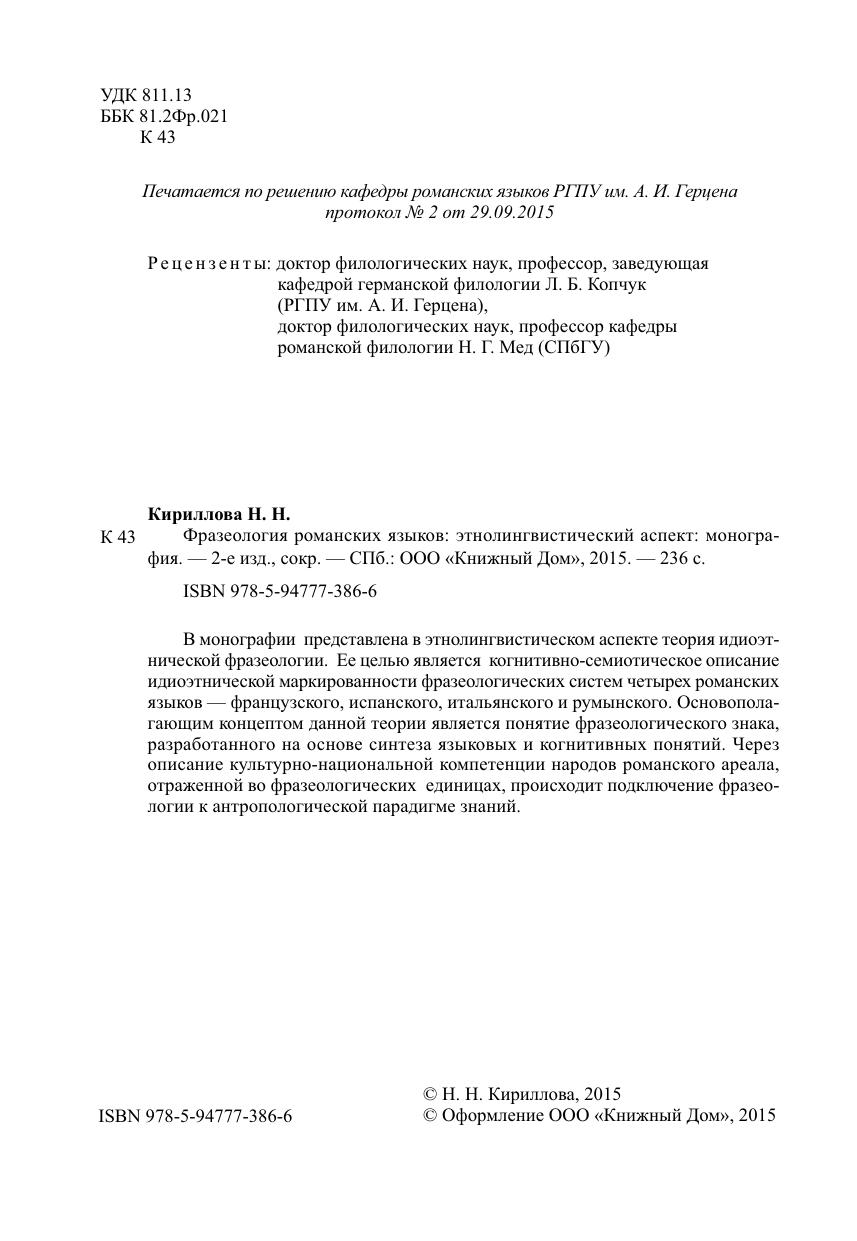 В монографии представлена в этнолингвистическом аспекте теория идиоэтнической фразеологии. Ее целью является когнитивно-семиотическое описание идиоэтнической маркированности фразеологических систем четырех романских языков — французского, испанского, итальянского и румынского. Основополагающим концептом данной теории является понятие фразеологического знака, разработанного на основе синтеза языковых и когнитивных понятий. Через описание культурно-национальной компетенции народов романского ареала, отраженной во фразеологических единицах, происходит подключение фразеологии к антропологической парадигме знаний.