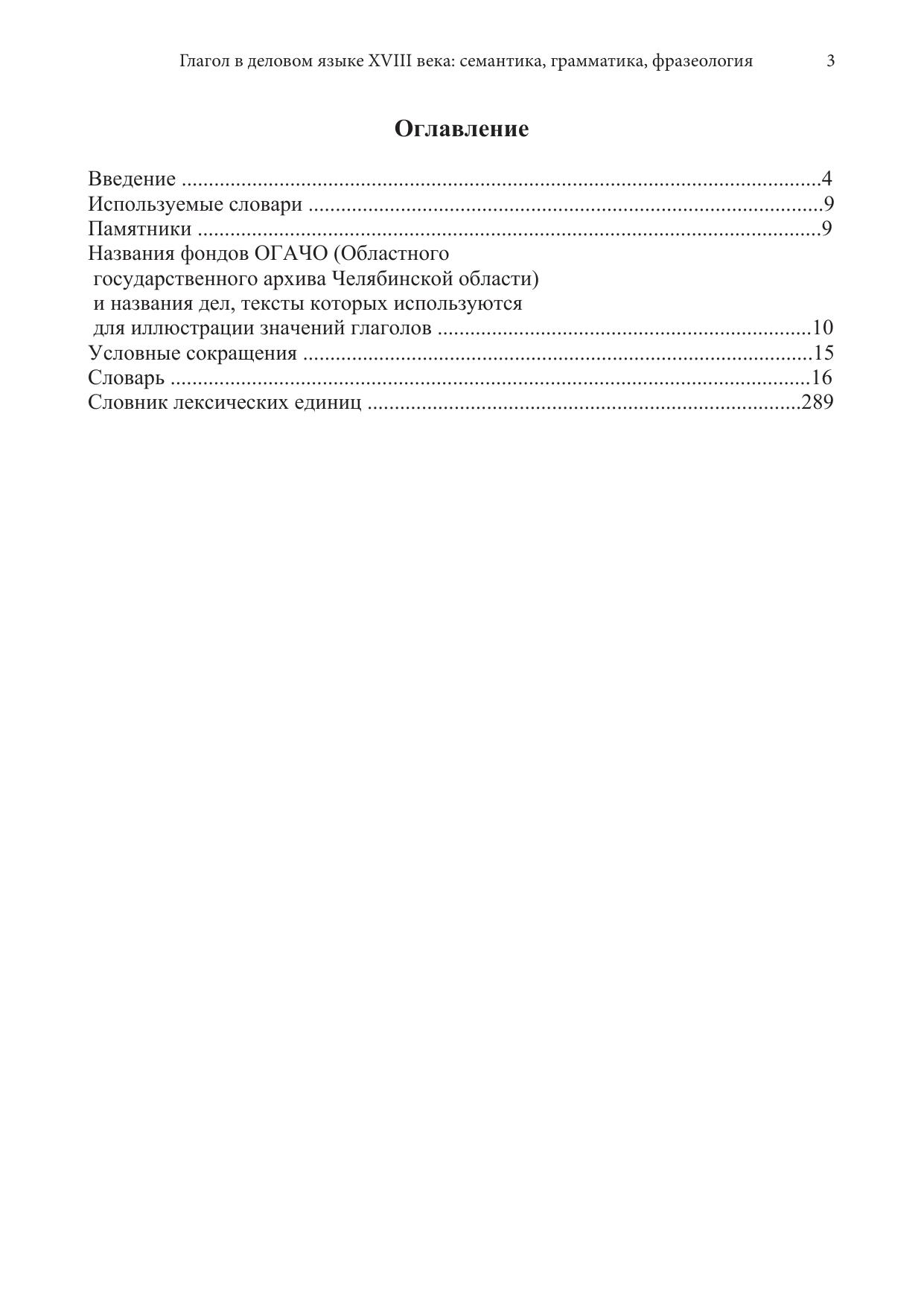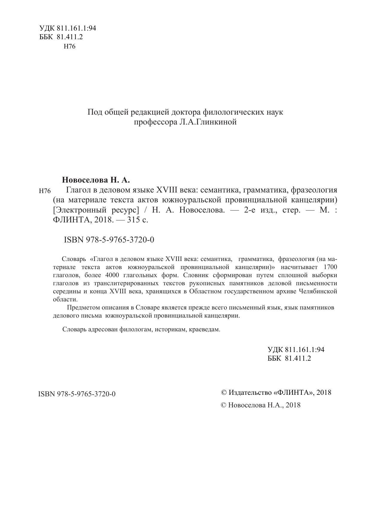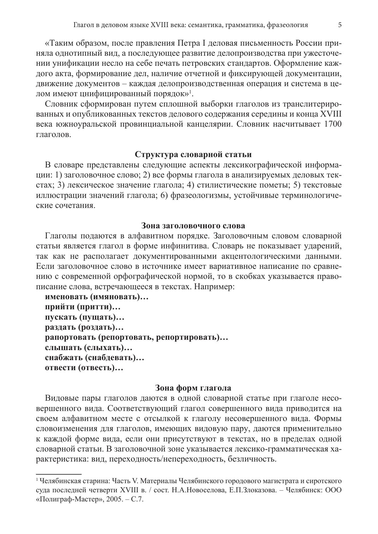Словарь «Глагол в деловом языке XVIII века: семантика, грамматика, фразеология (на материале текста актов южноуральской провинциальной канцелярии)» насчитывает 1700 глаголов, более 4000 глагольных форм. Словник сформирован путем сплошной выборки глаголов из транслитерированных текстов рукописных памятников деловой письменности середины и конца XVIII века, хранящихся в Областном государственном архиве Челябинской области. Предметом описания в Словаре является прежде всего письменный язык, язык памятников делового письма южноуральской провинциальной канцелярии. Словарь адресован филологам, историкам, краеведам.