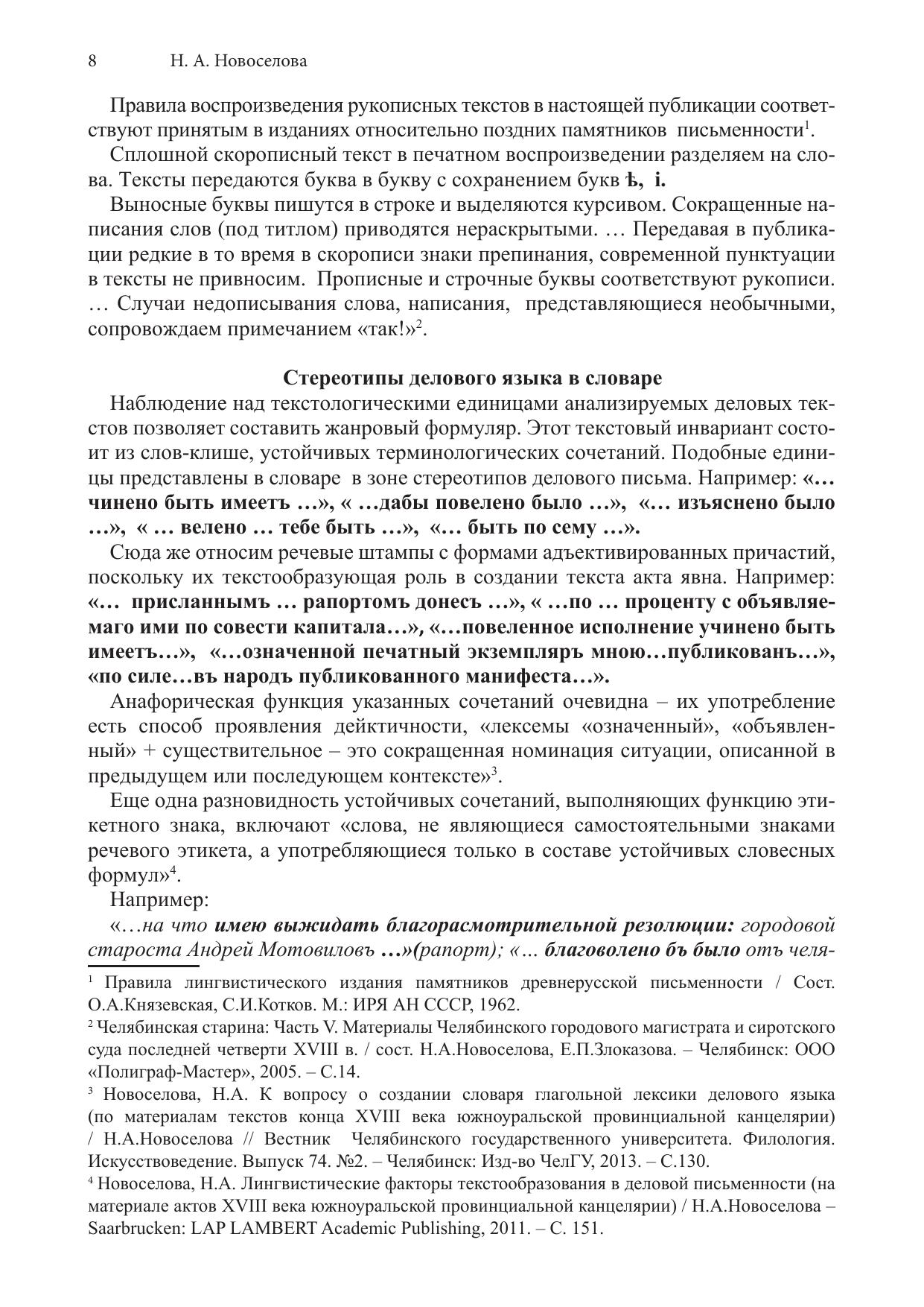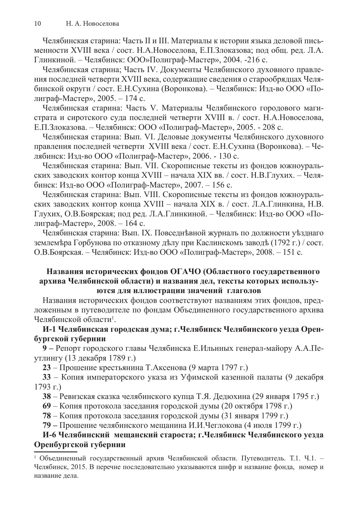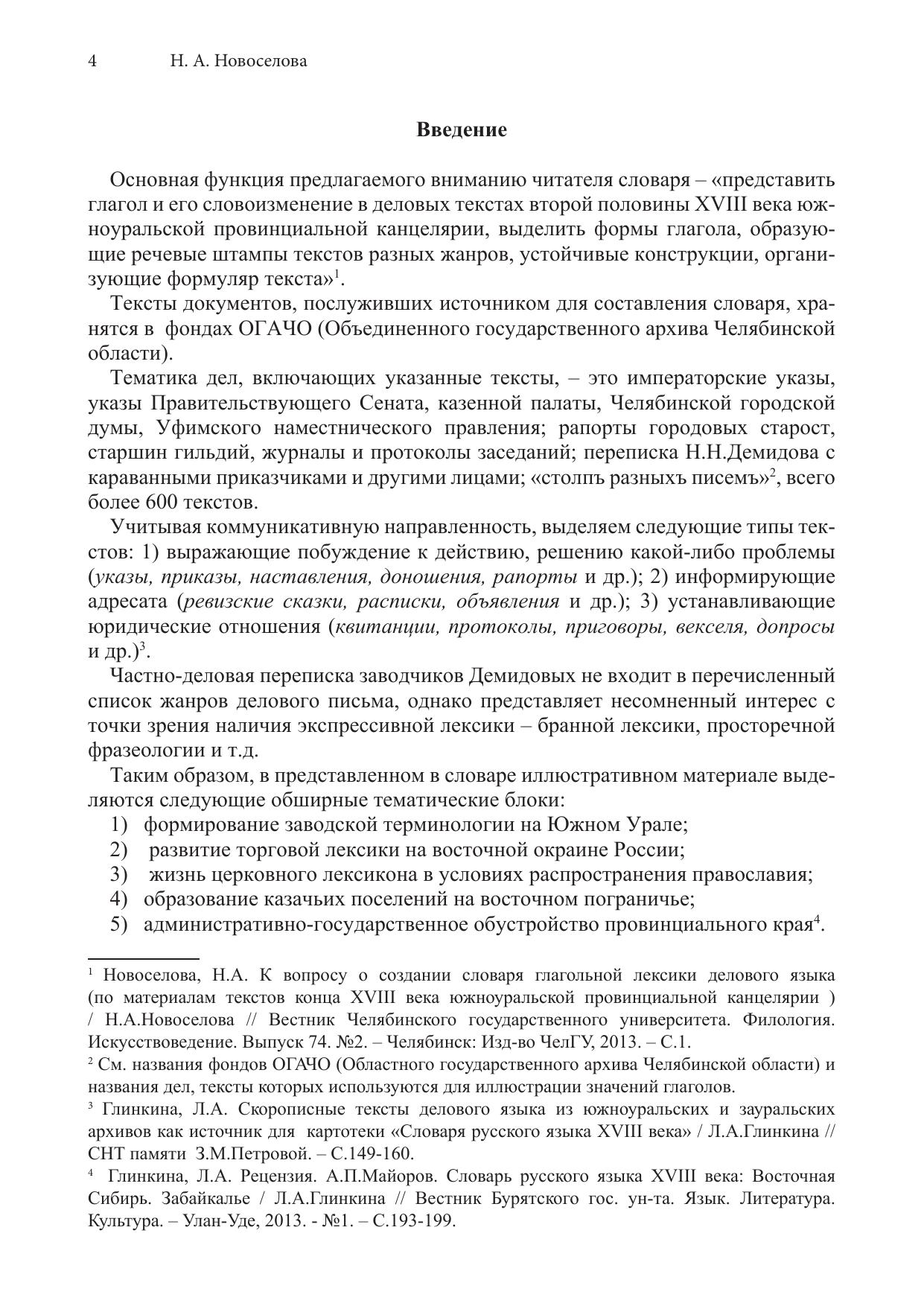 Словарь «Глагол в деловом языке XVIII века: семантика, грамматика, фразеология (на материале текста актов южноуральской провинциальной канцелярии)» насчитывает 1700 глаголов, более 4000 глагольных форм. Словник сформирован путем сплошной выборки глаголов из транслитерированных текстов рукописных памятников деловой письменности середины и конца XVIII века, хранящихся в Областном государственном архиве Челябинской области. Предметом описания в Словаре является прежде всего письменный язык, язык памятников делового письма южноуральской провинциальной канцелярии. Словарь адресован филологам, историкам, краеведам.