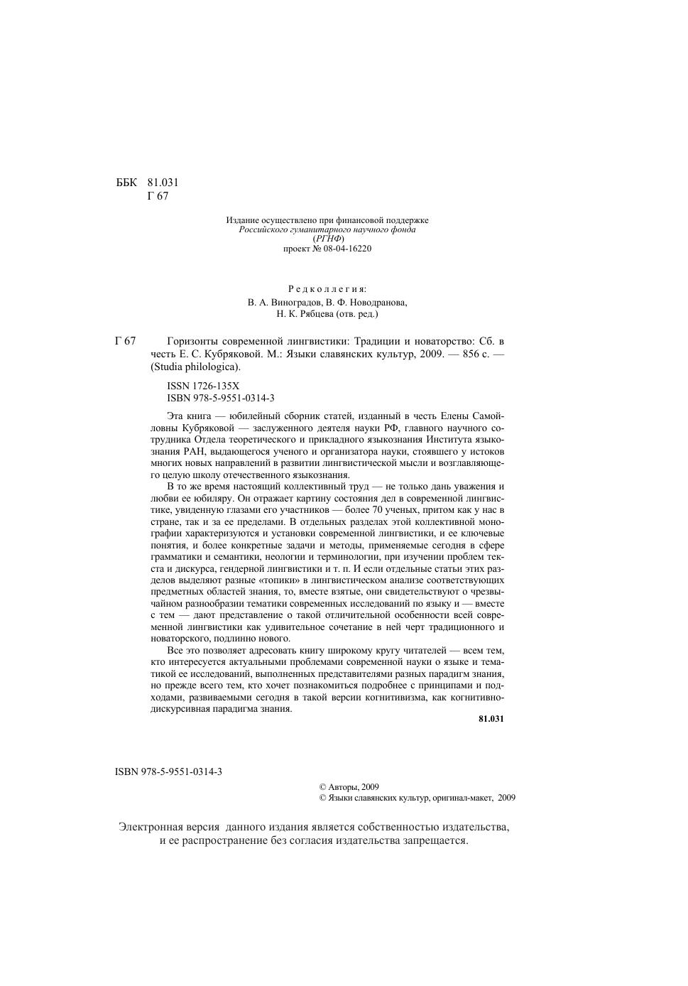 Эта книга - юбилейный сборник статей, изданный в честь Елены Самойловны Кубряковой - заслуженного деятеля науки РФ, главного научного сотрудника Отдела теоретического и прикладного языкознания Института языкознания РАН, выдающегося ученого и организатора науки, стоявшего у истоков многих новых направлений в развитии лингвистической мысли и возглавляющего целую школу отечественного языкознания. Коллективная монография отражает картину состояния дел в современной лингвистике, увиденную глазами его участников - более 70 ученых, притом как у нас в стране, так и за ее пределами. В отдельных разделах этого сборника характеризуются и установки современной лингвистики, и ее ключевые понятия, и более конкретные задачи и методы, применяемые сегодня в сфере грамматики и семантики, неологии и терминологии, при изучении проблем текста и дискурса, гендерной лингвистики и т.п. Адресована широкому кругу читателей - всем тем, кто интересуется актуальными проблемами современной науки о языке и тематикой ее исследований, выполненных представителями разных парадигм знания.