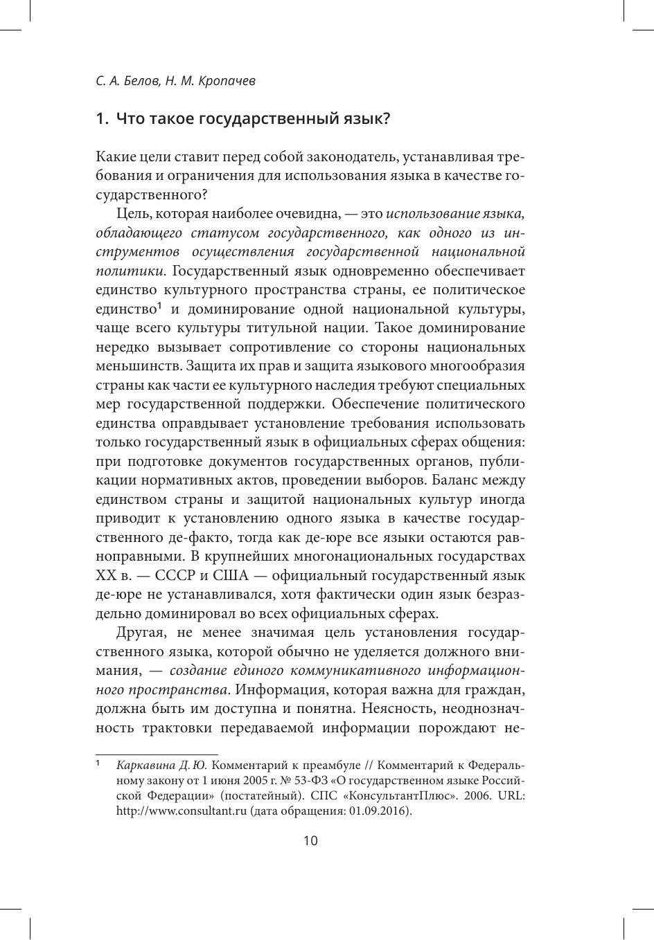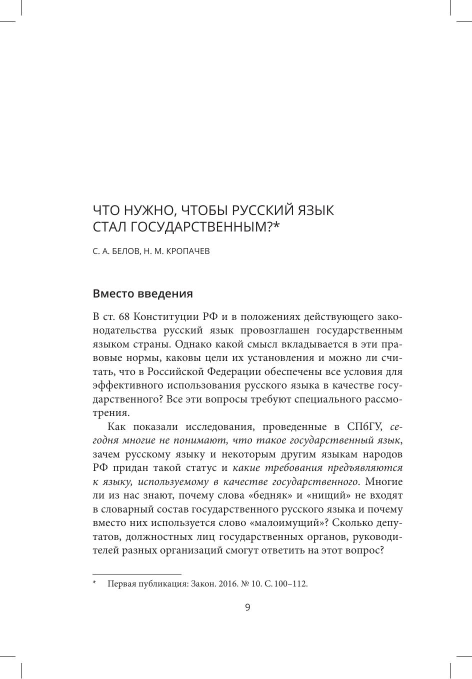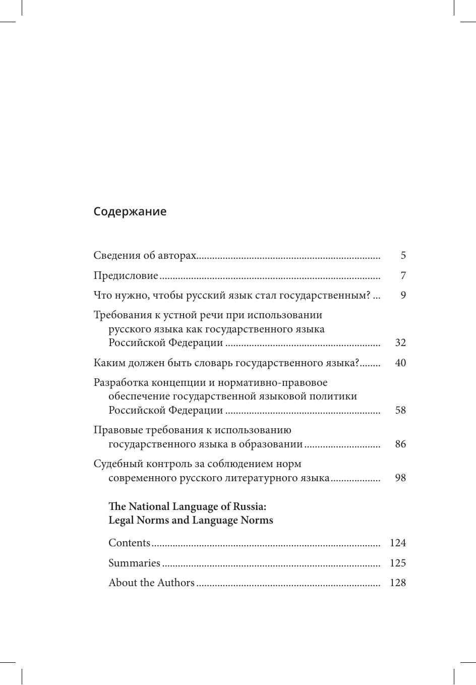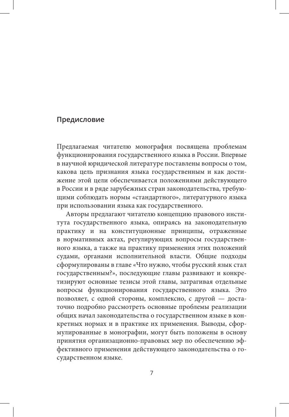 Книга предназначена для широкого круга читателей: государственных служащих, обеспечивающих применение и реализацию законодательства о государственном языке, специалистов в области лингвистики и права, а также для всех, кому небезразличны проблемы функционирования русского языка как государственного языка нашей страны.