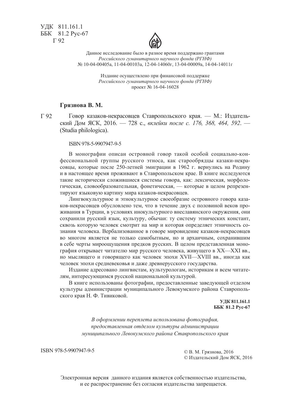 В монографии описан островной говор такой особой социально-конфессиональной группы русского этноса, как старообрядцы казаки-некрасовцы. которые после 250-летней эмиграции в 1962 г. вернулись на Родину и в настоящее время проживают в Ставропольском крае. В книге исследуются такие исторически сложившиеся системы говора, как: лексическая, морфологическая, словообразовательная, фонетическая, - которые в целом репрезентируют языковую картину мира казаков-некрасовцев. Лингвокультурное и этнокультурное своеобразие островного говора казаков-некрасовцев обусловлено тем. что в течение двух с половиной веков проживания в Турции, в условиях инокультурного внеславянского окружения, они сохранили русский язык, культуру, обычаи: ту систему этнических констант, сквозь которую человек смотрит на мир и которая определяет этничность сознания человека. Вербализованное в говоре мировидение казаков-некрасовцев во многом является не только самобытным, но и архаичным, сохранившим в себе черты мироощущения предков русских. В целом представленная монография открывает читателю мир русского человека, живущего в XX-XXI вв., но мыслящего и говорящего как человек эпохи XVII-XVIII вв,. иногда как человек эпохи средневековья и даже древнерусского государства. В книге использованы фотографии, предоставленные заведующей отделом культуры администрации муниципального Левокумского района Ставропольского края Н.Ф. Тивиковой. Издание адресовано лингвистам, культурологам, историкам и всем читателям, интересующимся русской национальной культурой.
