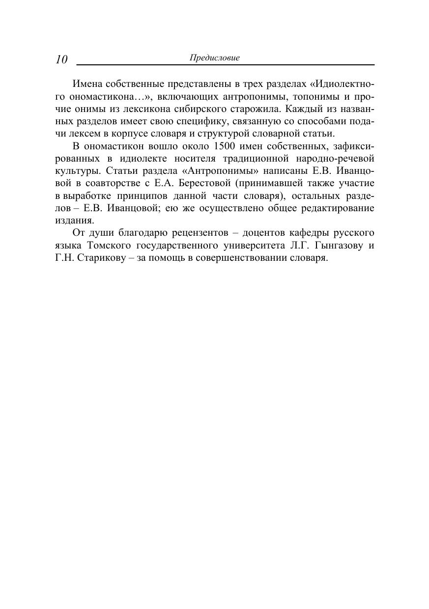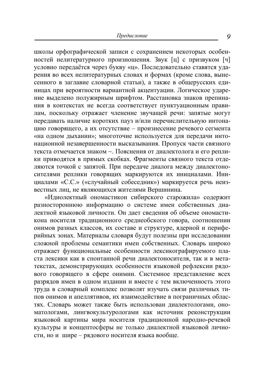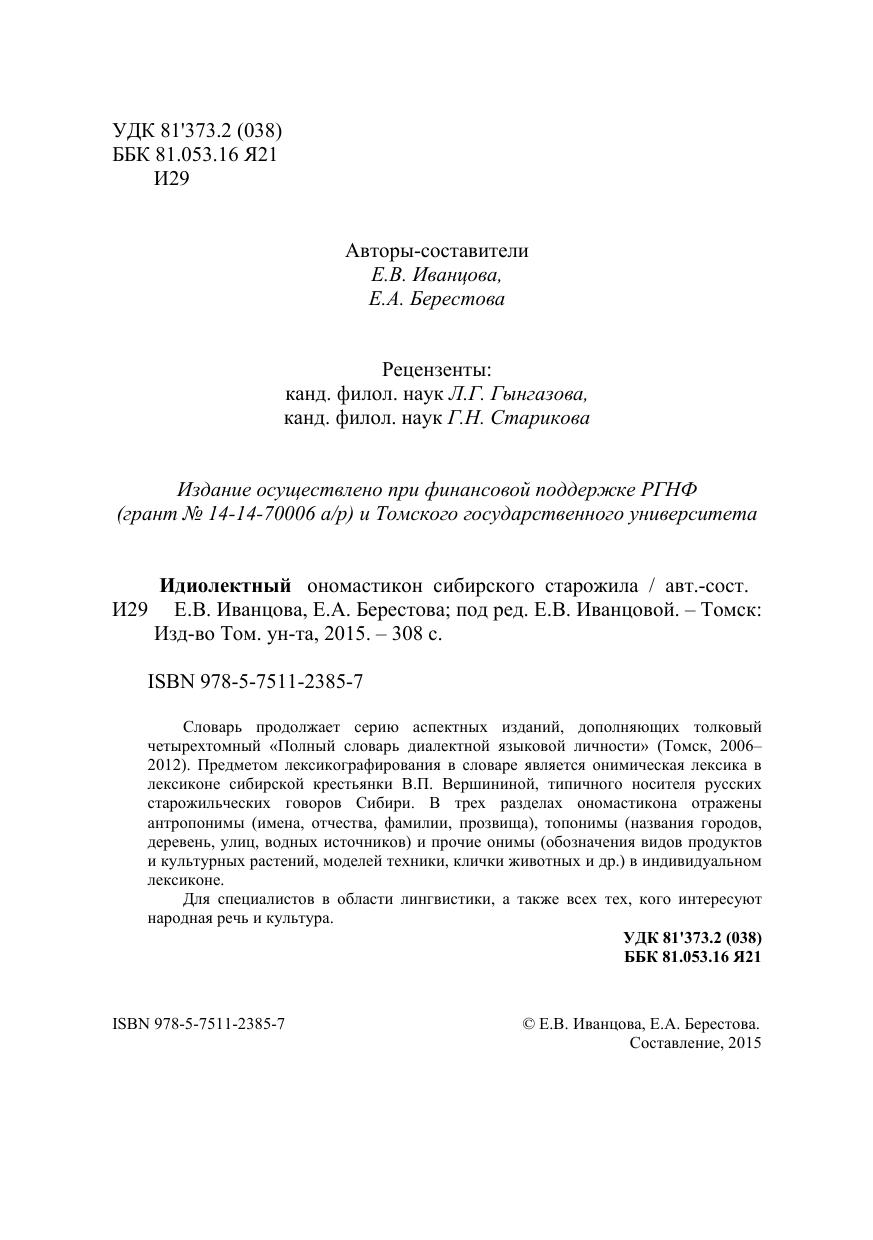 Словарь продолжает серию аспектных изданий, дополняющих толковый четырехтомный «Полный словарь диалектной языковой личности» (Томск, 2006-2012). Предметом лексикографирования в словаре является онимическая лексика в лексиконе сибирской крестьянки В.П. Вершининой, типичного носителя русских старожильческих говоров Сибири. В трех разделах ономастикона отражены антропонимы (имена, отчества, фамилии, прозвища), топонимы (названия городов, деревень, улиц, водных источников) и прочие онимы (обозначения видов продуктов и культурных растений, моделей техники, клички животных и др.) в индивидуальном лексиконе. Для специалистов в области лингвистики, а также всех тех, кого интересуют народная речь и культура.