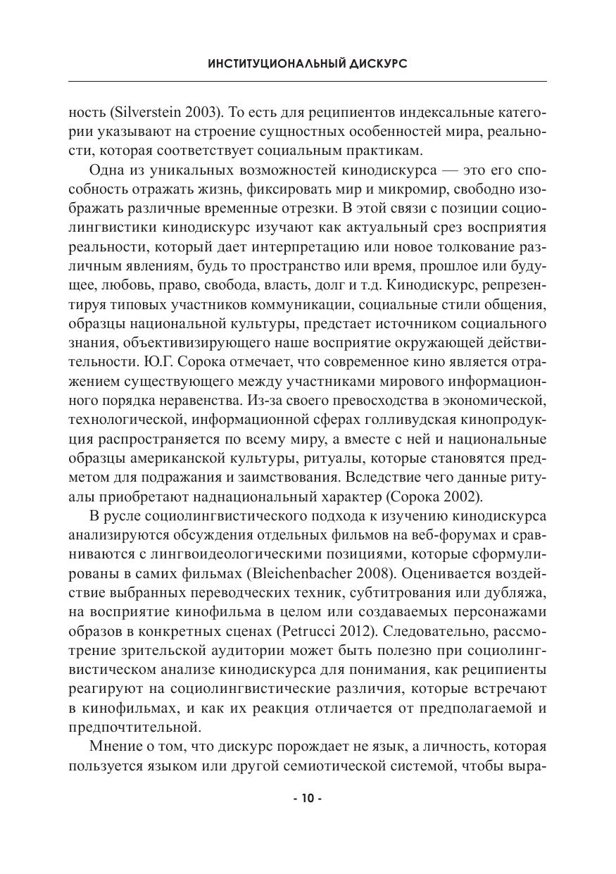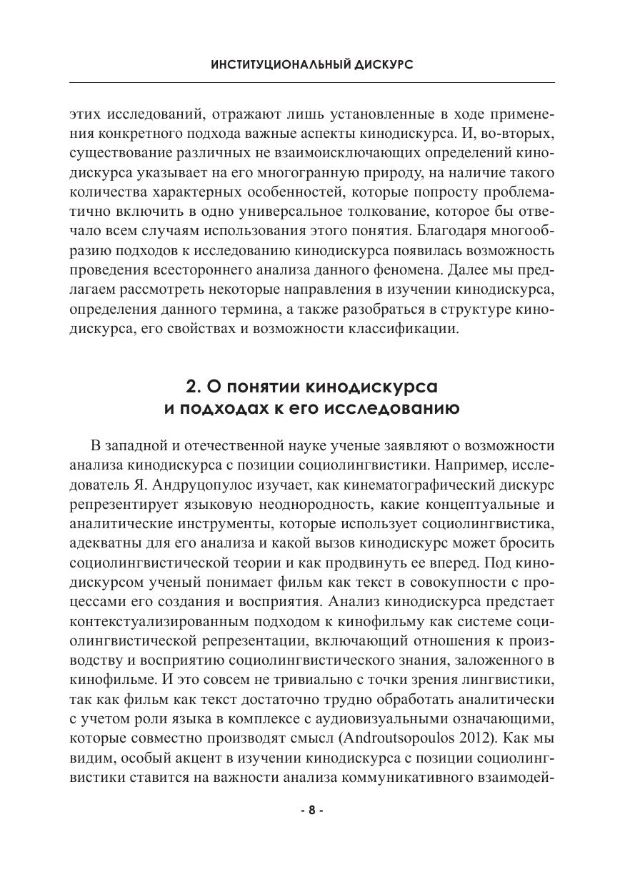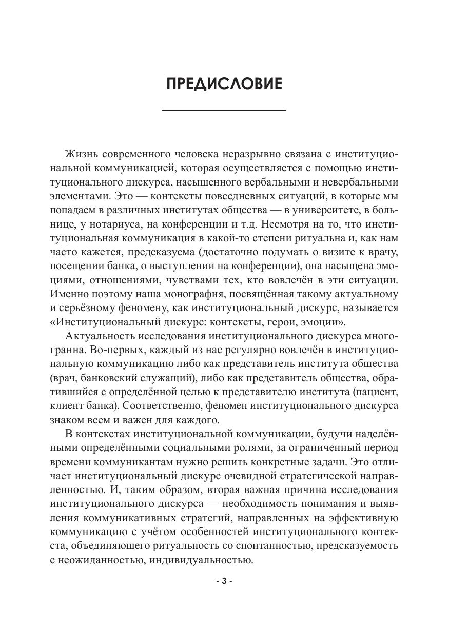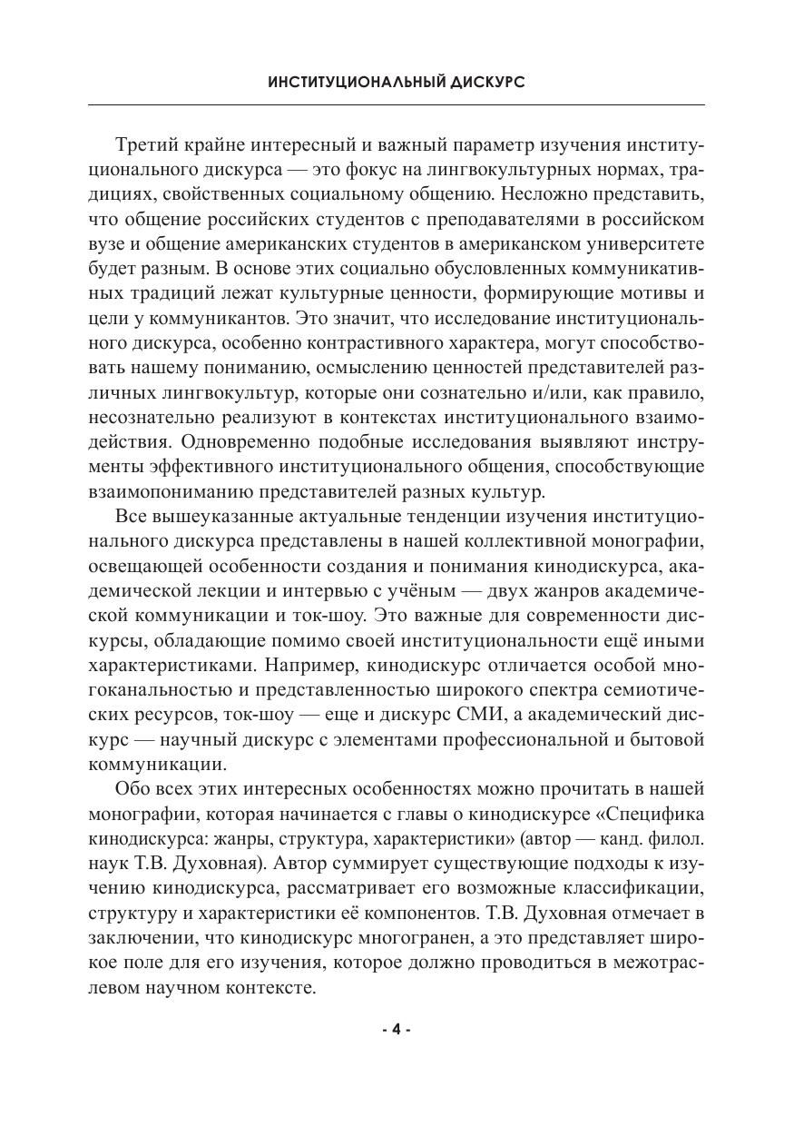 Монография посвящена исследованию нескольких типов институционального дискурса, а именно: кинодискурса, жанров академического дискурса (интервью и лекции), ток-шоу. Авторы анализируют эмпирический материал, взятый из нашей реальности, применяя комплексные междисциплинарные методологии, свойственные эпохе антропоцентризма. Каждая глава рассматривает как общие тенденции конструирования институционального дискурса, так и те, которые характерны