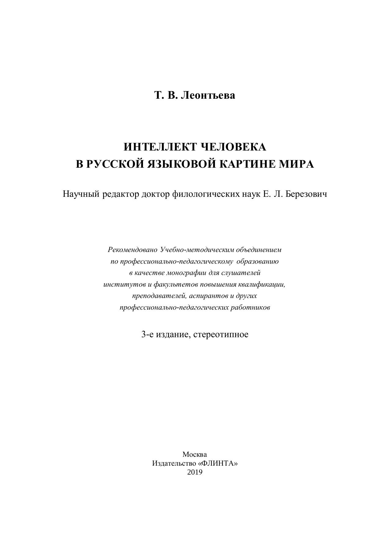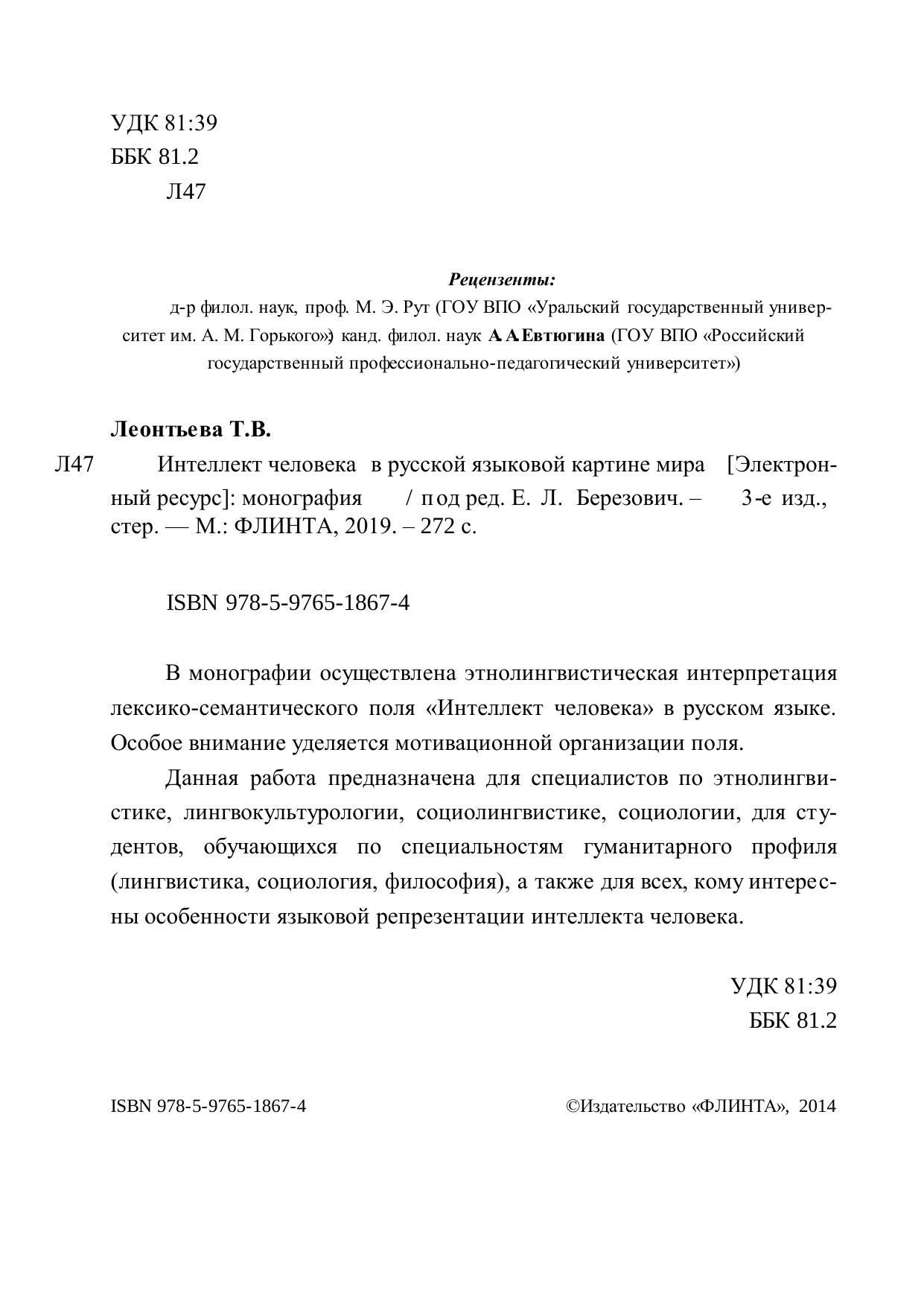 Данная работа предназначена для специалистов по этнолингвистике, лингвокультурологии, социолингвистике, социологии, для студентов, обучающихся по специальностям гуманитарного профиля (лингвистика, социология, философия), а также для всех, кому интере сны особенности языковой репрезентации интеллекта человека.