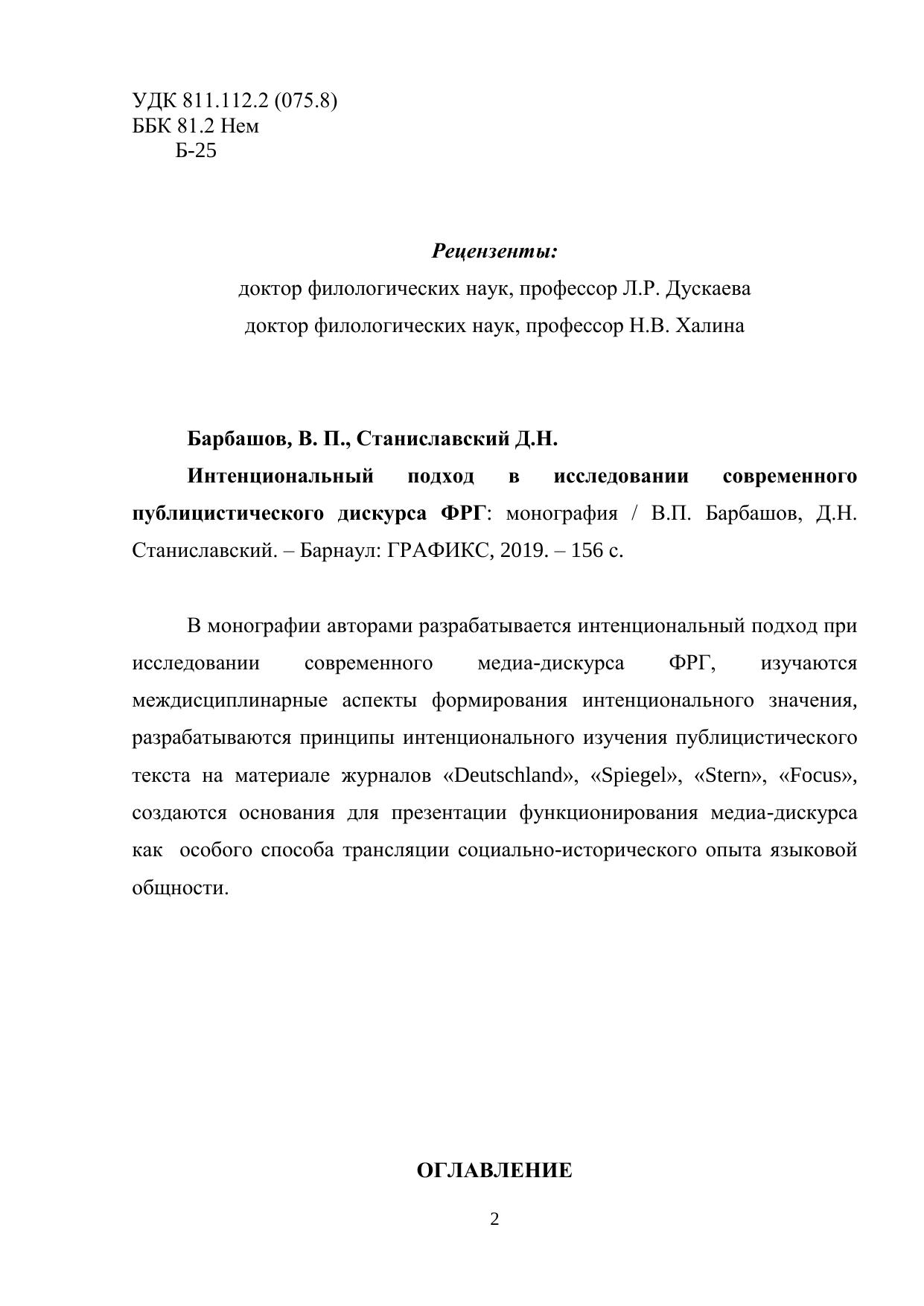 В монографии авторами разрабатывается интенциональный подход при исследовании современного медиа-дискурса ФРГ, изучаются междисциплинарные аспекты формирования интенционального значения, разрабатываются принципы интенционального изучения публицистического текста на материале журналов «Deutschland», «Spiegel», «Stern», «Focus», создаются основания для презентации функционирования медиа-дискурса как особого способа трансляции социально-исторического опыта языковой общности.