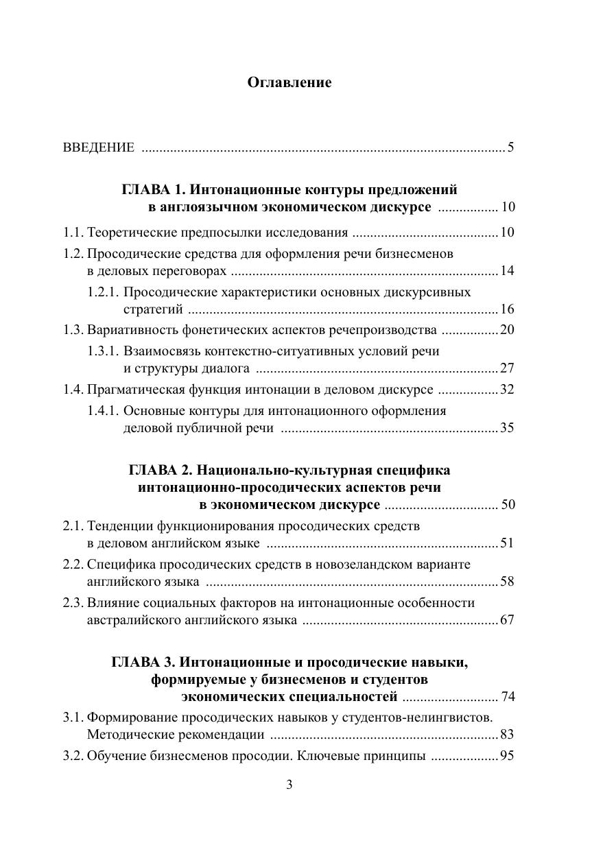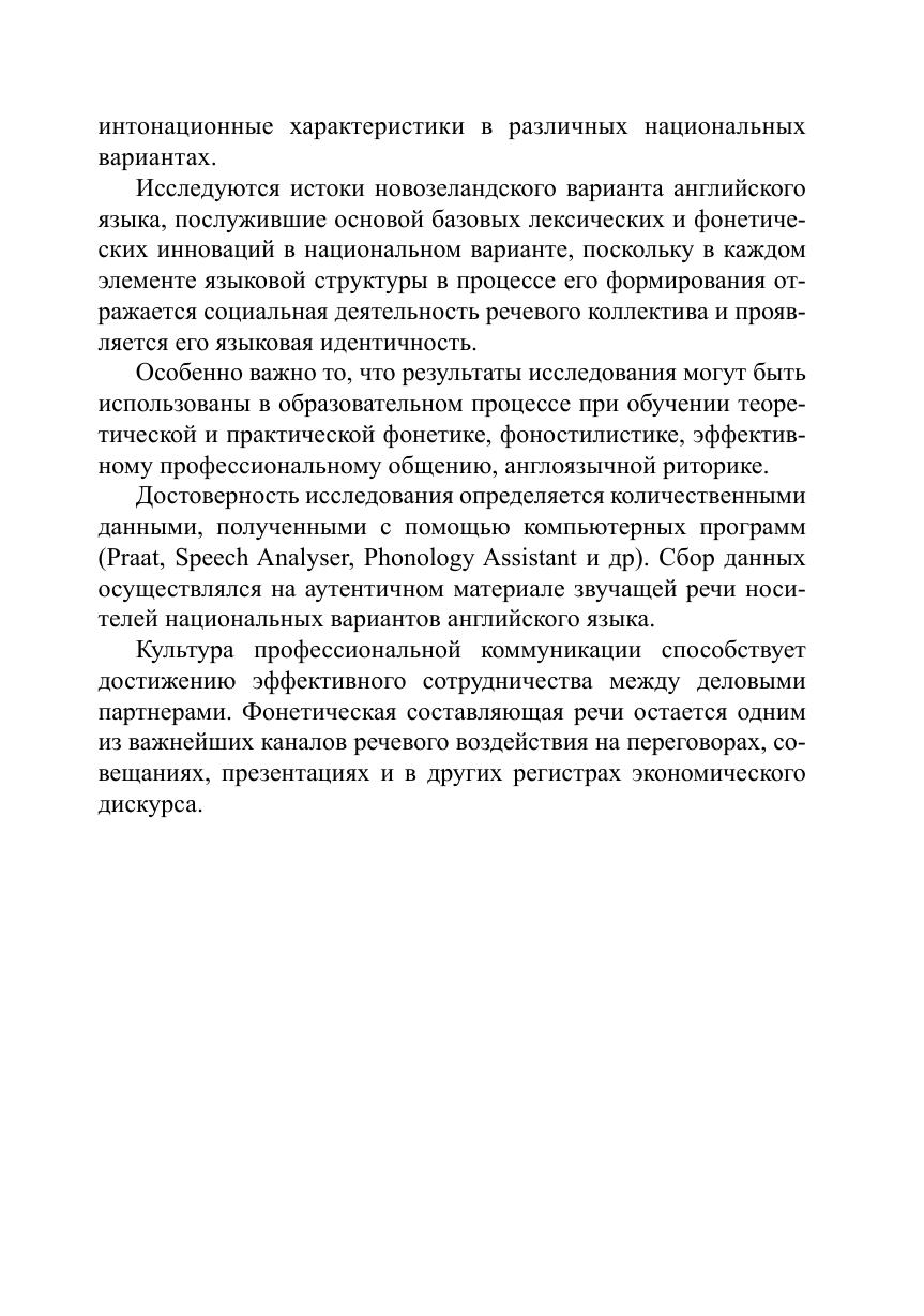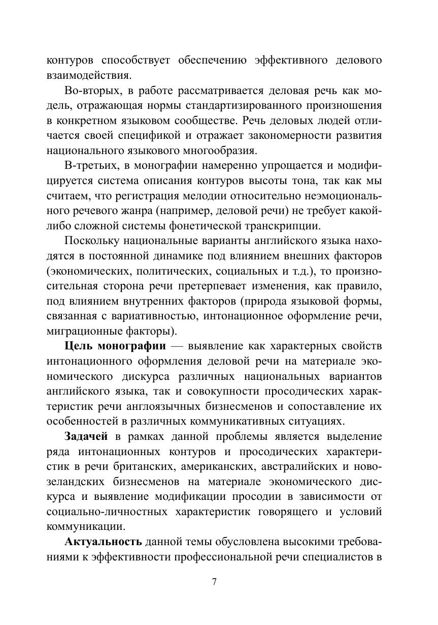 Цель монографии - выявление как характерных свойств интонационного оформления деловой речи на материале экономического дискурса различных национальных вариантов английского языка, так и совокупности просодических характеристик речи англоязычных бизнесменов и сопоставление их особенностей в различных коммуникативных ситуациях. Актуальность темы обусловлена высокими требованиями к эффективности профессиональной речи специалистов в сфере экономики, а также своевременным является изучение звучащей речи в различных национальных вариантах английского языка, поскольку до настоящего времени не проводилось системного сравнения и выделения интонационных контуров в экономическом дискурсе. В исследовании используются методы индукции и дедукции, описания, комплексного анализа интонационных контуров, сплошной выборки, аудиоэксперимента, коммуникативно-прагматического анализа микровидеотекстов, составляющих эмпирическую базу исследования, слуховой анализ предложений, функционирующих в англоязычном экономическом дискурсе, акустический анализ, аудитивный анализ, интервьюирование информантов, метод статистической обработки данных экспериментального материала.