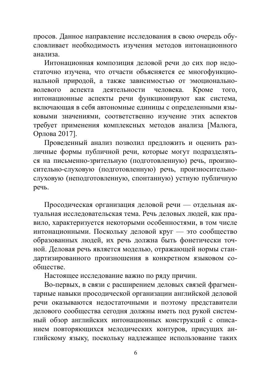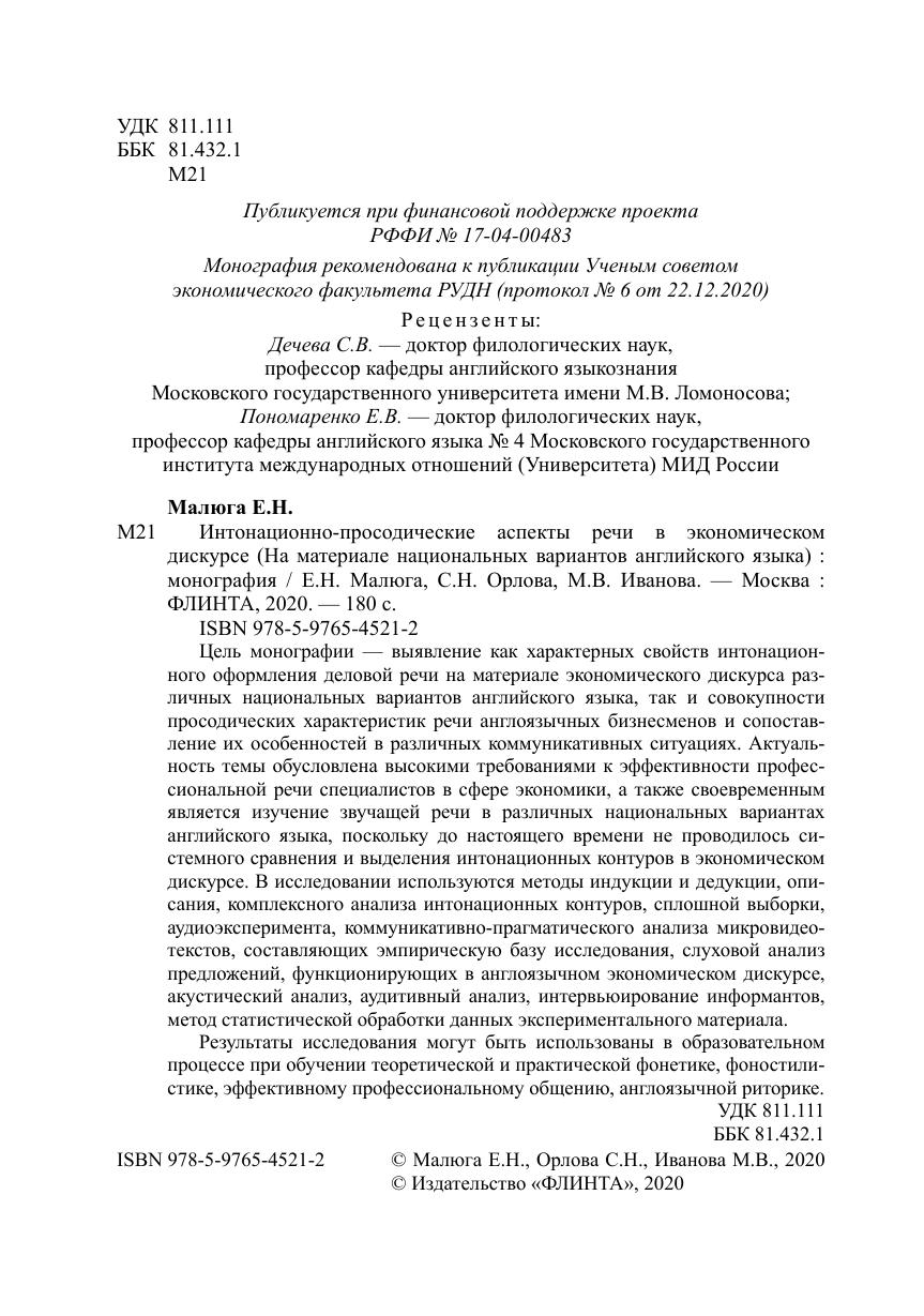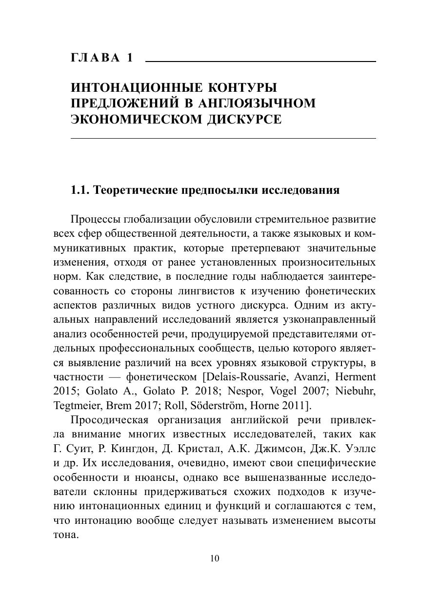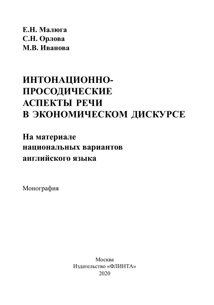 Цель монографии - выявление как характерных свойств интонационного оформления деловой речи на материале экономического дискурса различных национальных вариантов английского языка, так и совокупности просодических характеристик речи англоязычных бизнесменов и сопоставление их особенностей в различных коммуникативных ситуациях. Актуальность темы обусловлена высокими требованиями к эффективности профессиональной речи специалистов в сфере экономики, а также своевременным является изучение звучащей речи в различных национальных вариантах английского языка, поскольку до настоящего времени не проводилось системного сравнения и выделения интонационных контуров в экономическом дискурсе. В исследовании используются методы индукции и дедукции, описания, комплексного анализа интонационных контуров, сплошной выборки, аудиоэксперимента, коммуникативно-прагматического анализа микровидеотекстов, составляющих эмпирическую базу исследования, слуховой анализ предложений, функционирующих в англоязычном экономическом дискурсе, акустический анализ, аудитивный анализ, интервьюирование информантов, метод статистической обработки данных экспериментального материала.