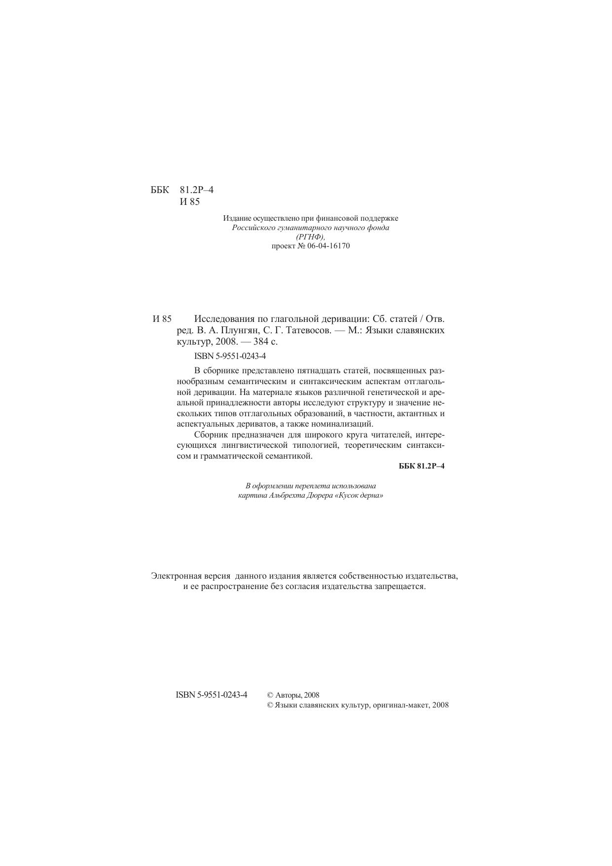 В сборнике представлено пятнадцать статей, посвященных разнообразным семантическим и синтаксическим аспектам отглагольной деривации. На материале языков различной генетической и ареальной принадлежности авторы исследуют структуру и значение нескольких типов отглагольных образований, в частности, актантных и аспектуальных дериватов, а также номинализаций. Сборник предназначен для широкого круга читателей, интересующихся лингвистической типологией, теоретическим синтаксисом и грамматической семантикой.