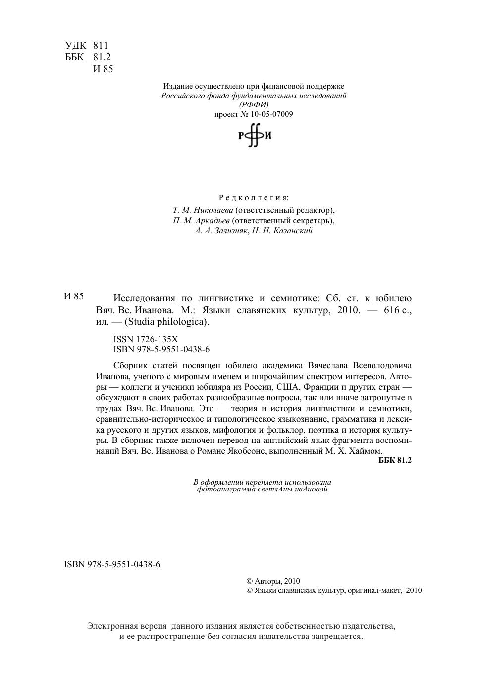 Сборник статей посвящен юбилею академика Вячеслава Всеволодовича Иванова, ученого с мировым именем и широчайшим спектром интересов. Авторы - коллеги и ученики юбиляра из России, США, Франции и других стран - обсуждают в своих работах разнообразные вопросы, так или иначе затронутые в трудах В.В. Иванова. Это - теория и история лингвистики и семиотики, сравнительно-историческое и типологическое языкознание, грамматика и лексика русского и других языков, мифология и фольклор, поэтика и история культуры. В сборник также включен перевод на английский язык фрагмента воспоминаний В.В. Иванова о Романе Якобсоне, выполненный М.Х. Хаймом.