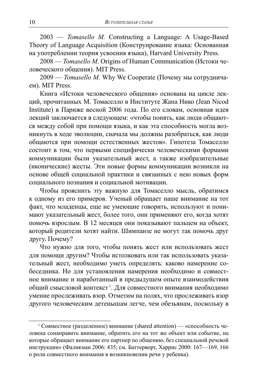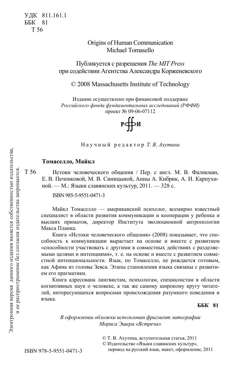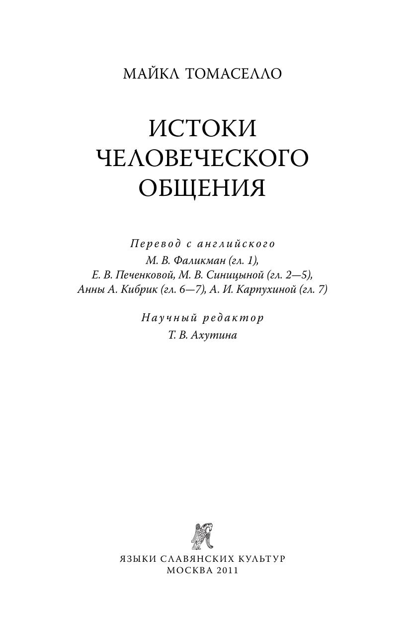 Майкл Томаселло - американский психолог, всемирно известный специалист в области развития коммуникации и кооперации у ребенка и высших приматов, директор Института эволюционной антропологии Макса Планка.Книга "Истоки человеческого общения" (2008) показывает, что способность к коммуникации вырастает на основе и вместе с развитием "способности участвовать с друг ими в совместных действиях с разделяемыми целями и интенциями", т. е. на основе и вместе с развитием совместной интенциональности. Язык, по Томаселло, не рождается готовым, как Афина из головы Зевса. Этапы становления языка связаны с развитием его прагматики. Книга адресована лингвистам, психологам, специалистам в области когнитивных наук о человеке, а так же самому широкому кругу читателей, интересующихся вопросами происхождения разумного поведения и языка.