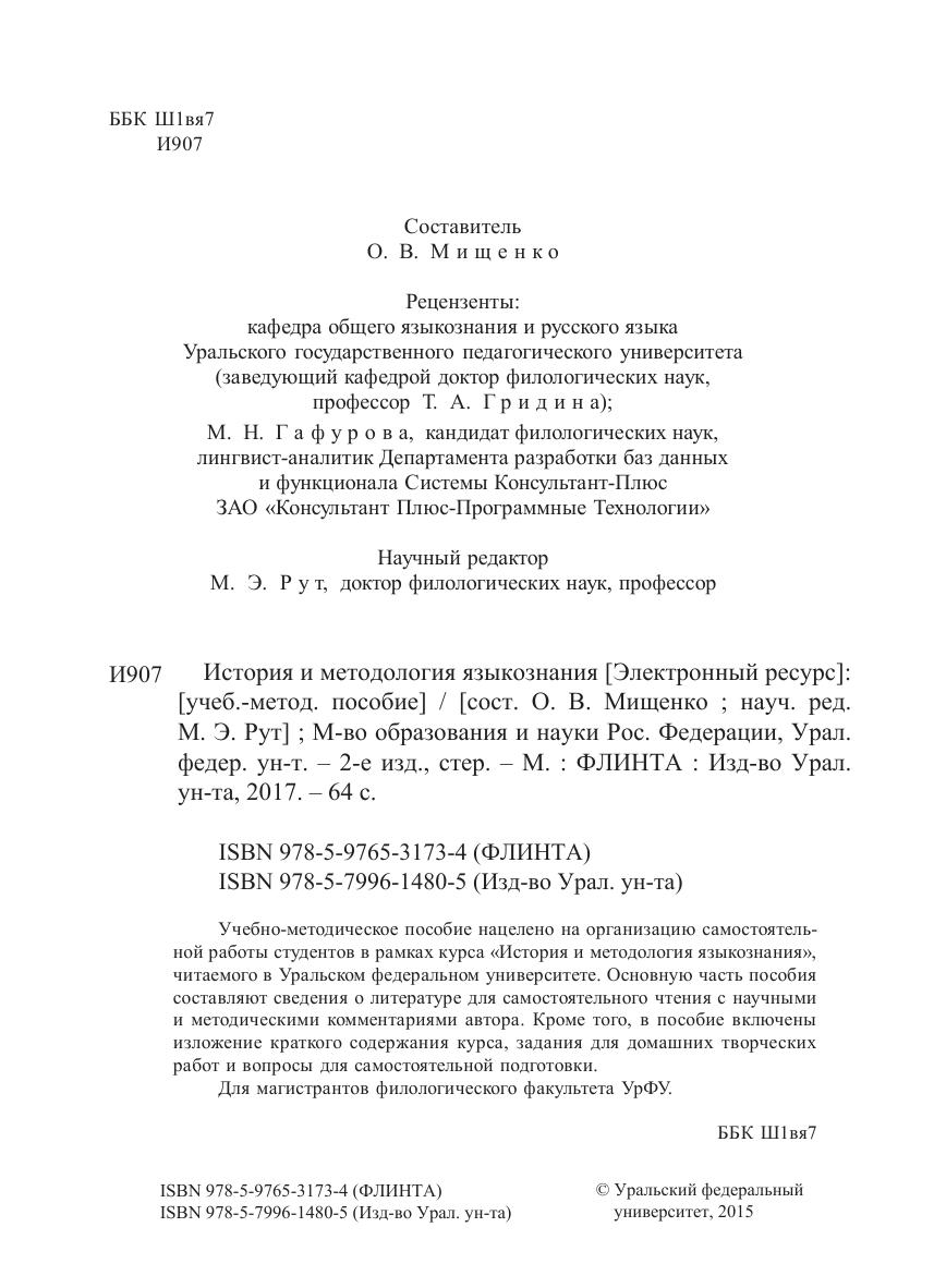 Учебно-методическое пособие нацелено на организацию самостоятельной работы студентов в рамках курса «История и методология языкознания», читаемого в Уральском федеральном университете. Основную часть пособия составляют сведения о литературе для самостоятельного чтения с научными и методическими комментариями автора. Кроме того, в пособие включены изложение краткого содержания курса, задания для домашних творческих работ и вопросы для самостоятельной подготовки. Для магистрантов филологического факультета УрФУ.