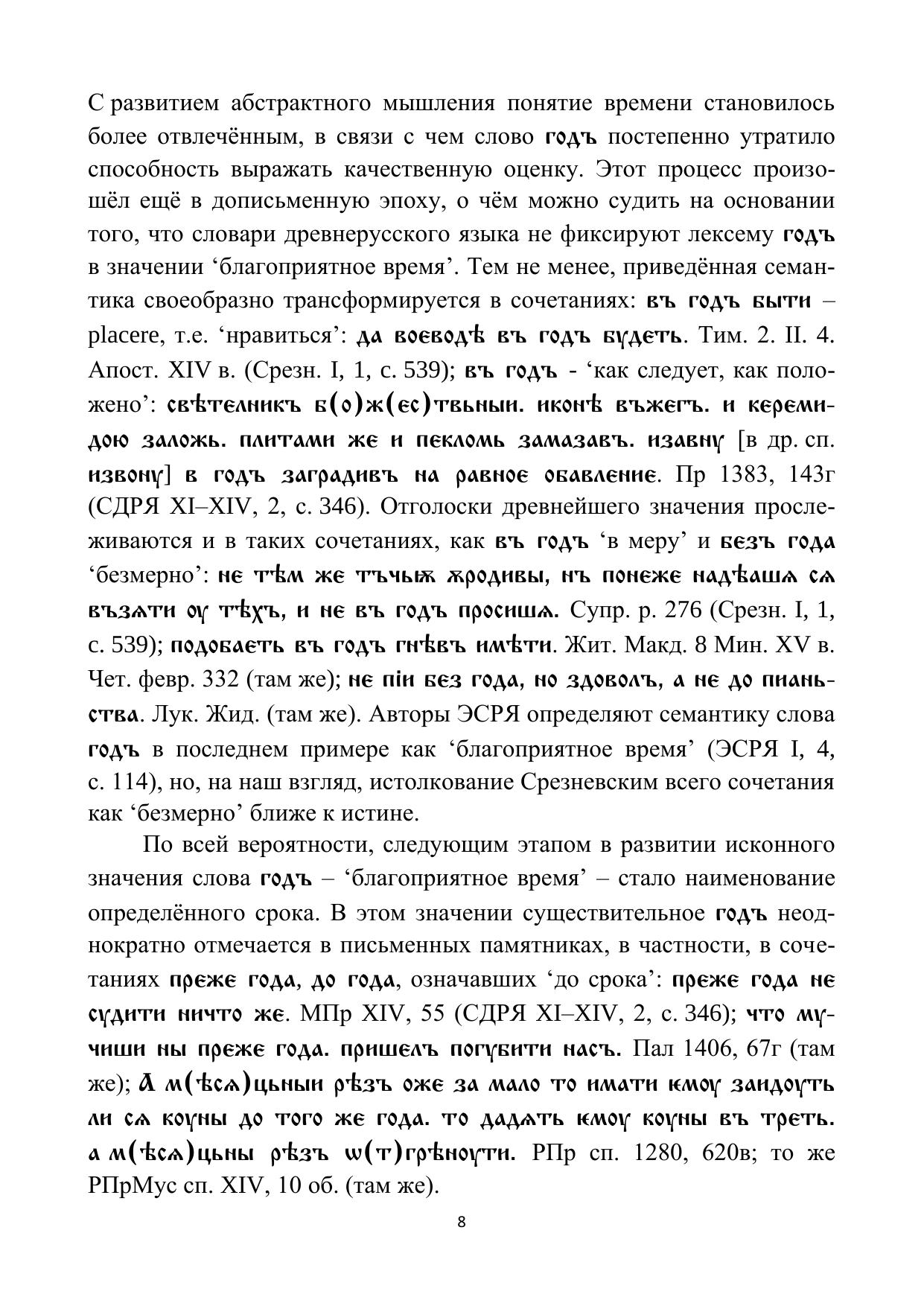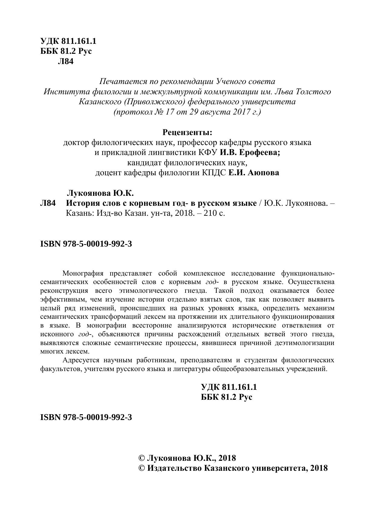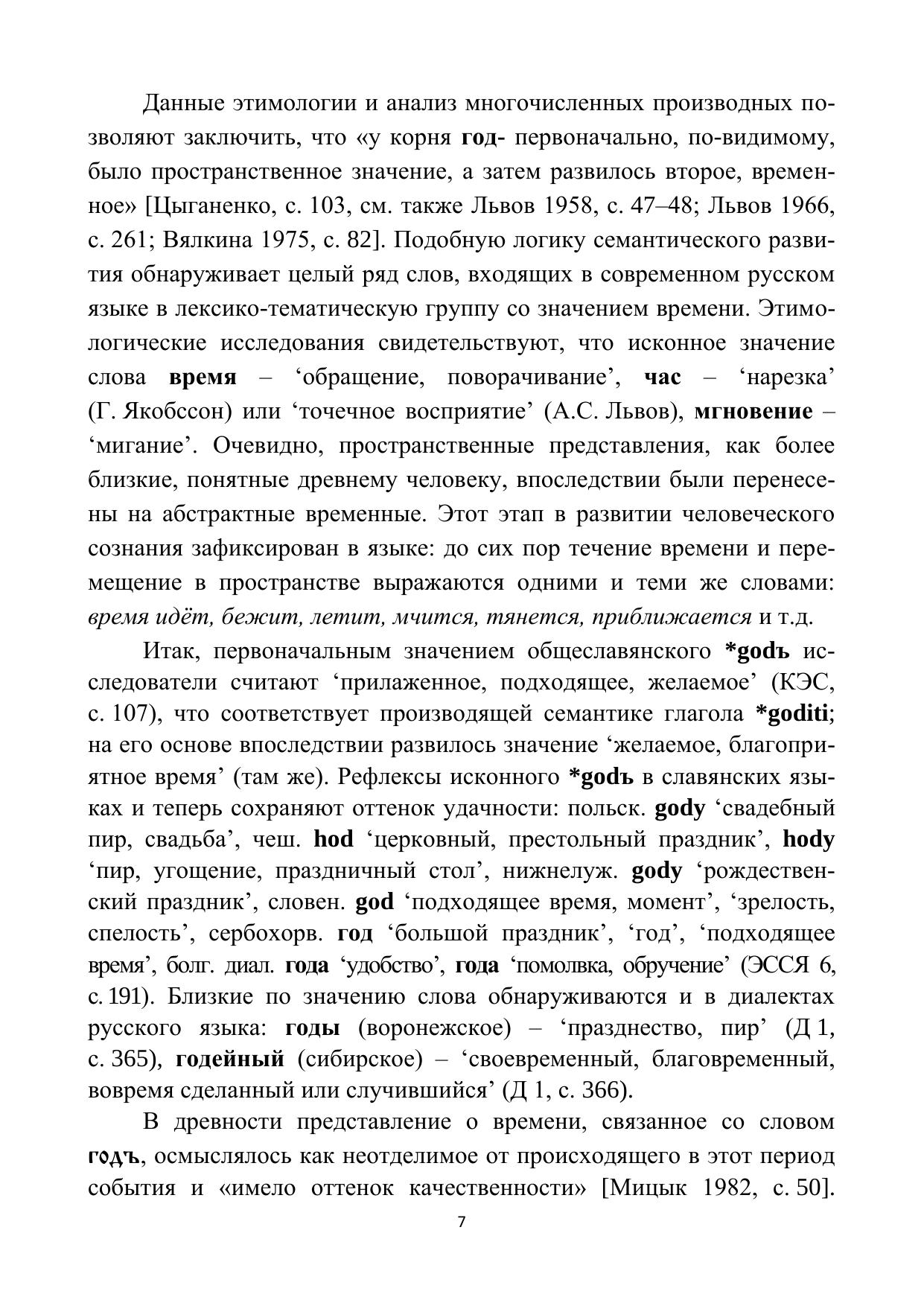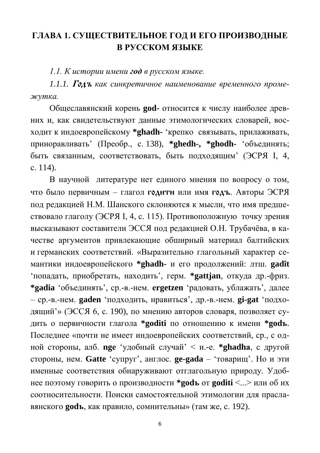 Монография представляет собой комплексное исследование функционально-семантических особенностей слов с корневым год- в русском языке. Осуществлена реконструкция всего этимологического гнезда. Такой подход оказывается более эффективным, чем изучение истории отдельно взятых слов, так как позволяет выявить целый ряд изменений, происшедших на разных уровнях языка, определить механизм семантических трансформаций лексем на протяжении их длительного функционирования в языке. В монографии всесторонне анализируются исторические ответвления от исконного год-, объясняются причины расхождений отдельных ветвей этого гнезда, выявляются сложные семантические процессы, явившиеся причиной деэтимологизации многих лексем.