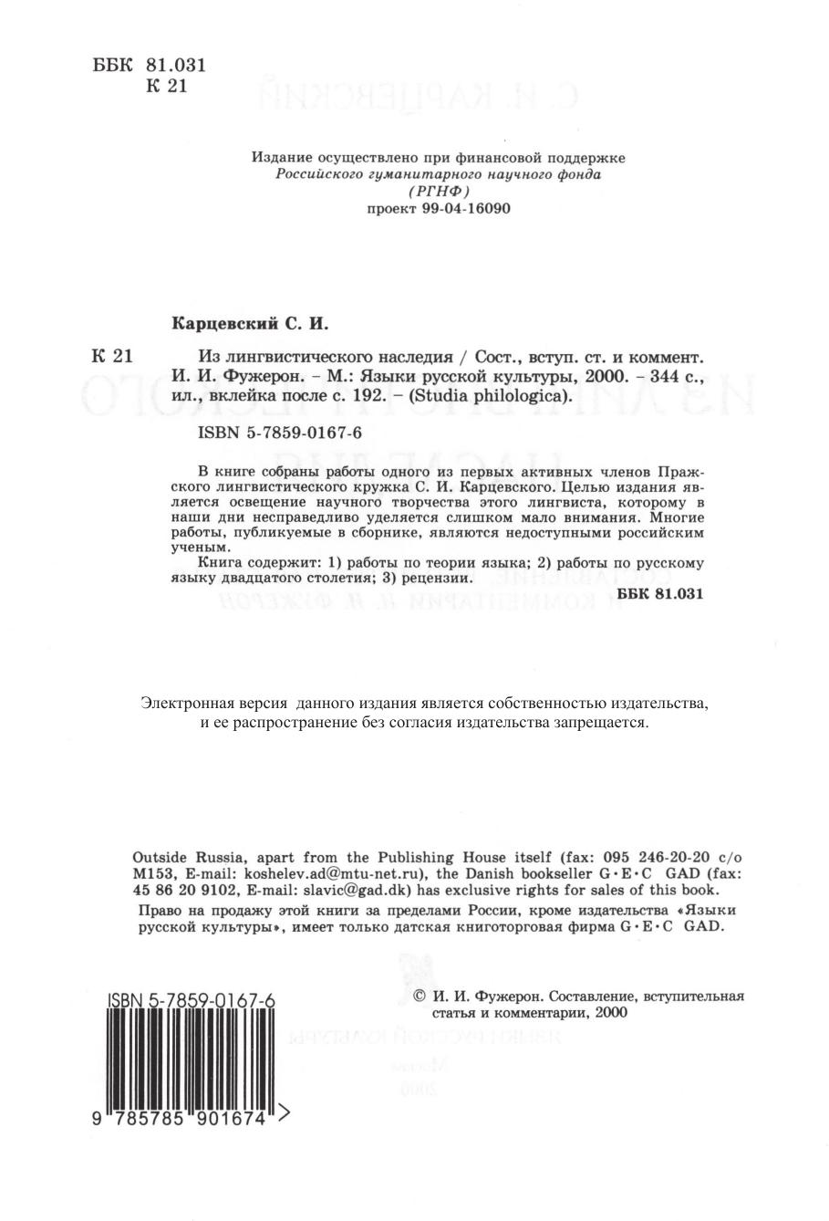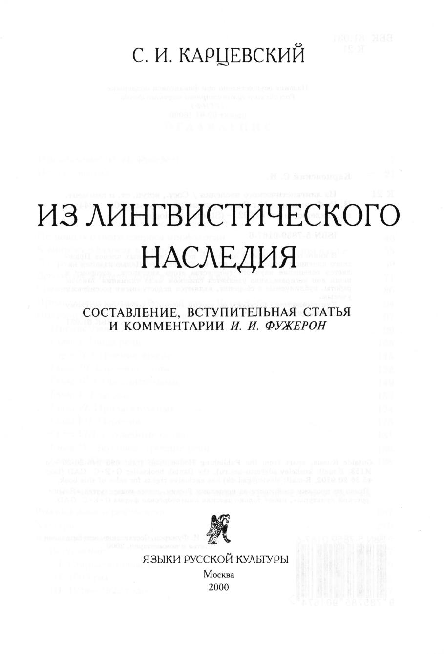 В книге собраны работы одного из первых активных членов Пражского лингвистического кружка С.И. Карцевского. Целью издания является освещение научного творчества этого лингвиста, которому в наши дни несправедливо уделяется слишком мало внимания. Многие работы, публикуемые в сборнике, являются недоступными российским ученым. Книга содержит: 1) работы по теории языка, 2) работы по русскому языку двадцатого столетия, 3) рецензии.