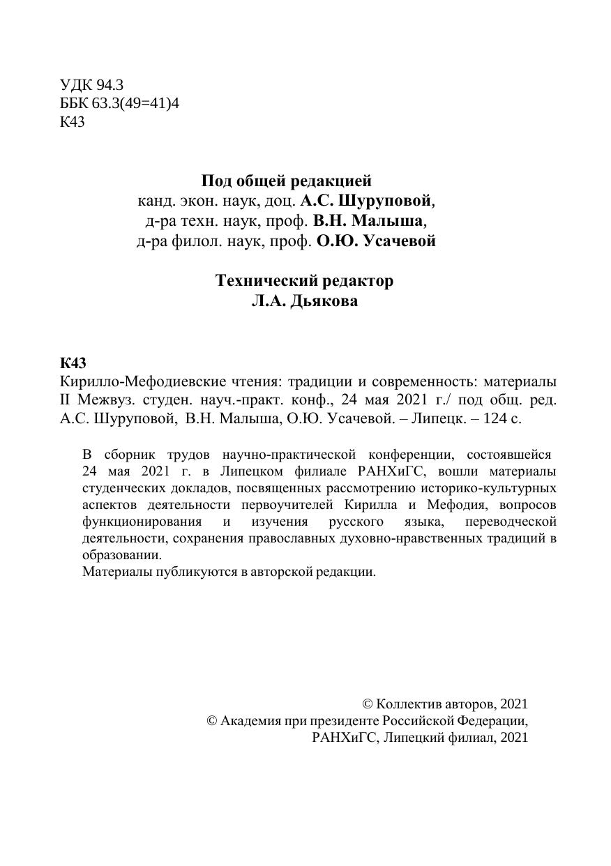 Кирилло-Мефодиевские чтения: традиции и современность: материалы II Межвуз. студен. науч.-практ. конф., 24 мая 2021 г.