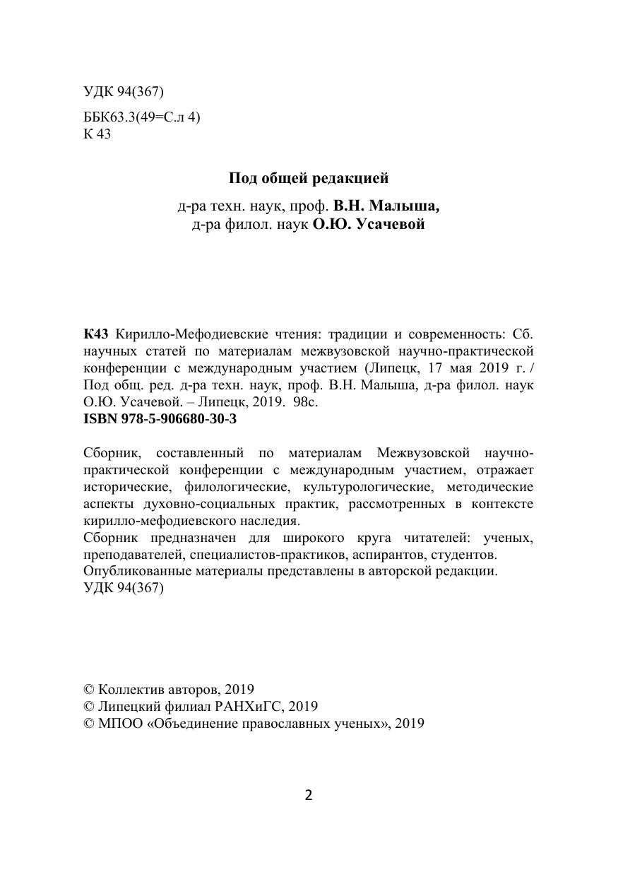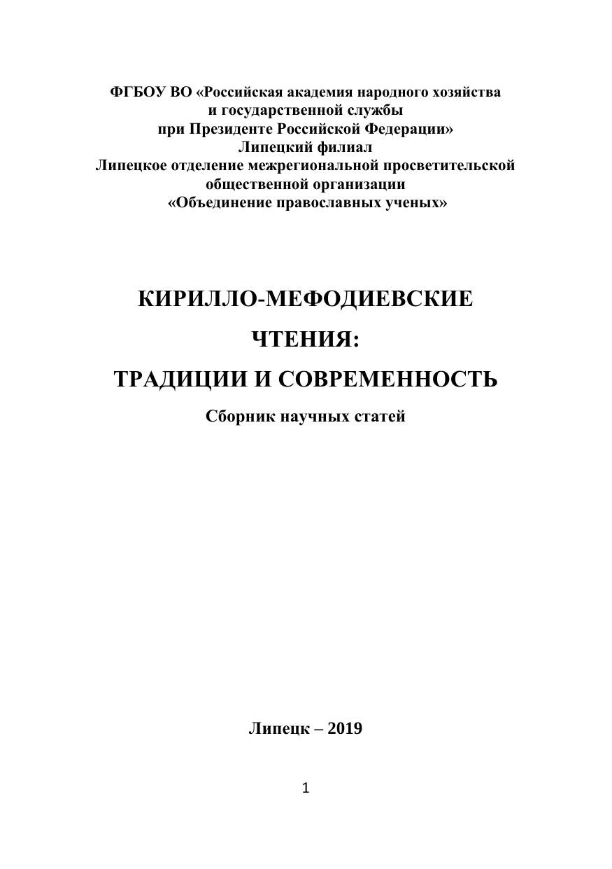 Кирилло-Мефодиевские чтения: традиции и современность: Сборник научных статей по материалам межвузовской научно-практической конференции с международным участием (Липецк, 17 мая 2019 г.