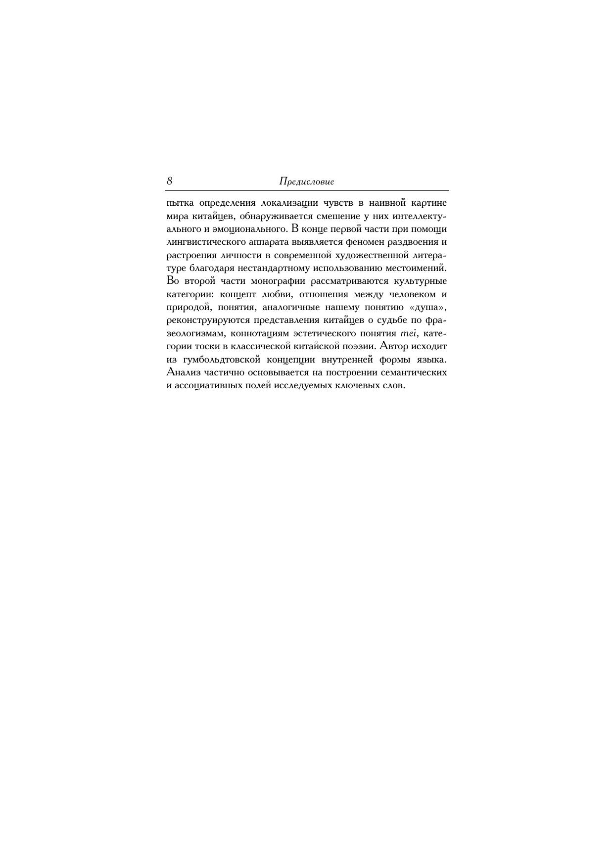 Книга ведущего специалиста по филологии и культурологии Китая, доктора филологических наук, профессора МГУ Тань Аошуан посвящена этнокультурному осмыслению мира, которое человек получает вместе с родным языком и культурными традициями. Это свой способ видения мира, картина мира. Близость картин мира определяется сходством традиций, обусловленным общностью культуры и исторического опыта народов. Это позволяет говорить о существовании внутренней семантической типологии, характеризующей способы концептуализации мира. Первая часть книги посвящена китайской модели мира – пространству, времени, семантике размера, значимости чисел в концептуализации мира китайцами. В частности, определяется локализация чувств в наивной картине мира китайцев, вскрывается смешение у них интеллектуального и эмоционального. Здесь также рассматриваются эстетические идеалы конфуцианцев, связанные с идеями Срединного пути. Во второй части книги рассматриваются культурные категории: концепты любви, отношений между человеком и природой, понятиям аналогичным нашему понятию «душа», категории «тоски», проявляющейся как в обыденной жизни, так и в классической китайской поэзии, различным осмыслениям ключевого иероглифа mei, означающего эстетическое понятие «красивый, прекрасный». Анализ частично основывается на построении семантико-ассоциативных полей исследуемых ключевых слов. Книга уделяет особое внимание сопоставлению китайской картины мира с русской и среднеевропейской. Она снабжена большим иллюстративным материалом и будет интересна самому широкому кругу читателей.