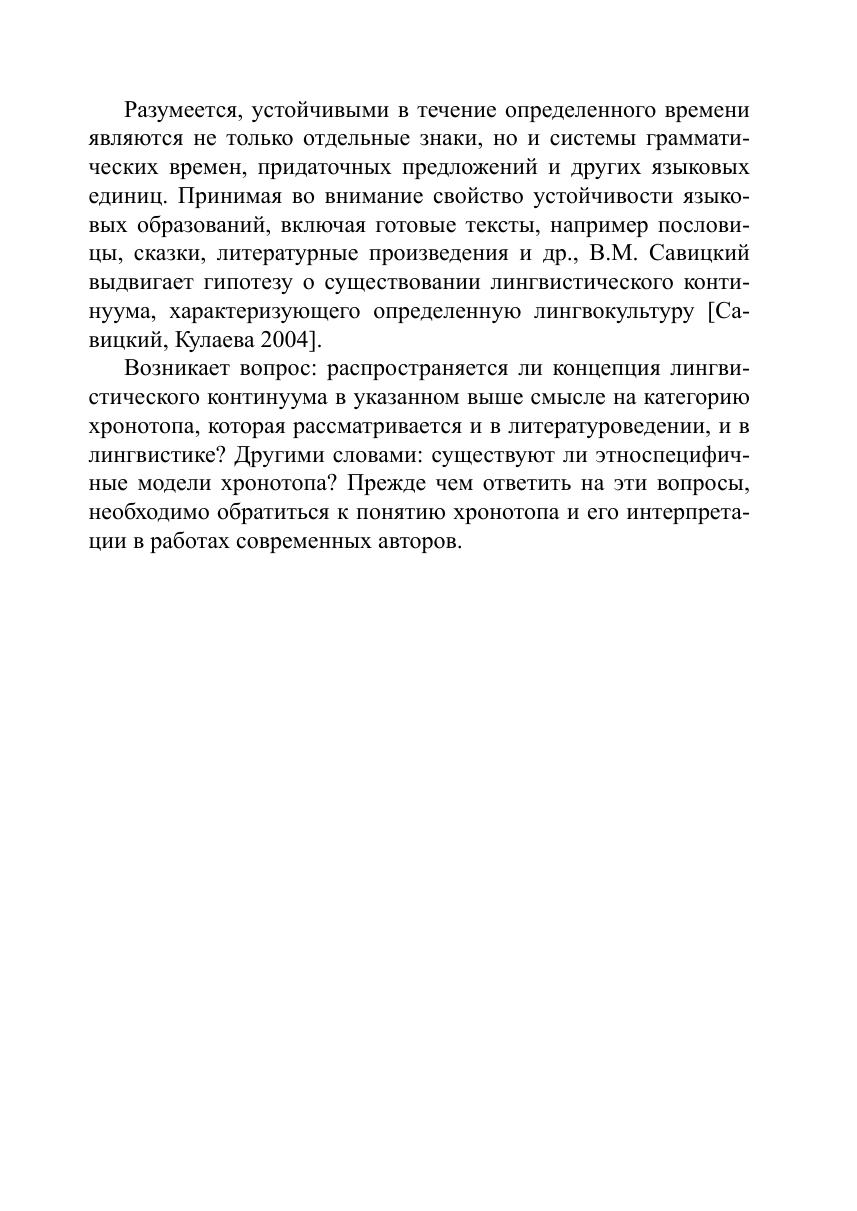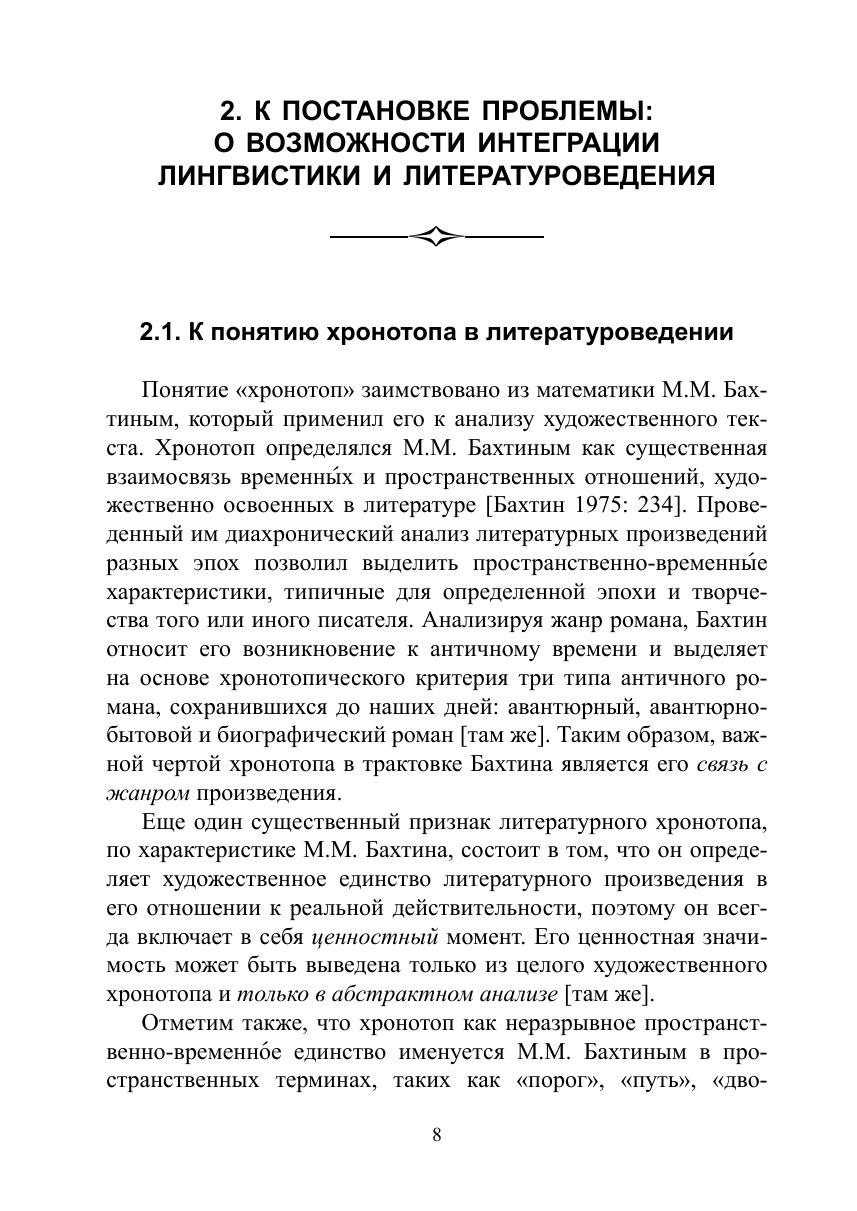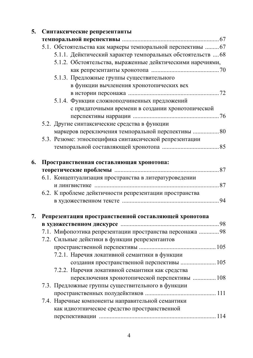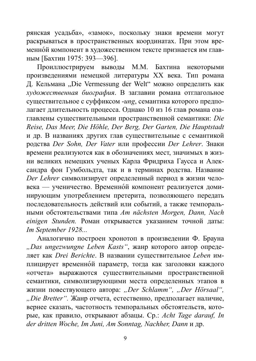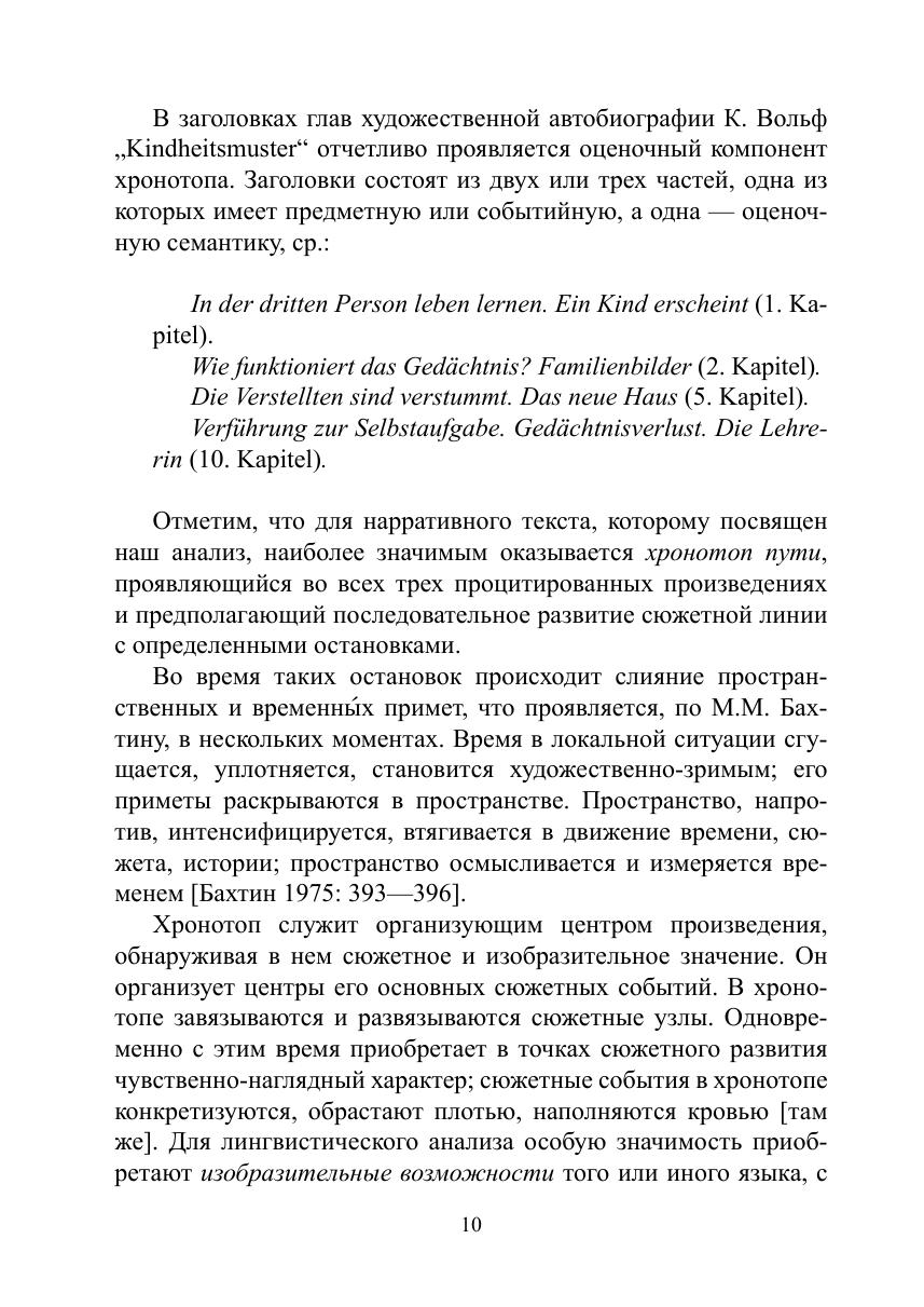 Монография представляет попытку сближения лингвистических и литературоведческих категорий. На материале немецких художественных текстов рассматривается концептуализация лингвистическими средствами литературоведческого понятия «хронотоп». Языковые репрезентанты хронотопа (средства выражения времени и пространства) систематизируются с позиции нарратора, определяющего их дейктический статус. Разграничиваются пространственно-временные перспективы развития сюжета и оценочная перспектива субъекта речи. Показывается языковая специфика выражения време-ни и пространства в немецкой лингвокультуре.