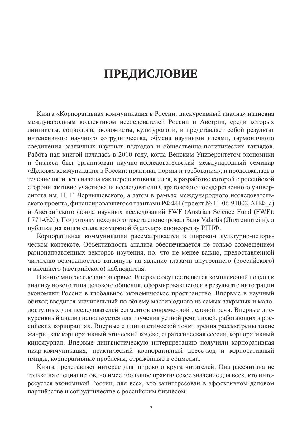 Книга, написанная международным коллективом учёных Австрии и России, посвящена одной из самых закрытых и малодоступных для исследования областей современного делового дискурса — корпоративной коммуникации. Комплексность подхода к этому сложному явлению обеспечена совмещением методик российских и зарубежных научных школ, кооперацией широкого социокультурного и экономического контекста с лингвистическим взглядом на коммуникативную реальность российского корпоративного менеджмента. Дискурсивный анализ объёмного массива устной речи людей, работающих в российских компаниях Волгограда, Казани, Екатеринбурга, Челябинска, Ростова-на-Дону, Саратова, Москвы дополнен исследованием корпоративных этических кодексов, киножурналов, деловой переписки, официальных веб-сайтов, дресс-кодов российских компаний. Рассматриваются также национальная идентичность рекламы, национальная специфика руководства, неформальное корпоративное общение, методы формирования корпоративного имиджа. Книга представляет интерес не только для широкого круга специалистов — лингвистов, экономистов, социологов, но имеет огромное значение для всех тех, кто заинтересован в развитии бизнеса с Россией.